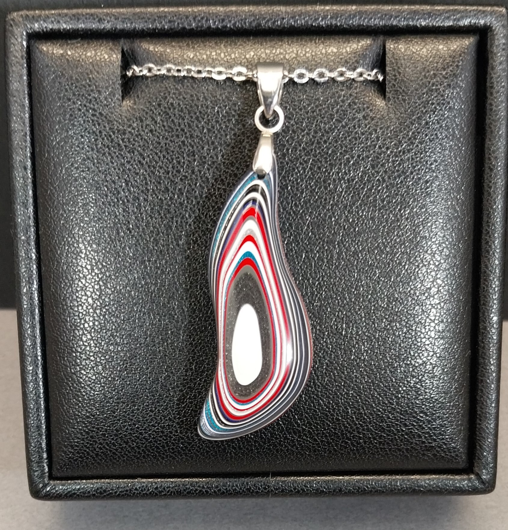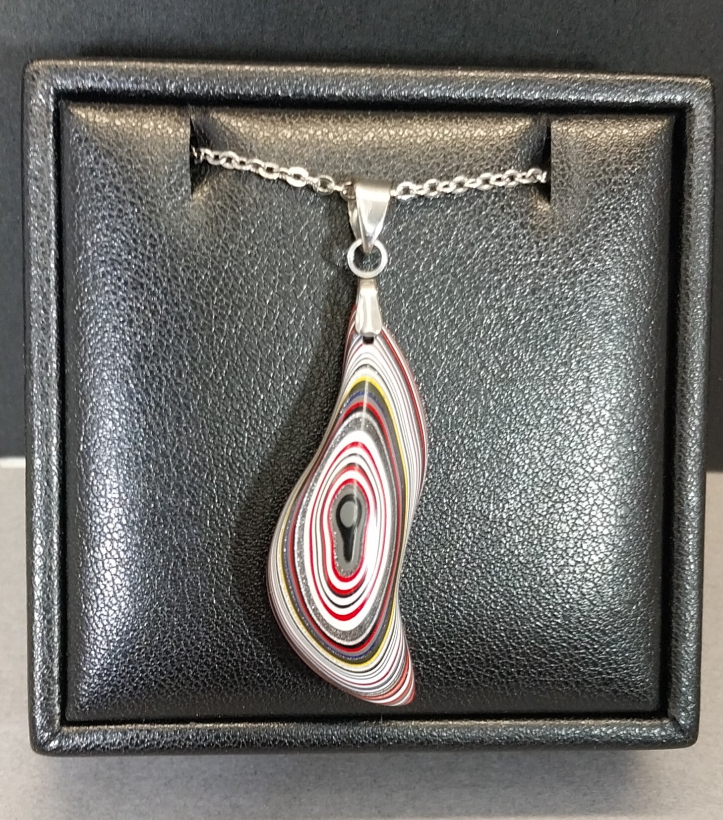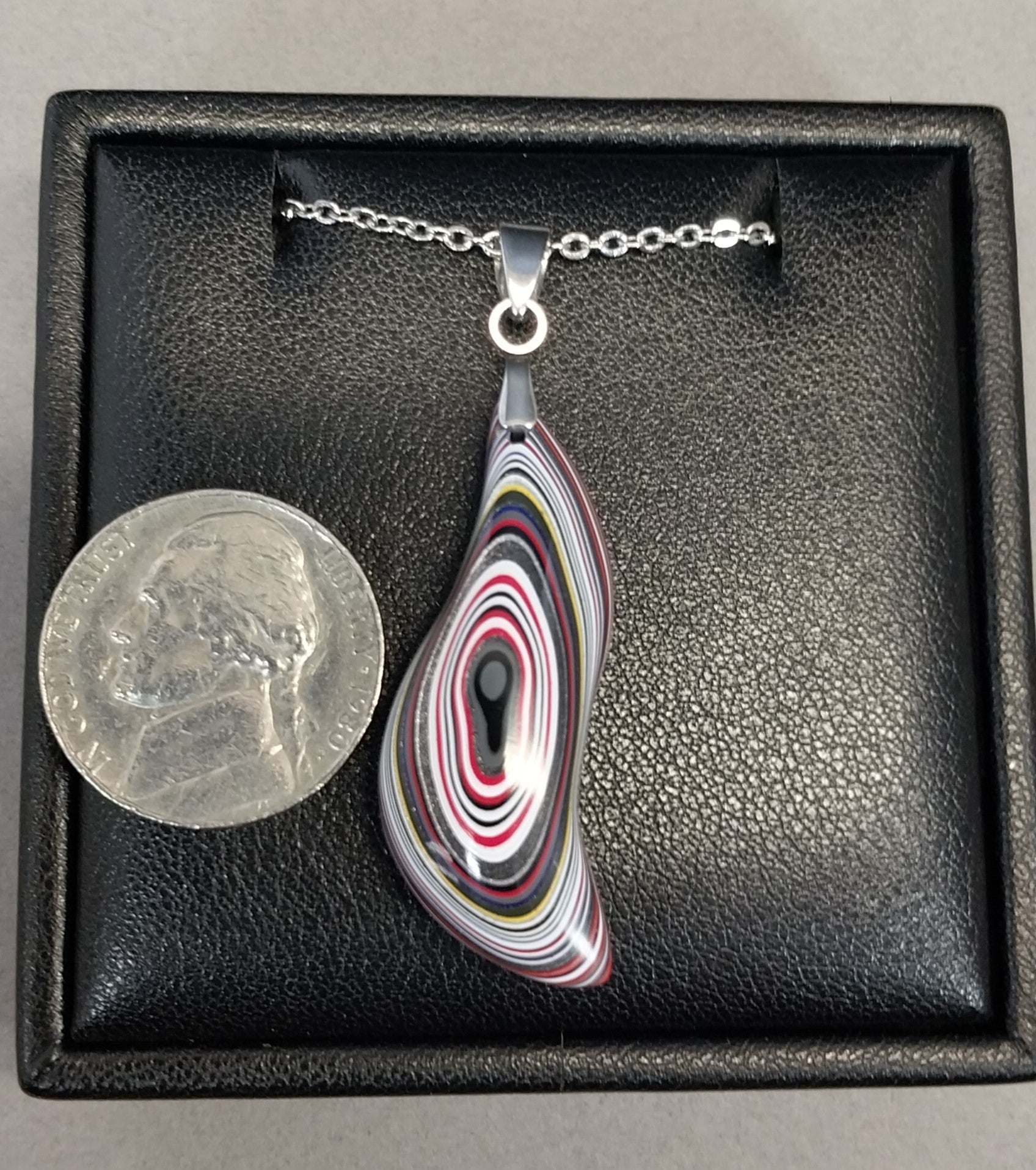 This colorful fordite necklace is in a unique shape that anyone can wear. The bail and included chain are worry free stainless steel. The paint layers in this piece are very colorful and have nice layering. This piece is made from up-cycled fordite from Ohio that occurred as a result of painting parts for freight liner semi trucks. This is a reversible piece. The pictures show each side. Necklace length is 20 inches. The fordite is about 36 mm tall. Pictured necklace holder is not included. This will ship in a jewelry box.