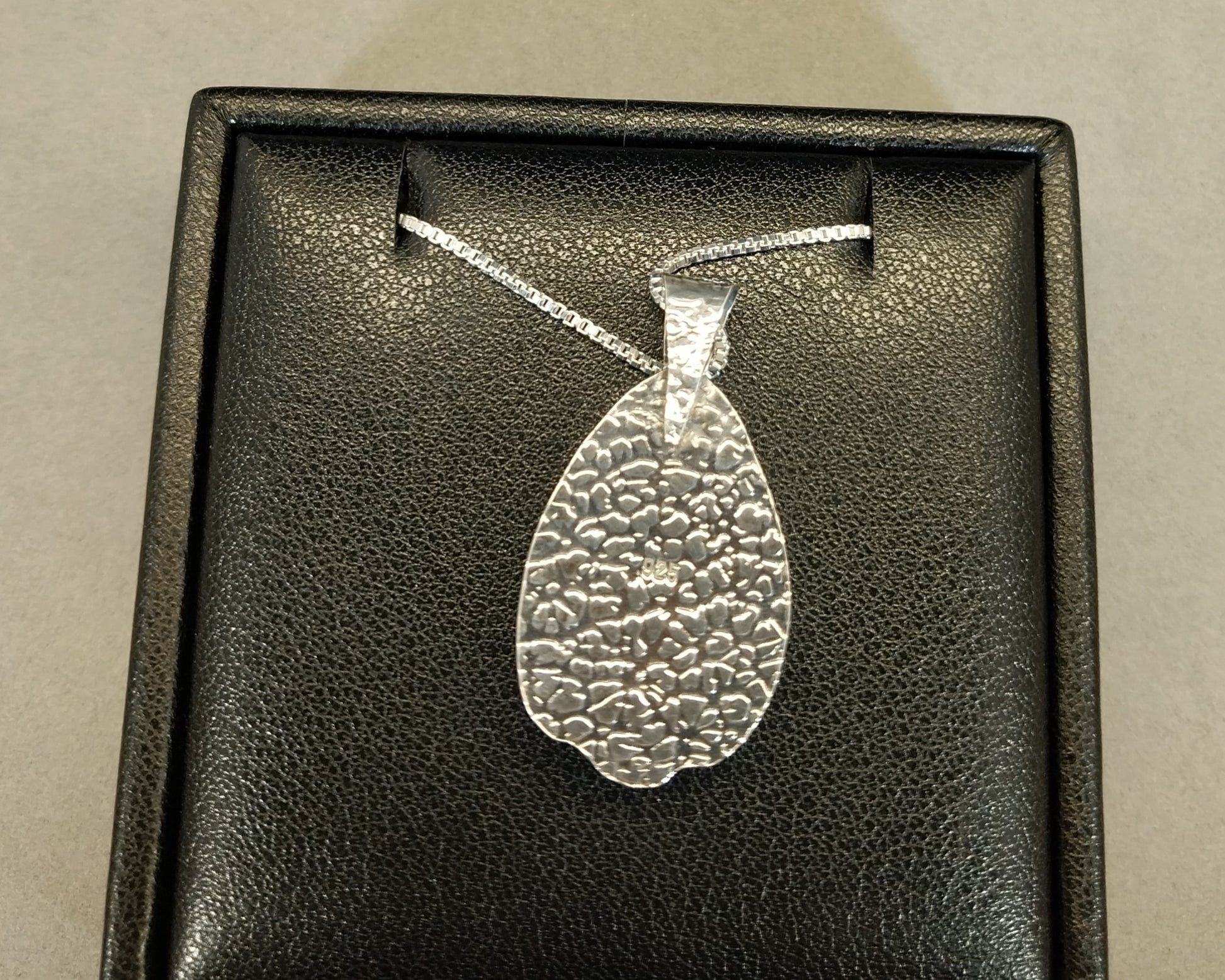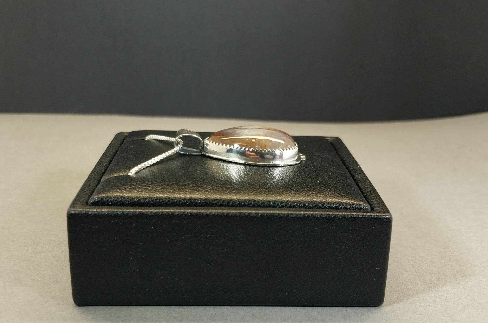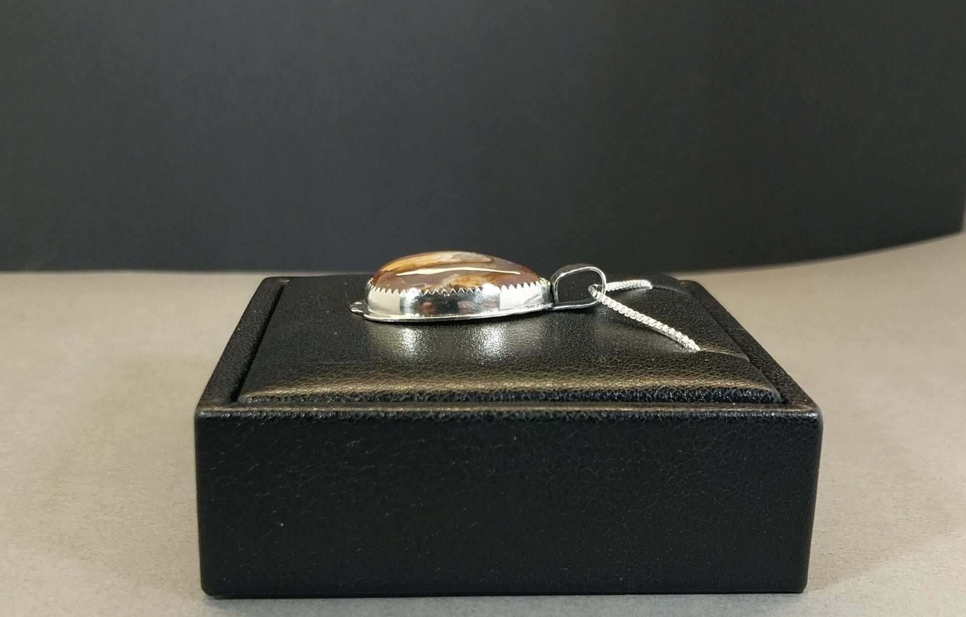 This is an exceptional dinosaur coprolite silver necklace. Coprolite is fossilized poop. It went through a similar process of fossilization as you see in dino gem bone where all of the organic material was turned to stone over thousands of years. I've cut lots of coprolite and this is the best stone I've cut thus far. It's a difficult stone to get perfection from because it's typically heavily fractured but that's not the case with this one. It also has a really unique tube feature that I was able to capture while shaping the dome of this teardrop. This stone is mostly shades of brown but also has white and a bit of orange. I made the silver setting primarily with my hand forged and formed recycled sterling silver. I textured the back of the piece as well as the bail I made for it. The pendant is about 1.22 inches tall overall. The solid sterling silver chain is 20 inches in length.