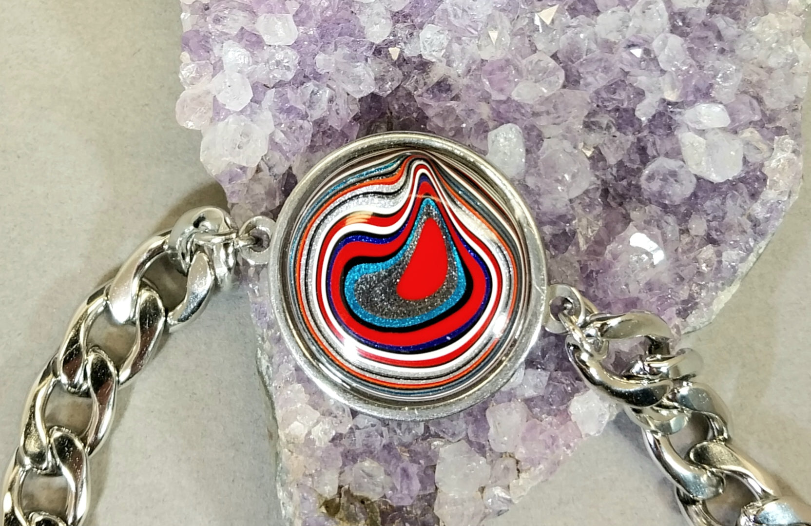 Fordite is recycled automotive paint sourced from automotive factories as well as manufacturers who paint parts for new vehicles. It forms in thin layers as car parts are painted on the racks that hold them in place. After hundreds of trips through the booth where the paint is sprayed and then baked the excess buildup is scraped off the racks. We buy this waste paint in rough chunks and recycle it into beautiful jewelry. It can take hundreds of layers of paint to make a one inch thick piece of fordite. The original fordite came from Detroit and since then it’s also synonymously known as Detroit Agate. There is very little fordite that is truly vintage. Most that’s available is modern i.e. current or within the past 15 years. We prefer modern fordite as it’s water rather than lead based paint. There are many different fordite types and some are more valuable than others. You’ll find in our fordite listings we refer to the plant location that the fordite originated from rather than listing specific auto manufacturers or vehicles.You can easily google the plant location and get a list of vehicles painted there or just ask us. We love to talk fordite so if you are looking for a specific type or color odds are we have it, please send us a message. All of our fordite is authentic.