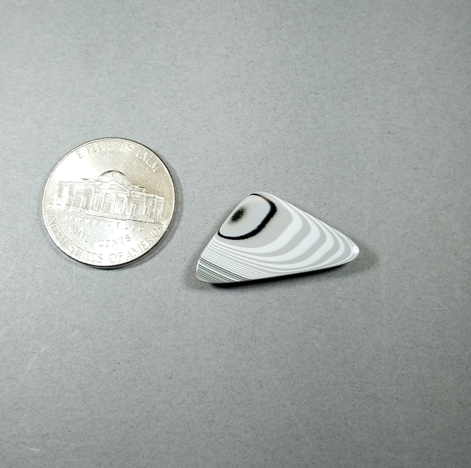 The main picture is enlarged to show details. See the other pictures for scale next to a nickel and see below for detailed measurements. This fordite cabochon would make a great piece of jewelry. It's in a top domed triangle with a flat back. All sides are polished. It's from painting the transit line in Claycomo Missouri off Hwy 69 ie Ford-ite.