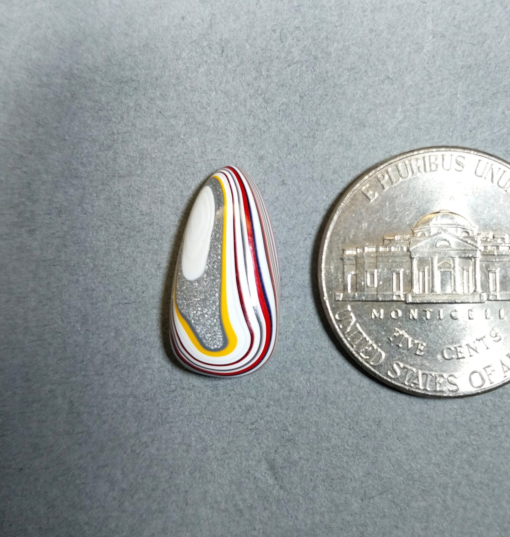 The main picture is enlarged to show detail. See the other pictures for scale and below for detailed measurements. This cabochon is made from freightliner fordite from Ohio. It has some nice colors along with white which is typical for this fordite type. This is a small top domed teardrop with a flat back. All sides are polished. This cab measures about: .71 H x .37 W x .16 Thickness in inches or 18 x 9.4 x 4.3 in mm.