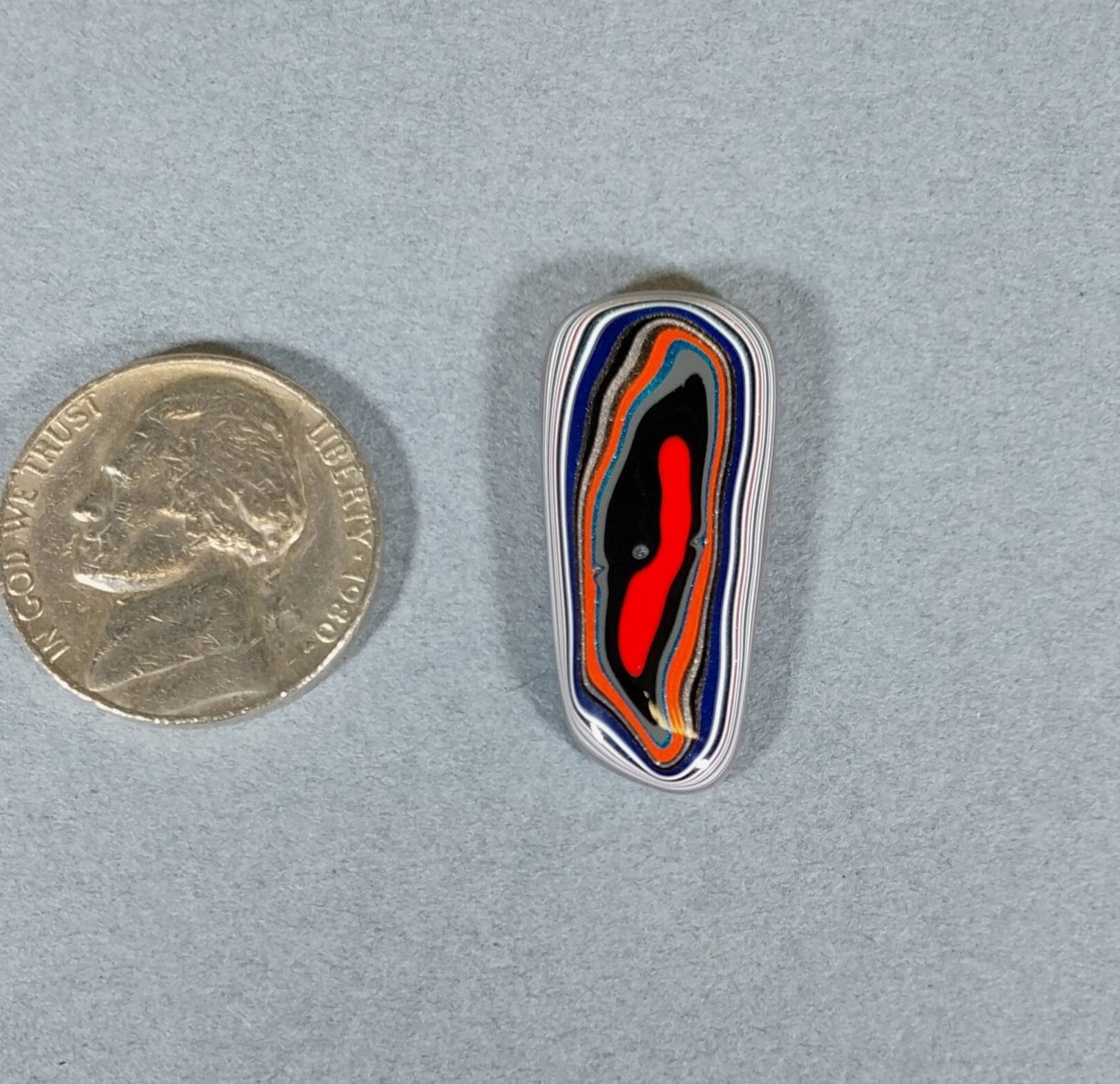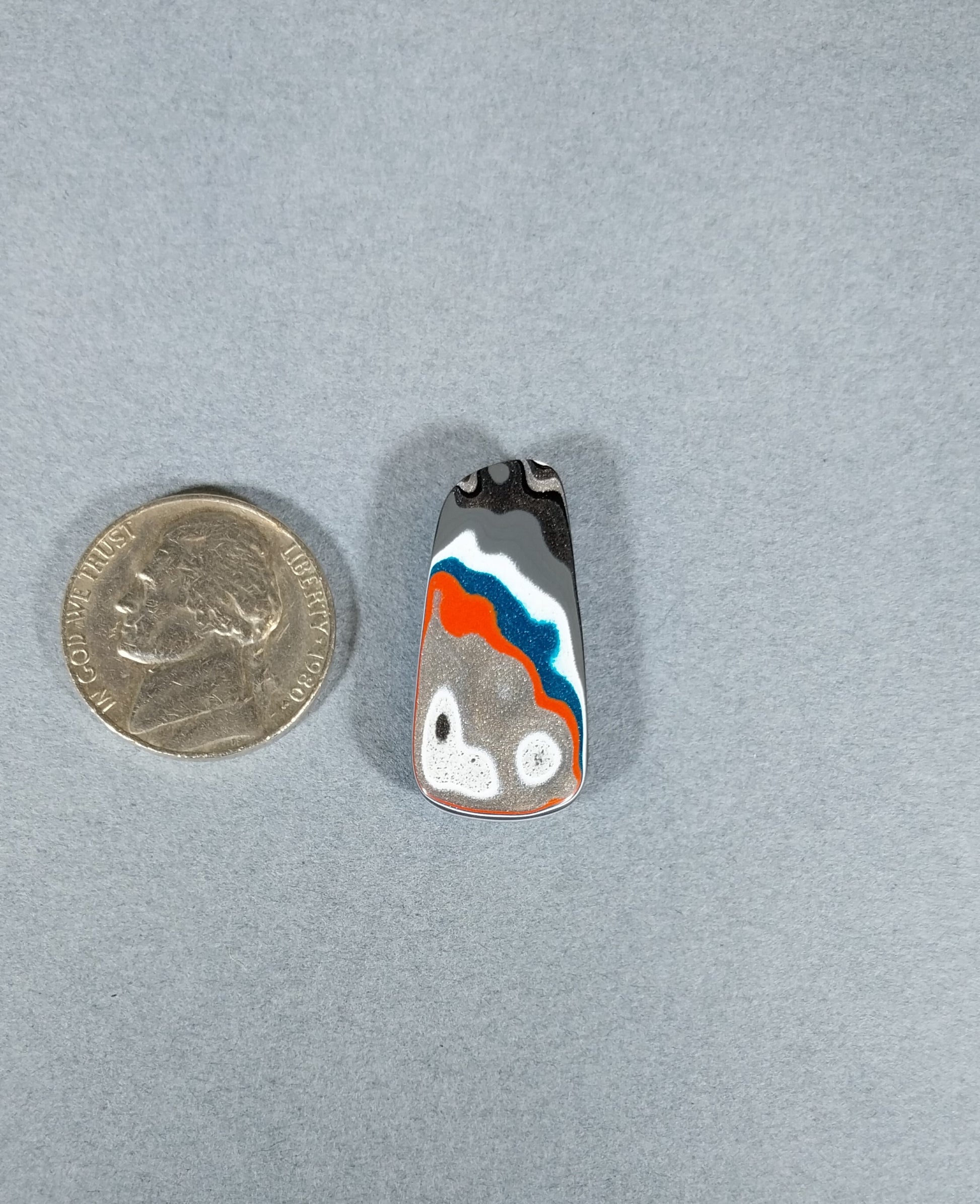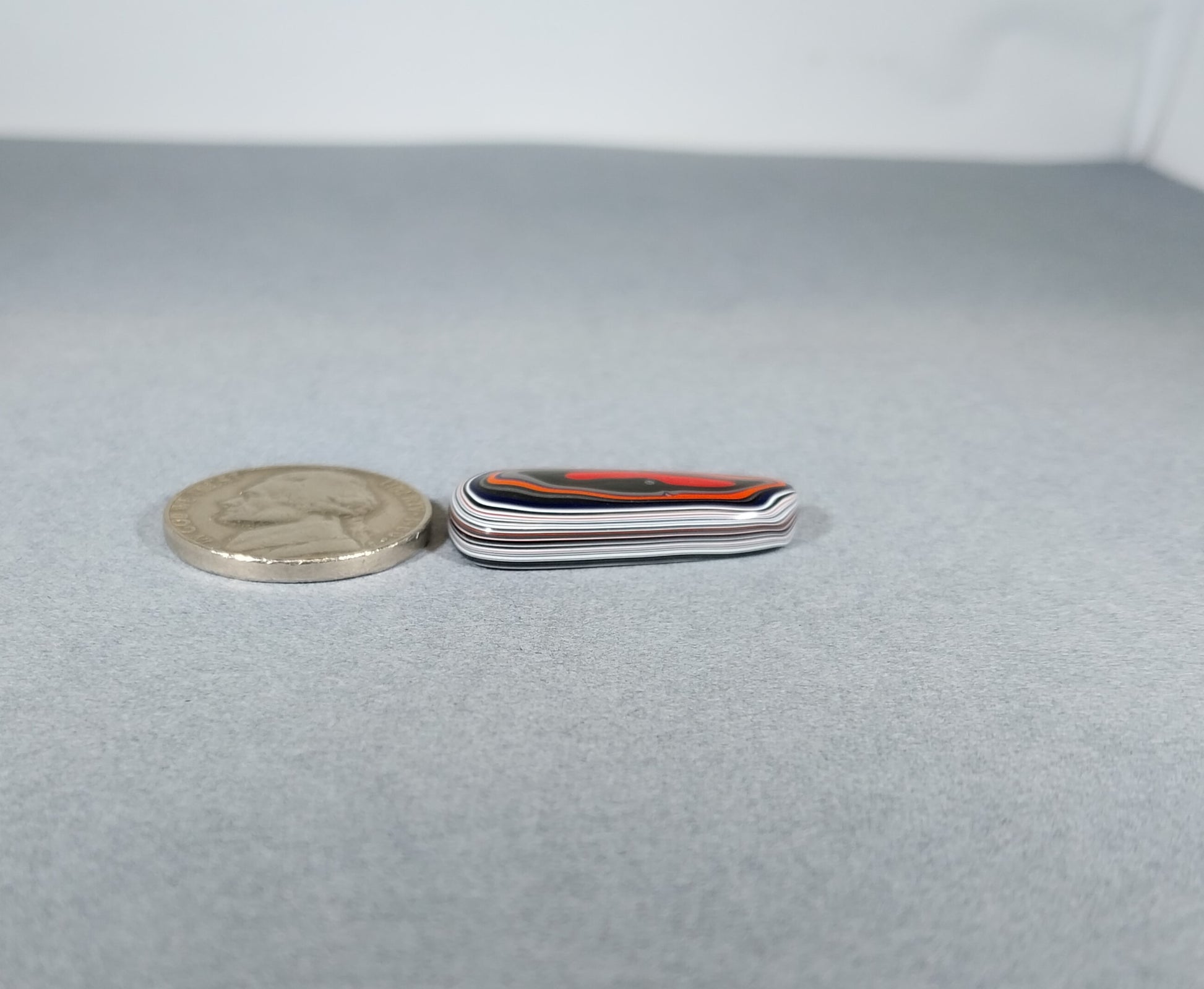 The main picture is enlarged to show detail. See the other pictures for scale and below for detailed measurements. This fordite cabochon is cut in a lightly top domed shield with a flat back. This is fordite from the Parkway Toledo Ohio plant. It measures: 1.11 x .52 x .18in inches or 28 x 13 x 4.7 in mm.