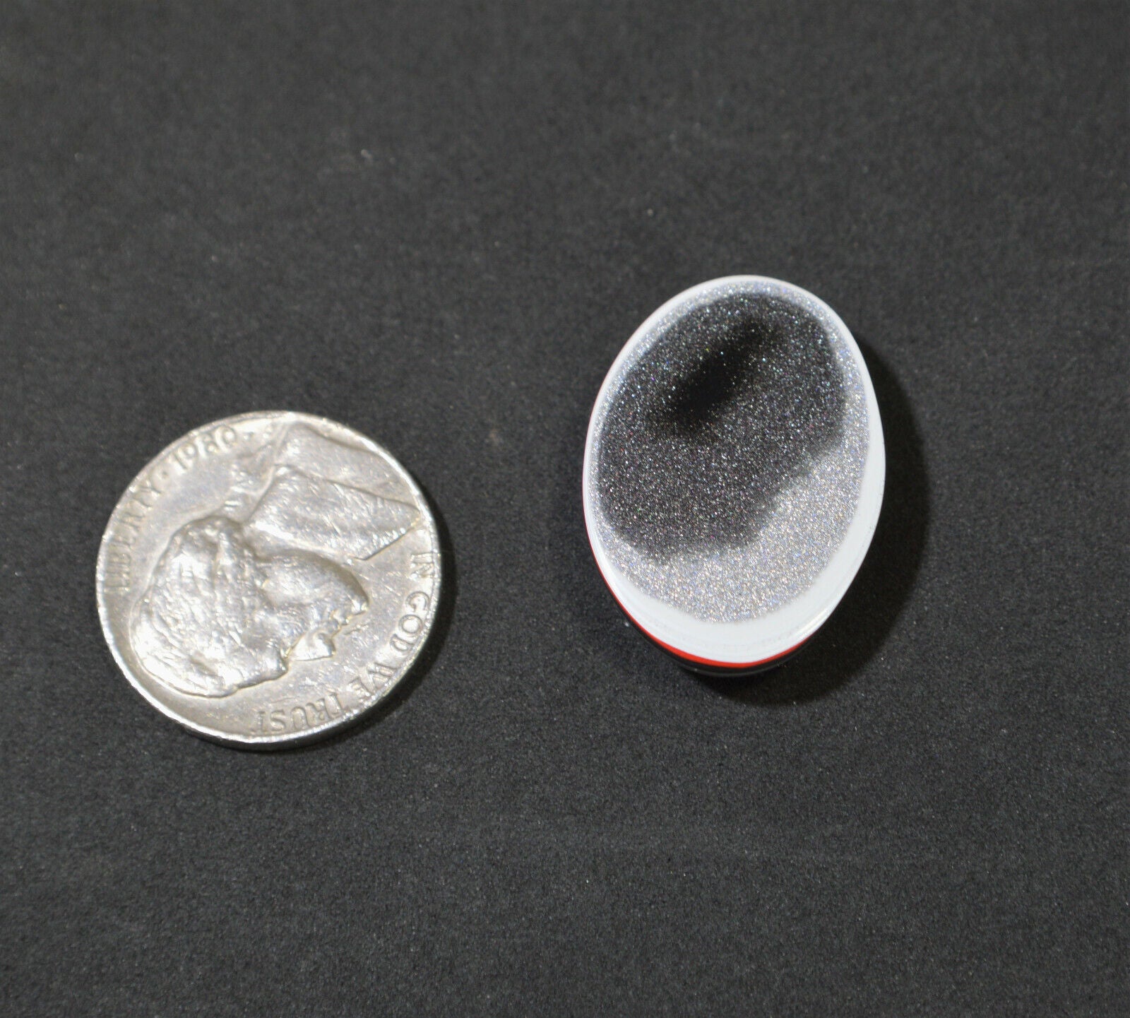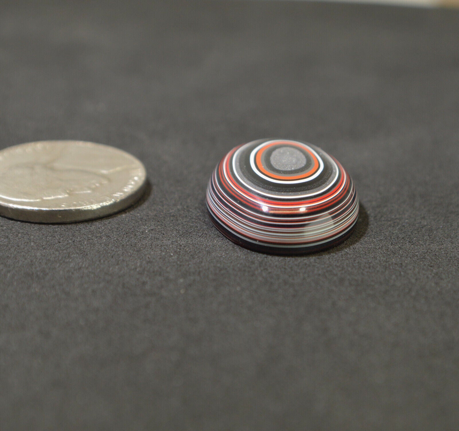 The main picture is enlarged to show detail. See the other pictures for scale and below for detailed measurements. This fordite cabochon is made from from fordite that occurred at the Toledo Ohio plant. It measures: .97 H x .7 W x .26 Thickness in inches or 24 x 18 x 6.5 mm. This has a nice agate like pattern and great color!