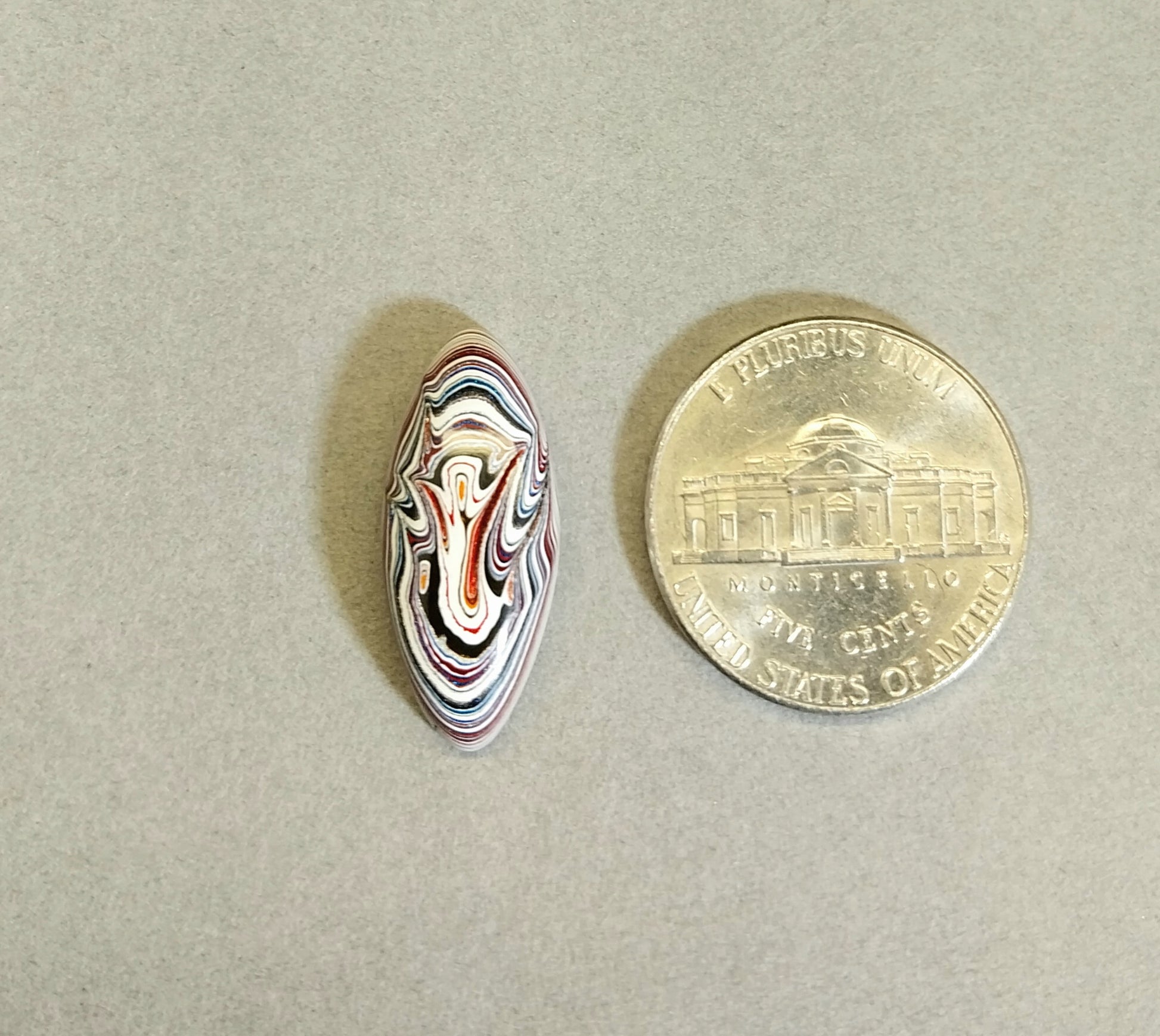 The main picture of this fordite cabochon is enlarged to show detail. See the other pictures for scale and below for detailed measurements. This small marquis shaped cabochon is cut from Ohio motor agate freight-liner type. It has great color and patterns. This cab is cut from a bubbly piece of fordite so it has light grooves on it's surface. It's stable and ready to be set in jewelry. All sides are polished.