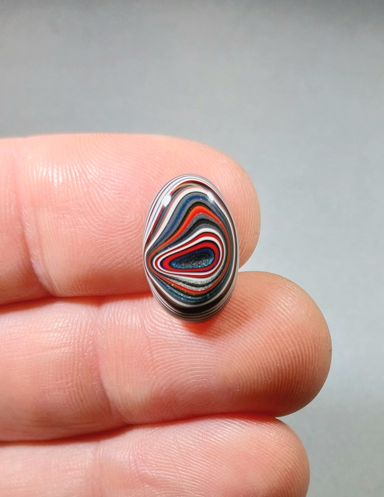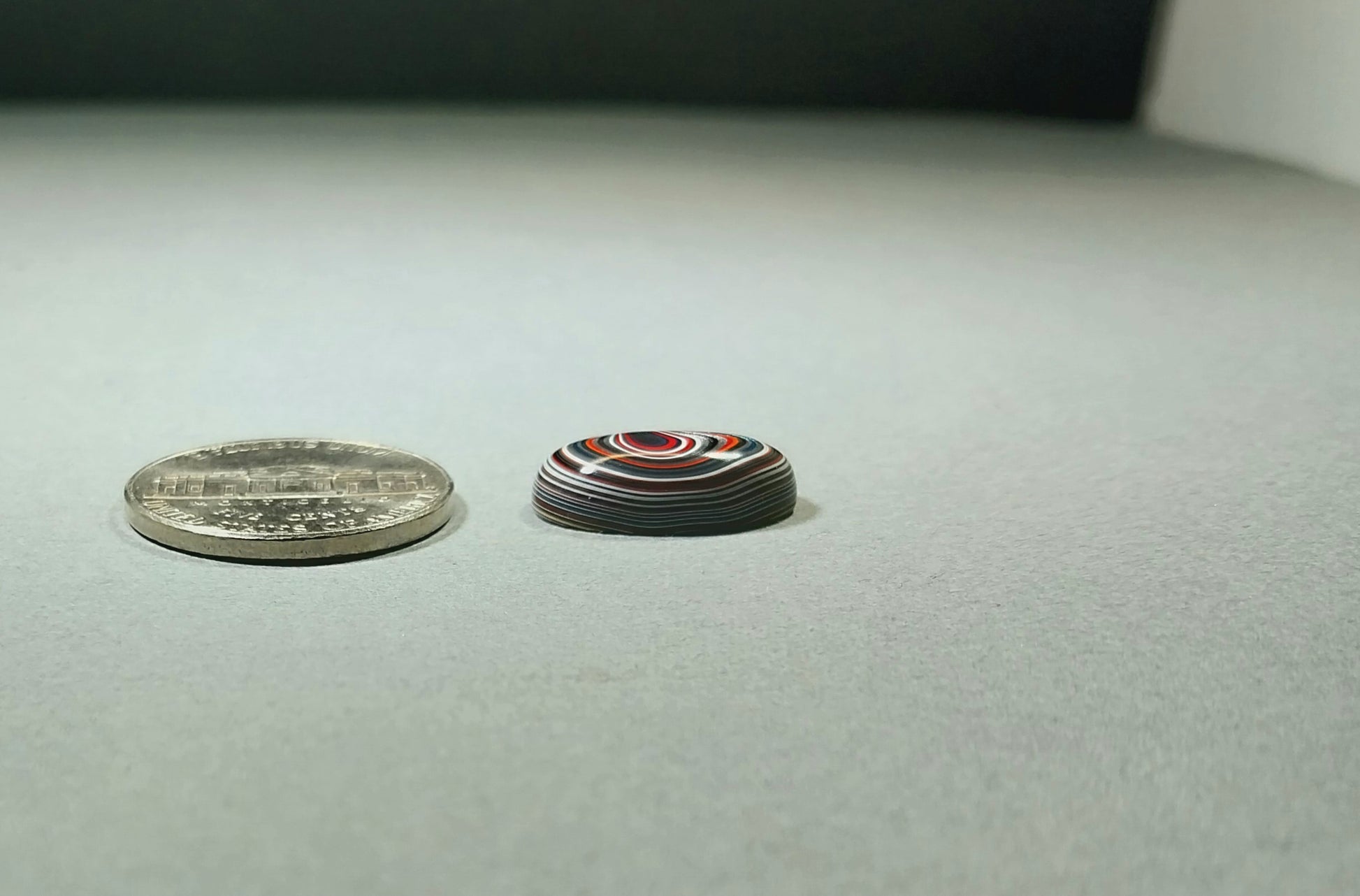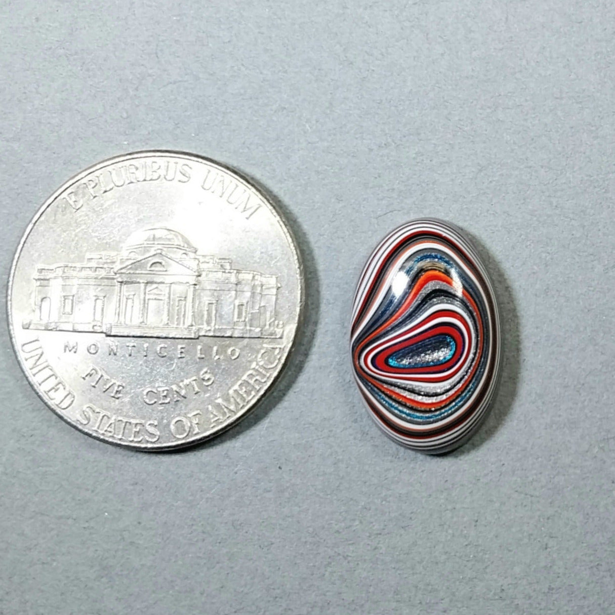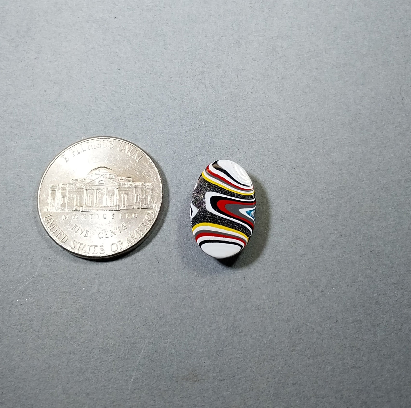 The main picture of this fordite cabochon is enlarged to show detail. See the other pictures for scale and below for detailed measurements. This cabochon has beautiful colors in the layers and a really nice pattern. It's in a top domed oval with a flat back. All sides are polished. This is modern fordite from the plant at Parkway in Toledo Ohio.