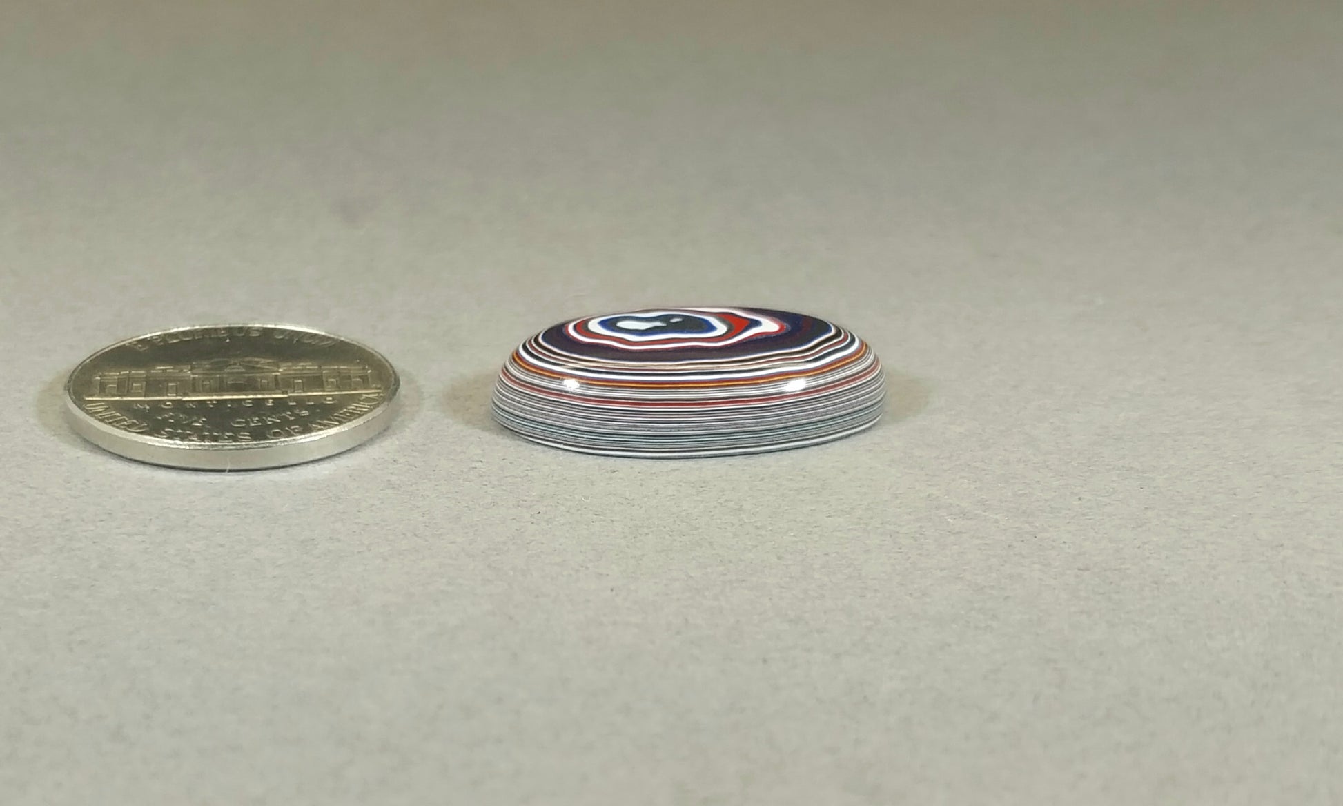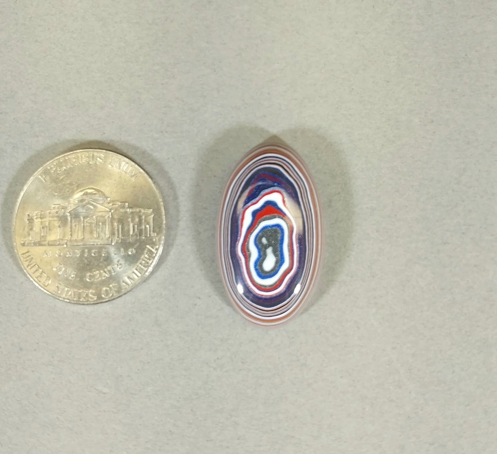 The main picture is enlarged to show detail. See the other pictures for scale and below for detailed measurements. This domed oval cabochon is made from Chillecothe Ohio fordite from the painting of freight-liners. All sides are polished. This is a premium oval that will make a beautiful finished piece.