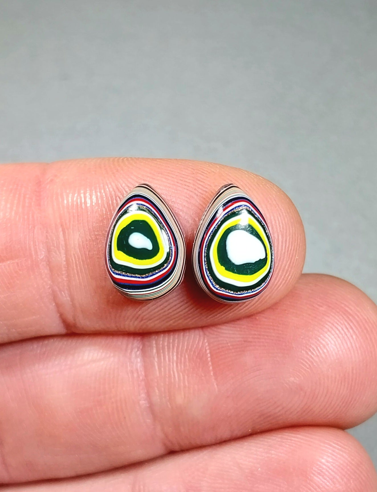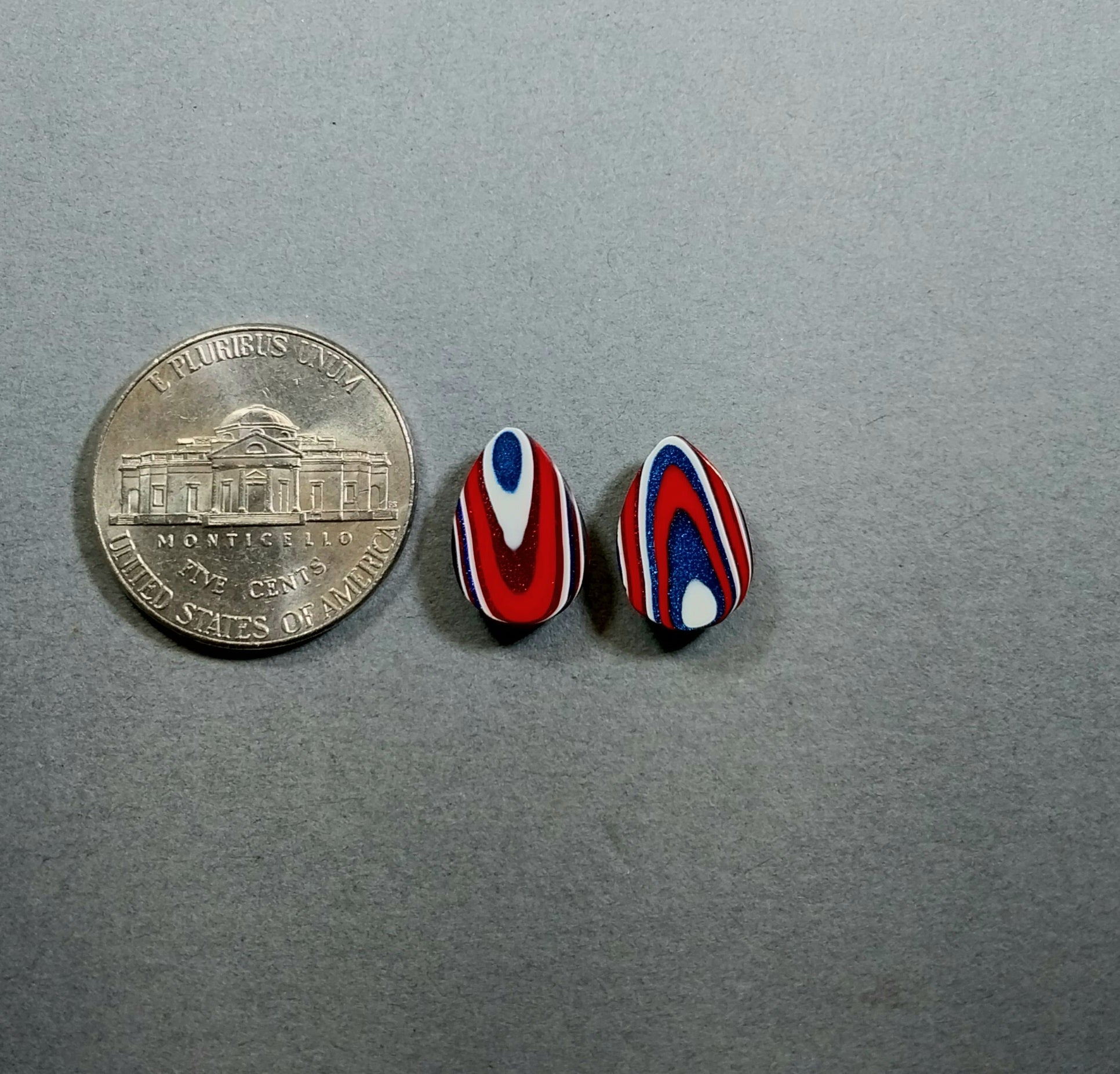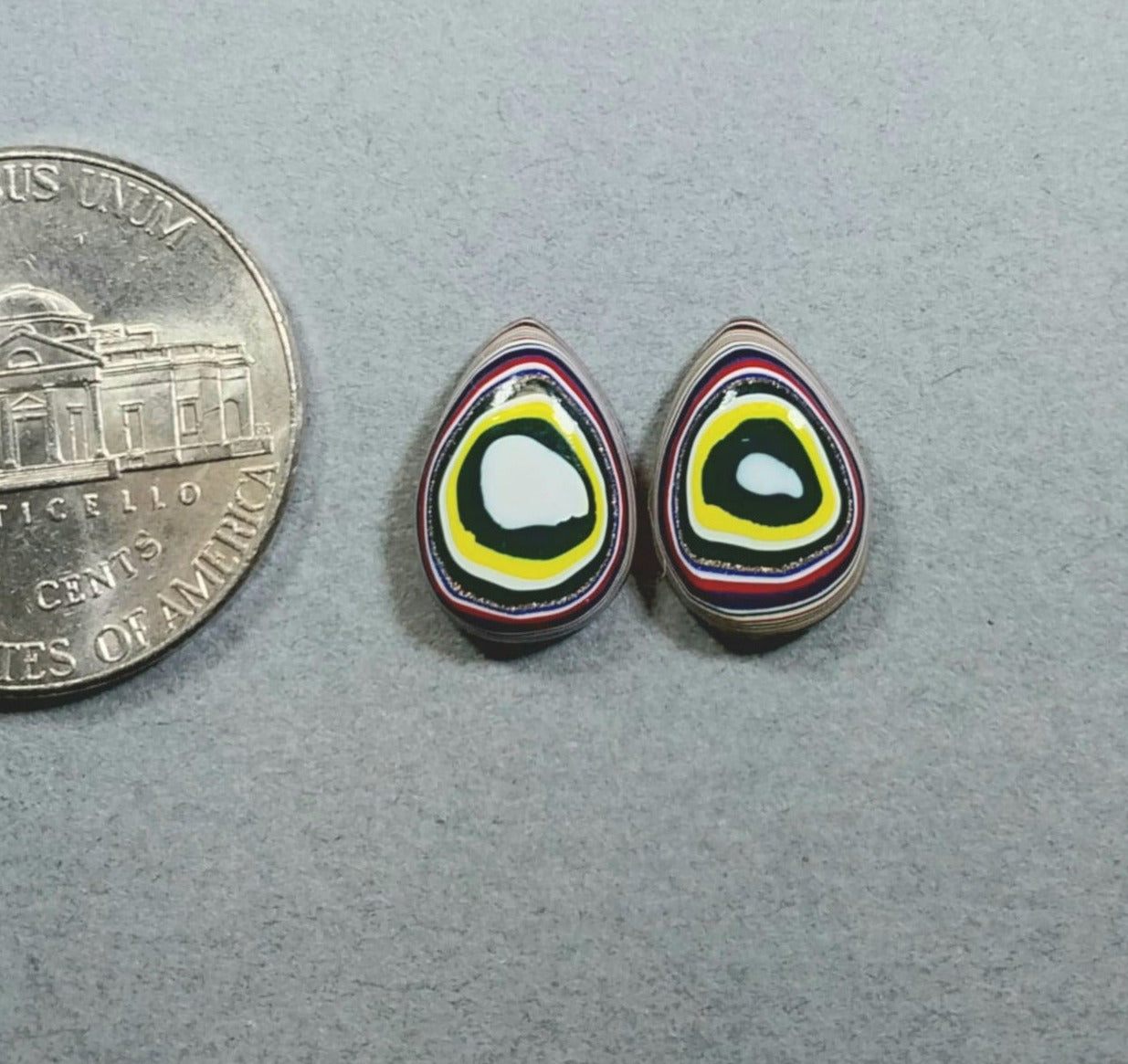 The main picture is enlarged to show detail. See the other pictures for scale and below for detailed measurements. This is a pair of tiny teardrop shaped fordite stones to make rings or earrings. All sides are polished.