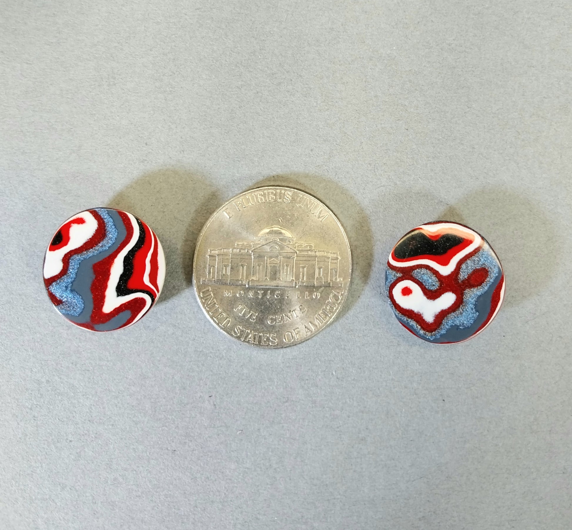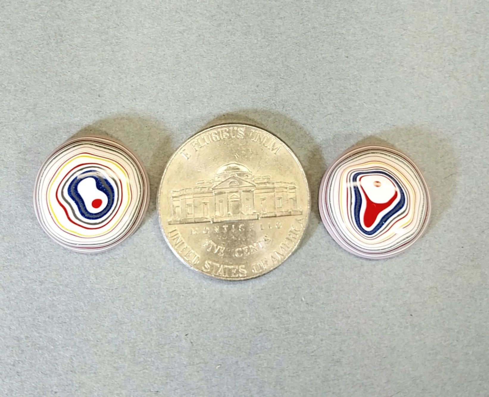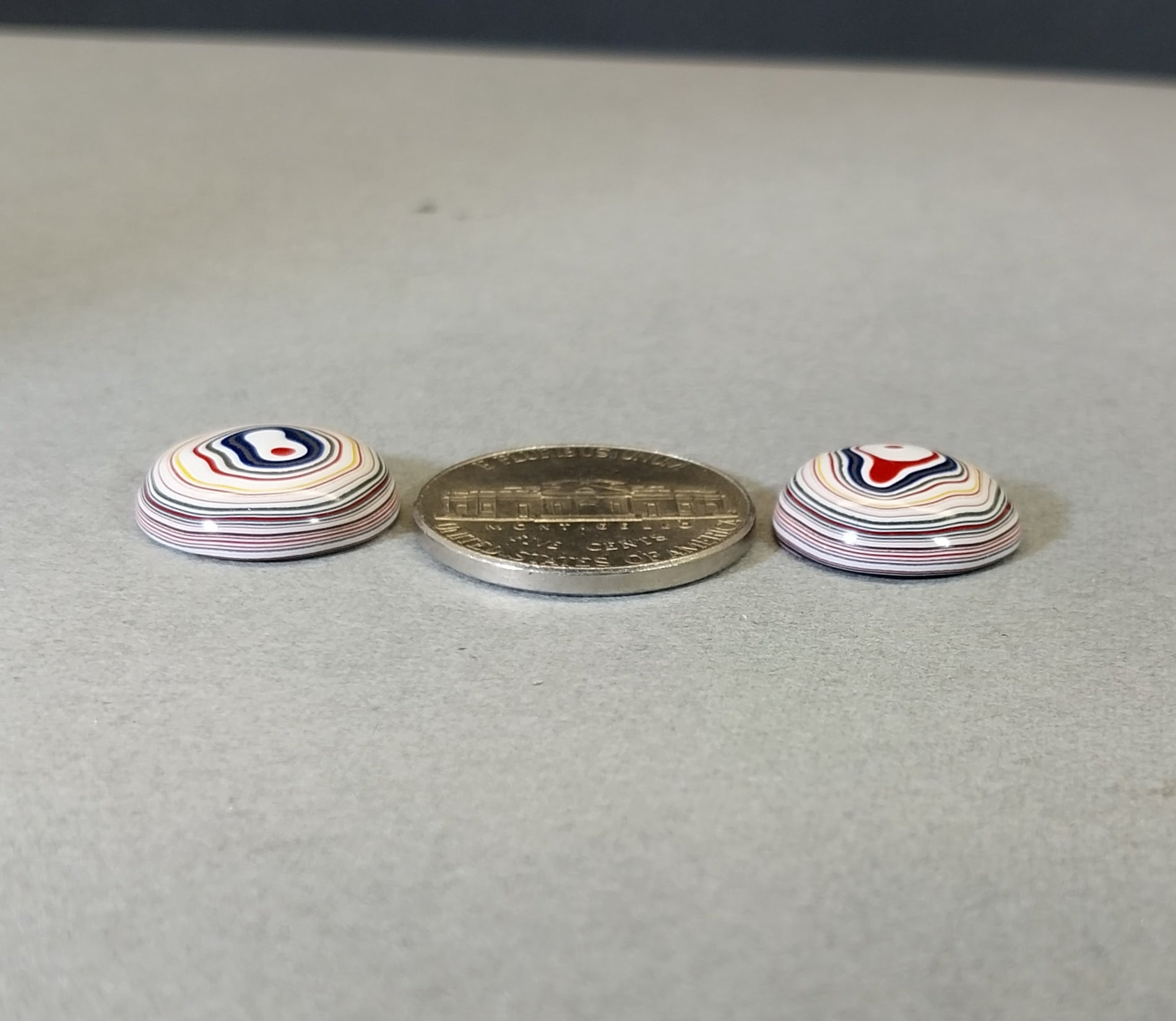 The main picture is enlarged to show detail. See the other pictures for scale and below for detailed measurements. This cabochon set is made from from fordite that occurred in Chillecothe Ohio while painting parts for big rig semi trucks. These have bright colors interspersed with layers of white for a vintage look in modern fordite. These are top domed rounds with flat backs. All sides are polished. They measure about: .6 W x .19 H/Thickness in inches or 15.5 x 4.8 or so in mm.