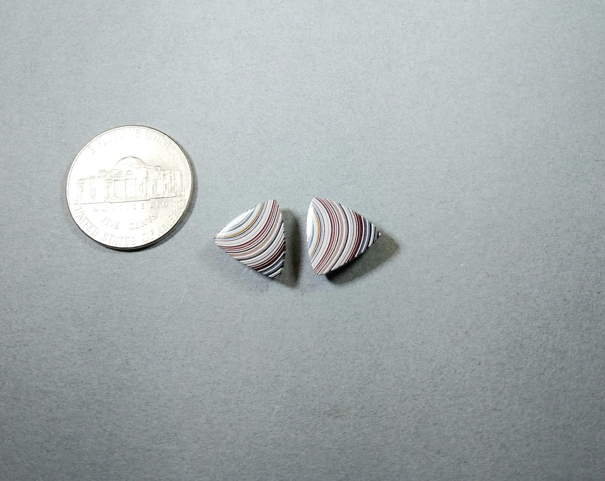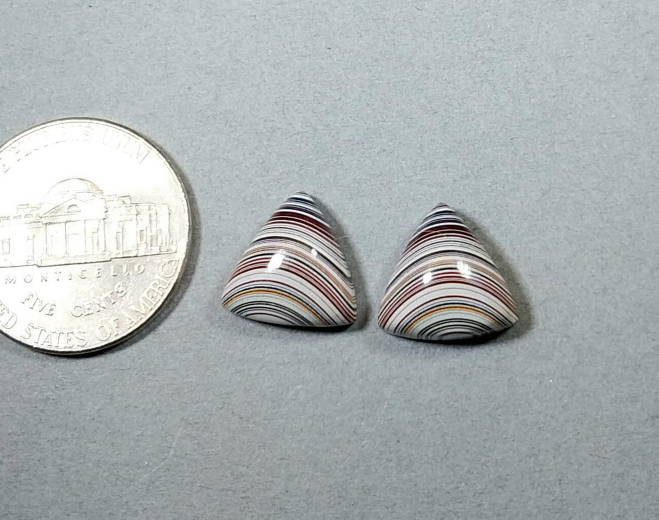 The main picture of this fordite cabochon set is enlarged to show detail. See the other pictures for scale and below for detailed measurements. I made these small triangles from modern semi truck fordite from Ohio. They are domed on top with flat backs. I cut these to show the layering in the fordite. These would make a great pair of earrings or you could split them up for rings or use them as accent stones. They have good height for small cabs.