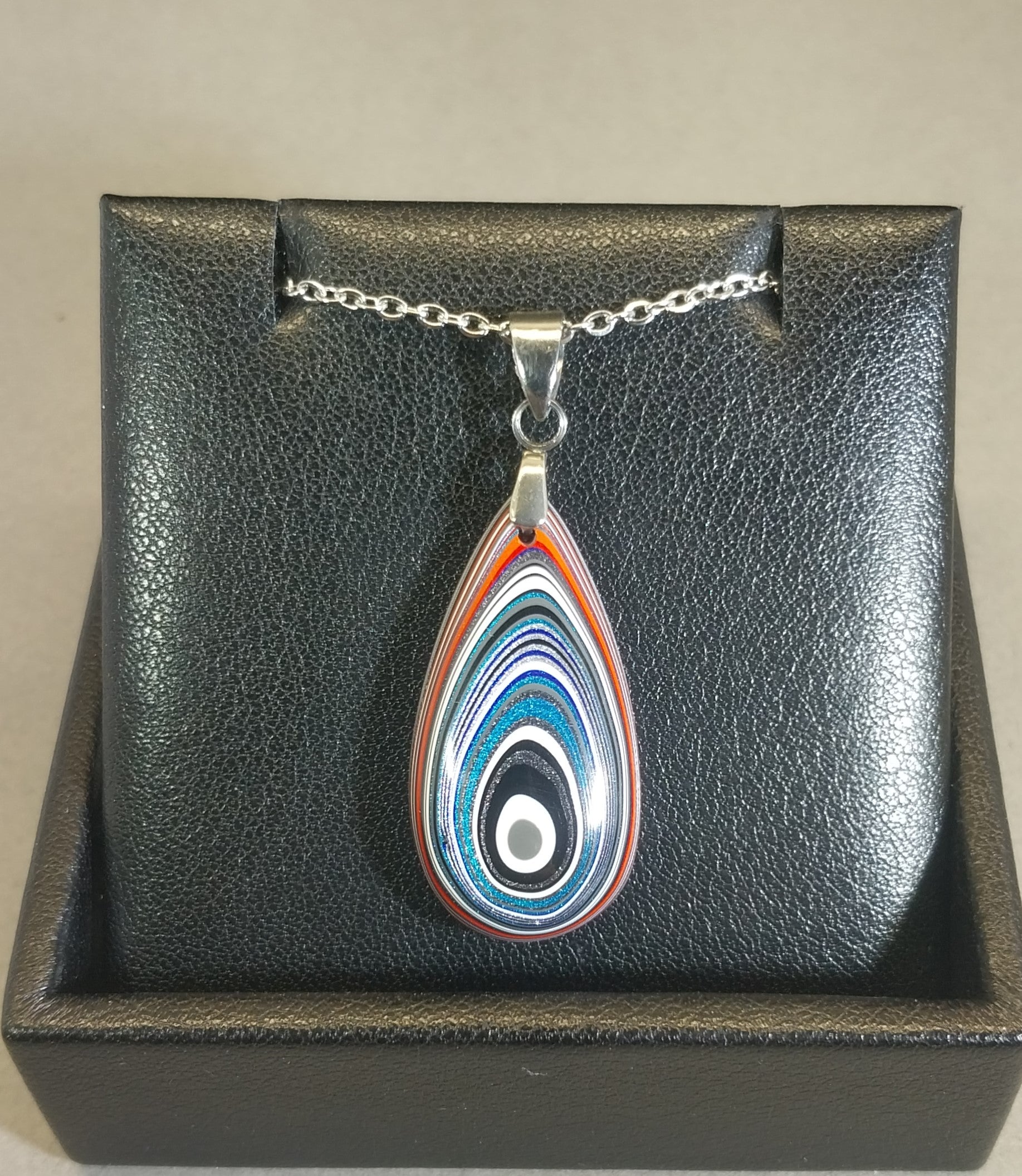 Fordite is recycled automotive paint sourced from automotive factories as well as manufacturers who paint parts for new vehicles. It forms in thin layers as car parts are painted on the racks that hold them in place. After hundreds of trips through the booth where the paint is sprayed and then baked the excess buildup is scraped off the racks. We buy this waste paint in rough chunks and recycle it into beautiful jewelry. It can take hundreds of layers of paint to make a one inch thick piece of fordite. The original fordite came from Detroit and since then it’s also synonymously known as Detroit Agate. There is very little fordite that is truly vintage. Most that’s available is modern i.e. current or within the past 15 years. We prefer modern fordite as it’s water rather than lead based paint. There are many different fordite types and some are more valuable than others. You’ll find in our fordite listings we refer to the plant location that the fordite originated from rather than listing specific auto manufacturers or vehicles.You can easily google the plant location and get a list of vehicles painted there or just ask us. We love to talk fordite so if you are looking for a specific type or color odds are we have it, please send us a message. All of our fordite is authentic.