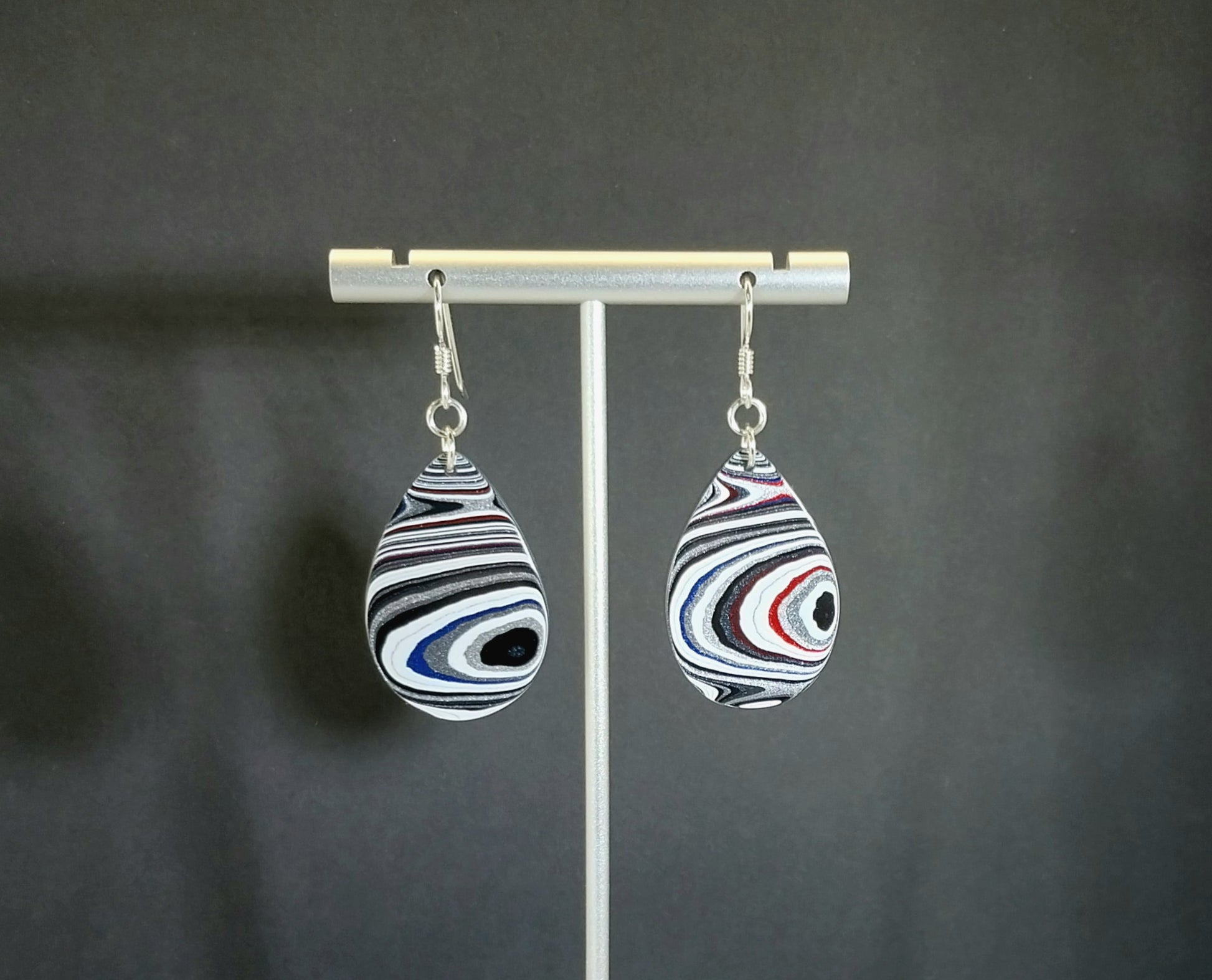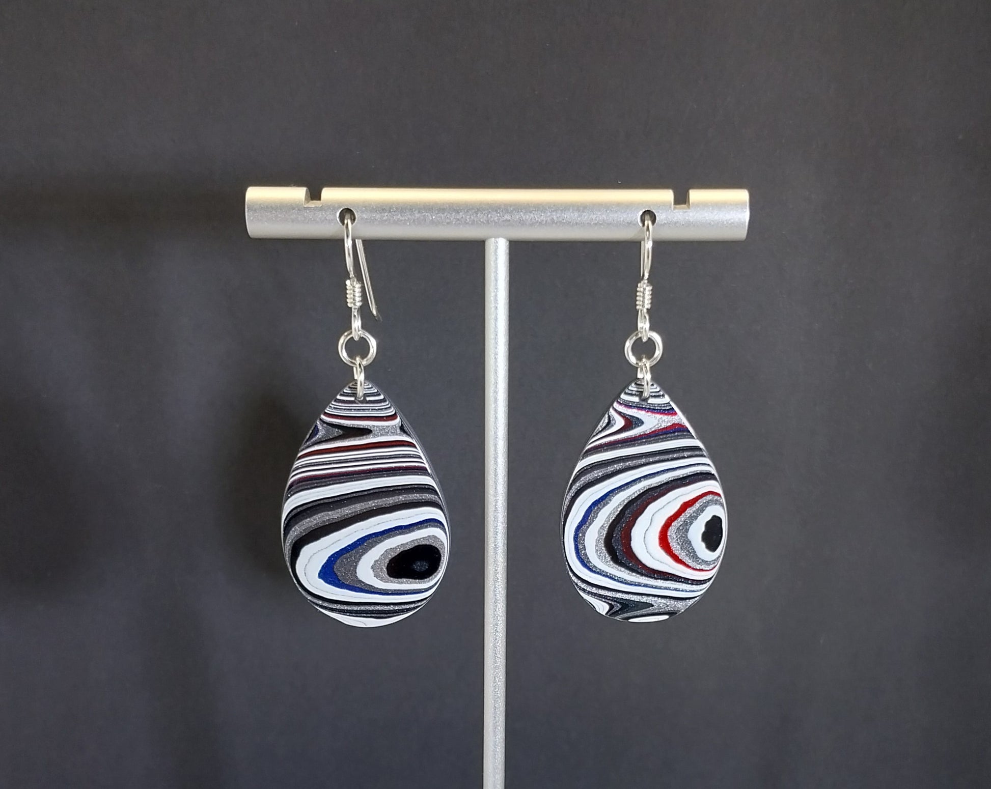 This set of fordite earrings are made with fordite from lower Michigan. I cut the stones to show the layering in the paint. These are teardrops that are flat front and back. The ear wires and jump rings that secure the fordite are solid argentium silver which is the silver of choice for ear wires because it resists tarnishing and is easy to clean. The fordite stones are about 33 mm tall. This fordite is from a manufacturer that paints parts for one and a half ton pickups and SUV's.