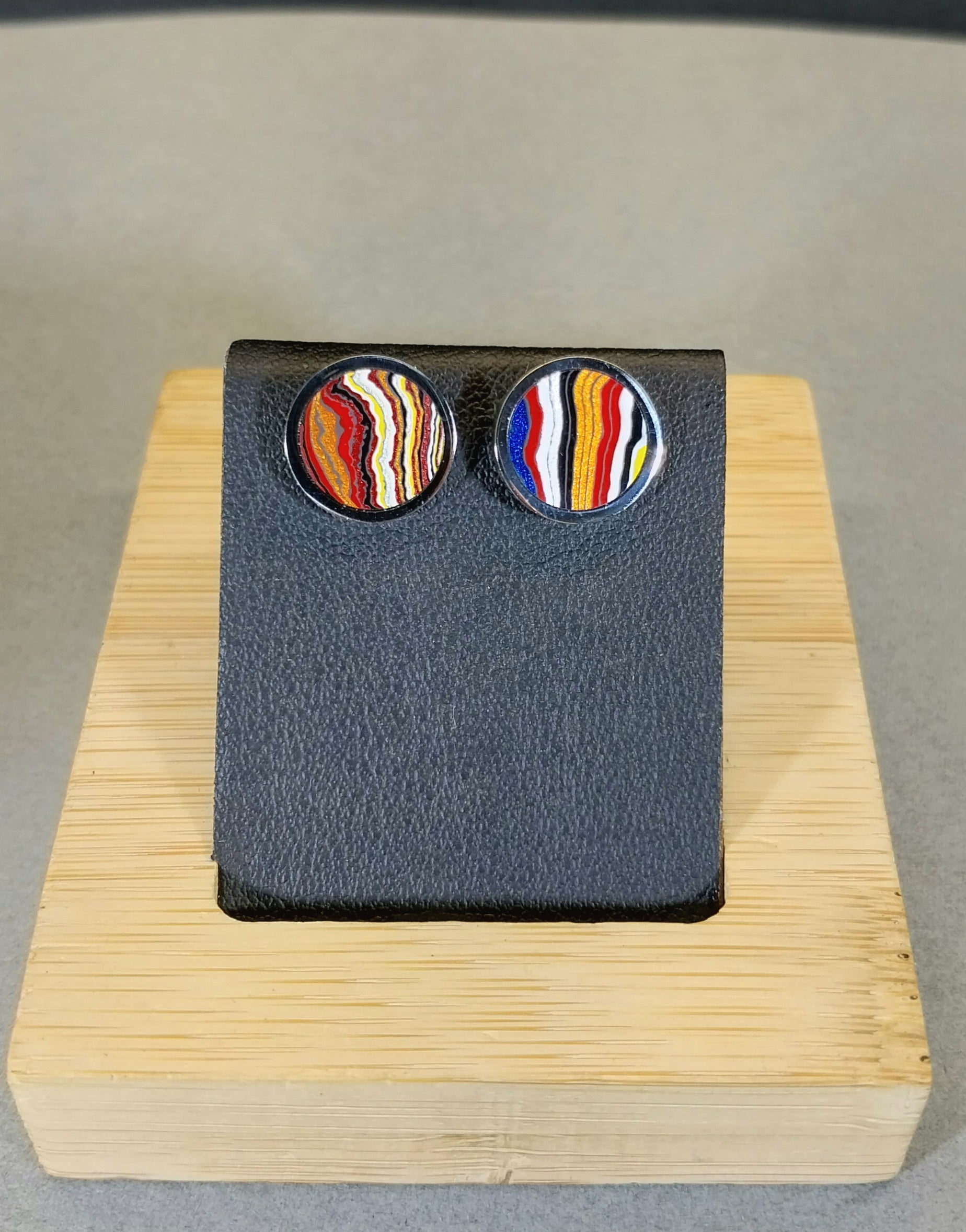 This set of fordite stud earrings has classic vette colors having originated in Bowling Green KY where they are made. The settings are about 12 mm across. The posts are about 11 mm long. These are stainless steel settings.