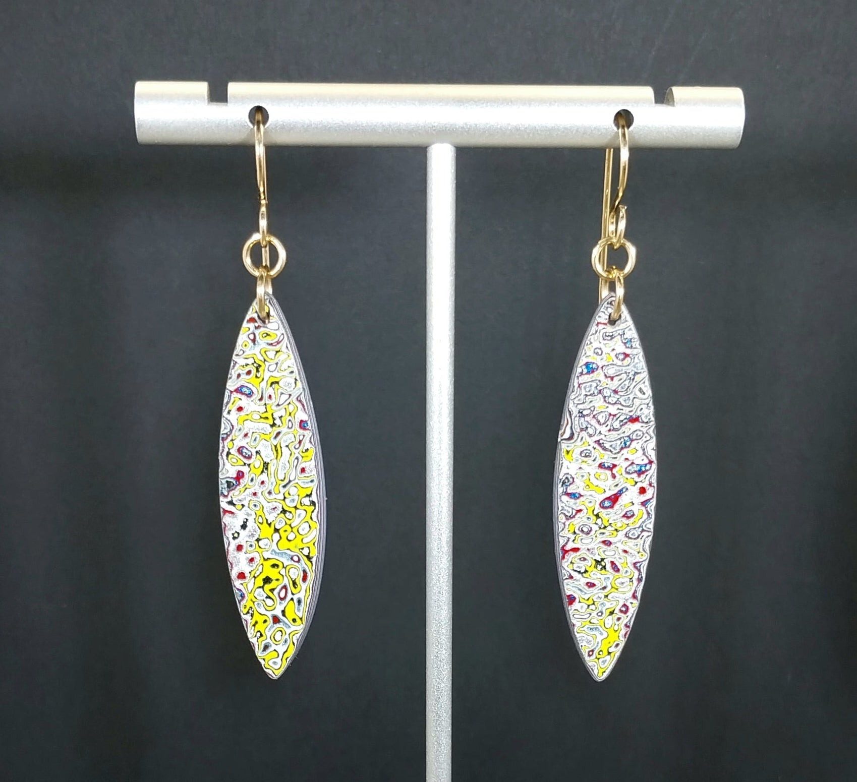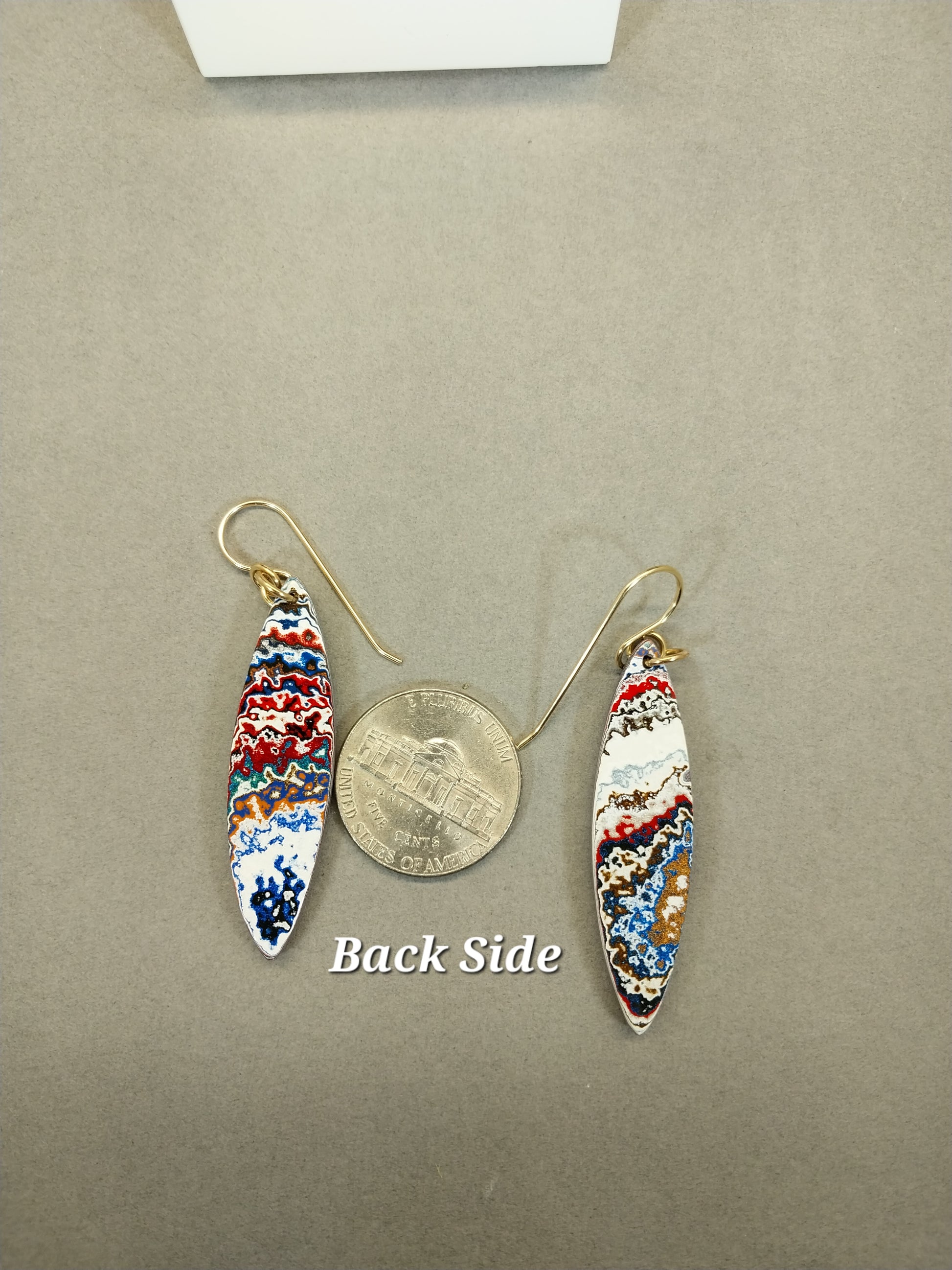 This set of premium colorful fordite earrings are made with fordite from Ohio that occurred when painting parts for semi trucks/freightliners. The ear wires and components that hold them are gold filled. The fordite stones measure about 42.5 x 11 in mm or about 1.7 inches tall. This is a great set of larger earrings with bright colors and intricate patterns.