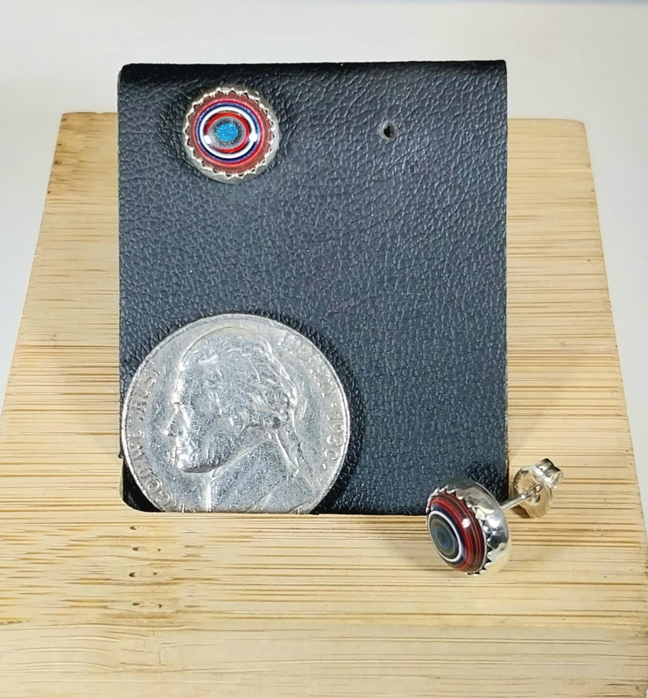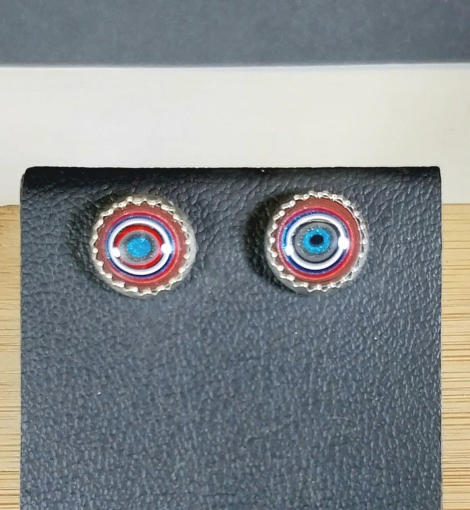 This set of fordite stud earrings have really great colors with blue and red and agate like patterns. We domed these little round fordite stones and set them in solid .999 fine and .925 sterling silver. The settings are about 9 mm wide. The posts are 10 mm long. This fordite is from the Parkway Toledo Ohio plant.