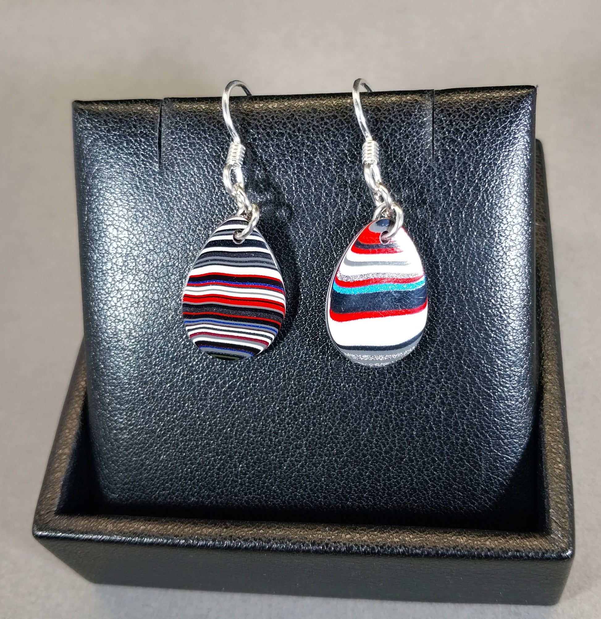 This beautiful matched set of teardrop fordite earrings are cut from paint over spray that built up while painting parts at the Parkway plant in Toledo Ohio. I shaped these in teardrops that thin and flat both sides. The ear wires and jump rings are solid argentium sterling silver. The stones are about 18 mm tall. Fordite is very light compared to natural stone so these are lightweight earrings. Pictured necklace holder is not included.