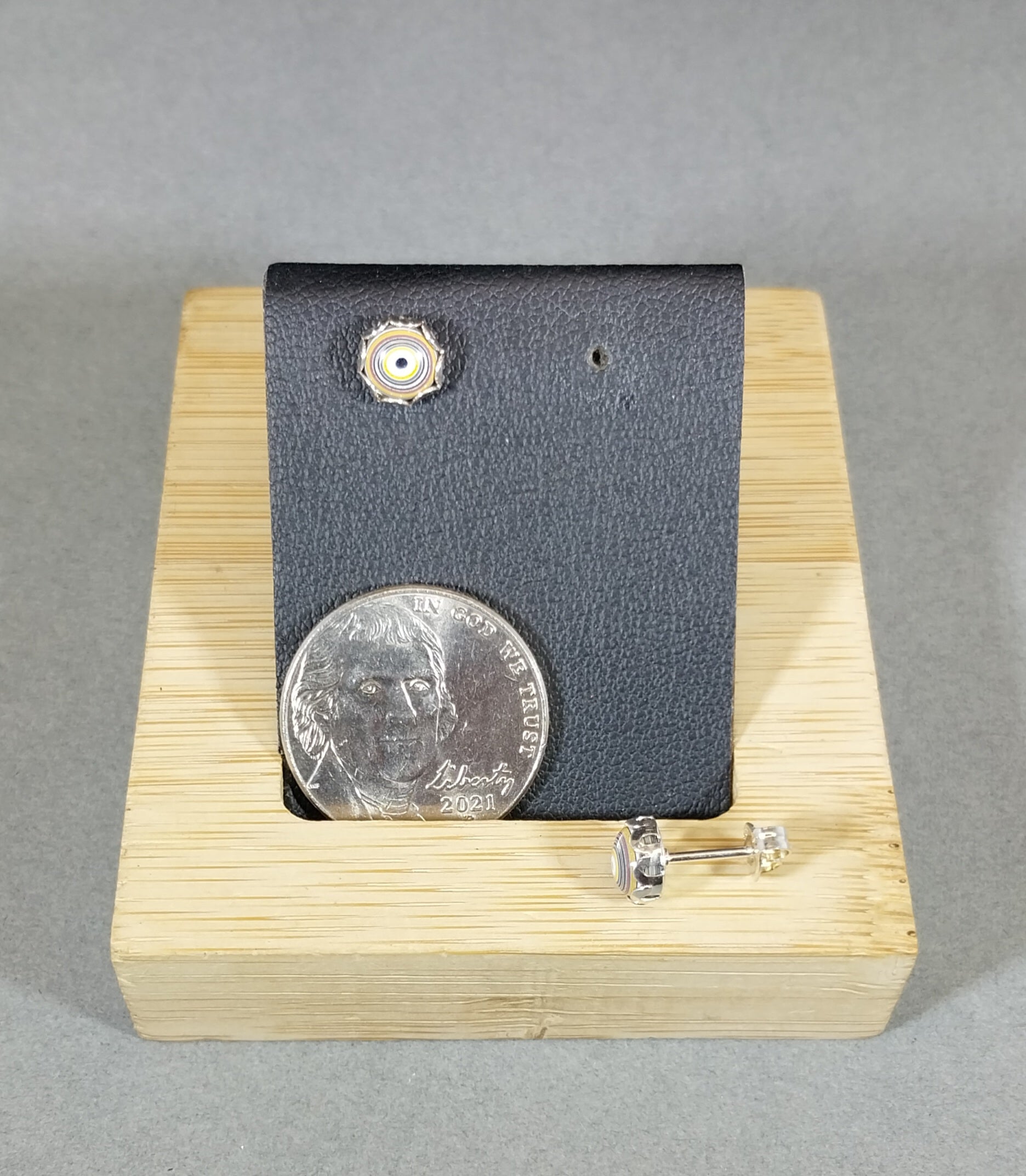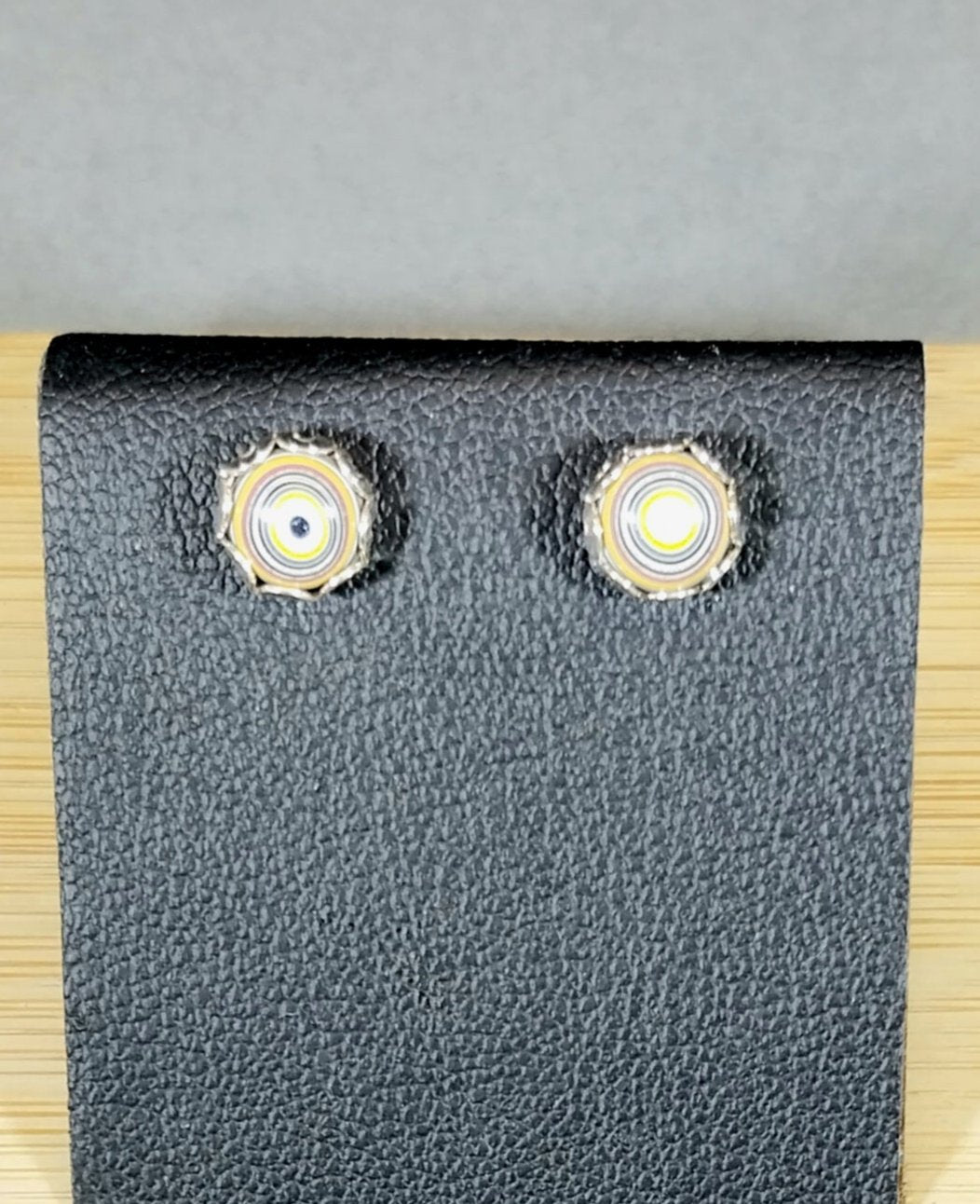 This is a matched set of 6 mm wide fordite stud earrings with yellow set in solid sterling silver. These stones are tiny and have really great color. The posts are about 10 mm long. This fordite is from Ohio and occurred as a result of painting parts for big rig semi's. I crafted the settings that hold the stones in solid silver. The bezels have a flower like design.
