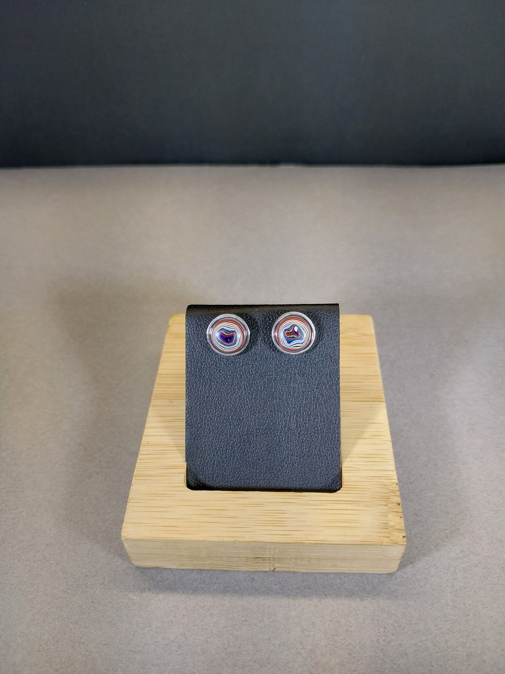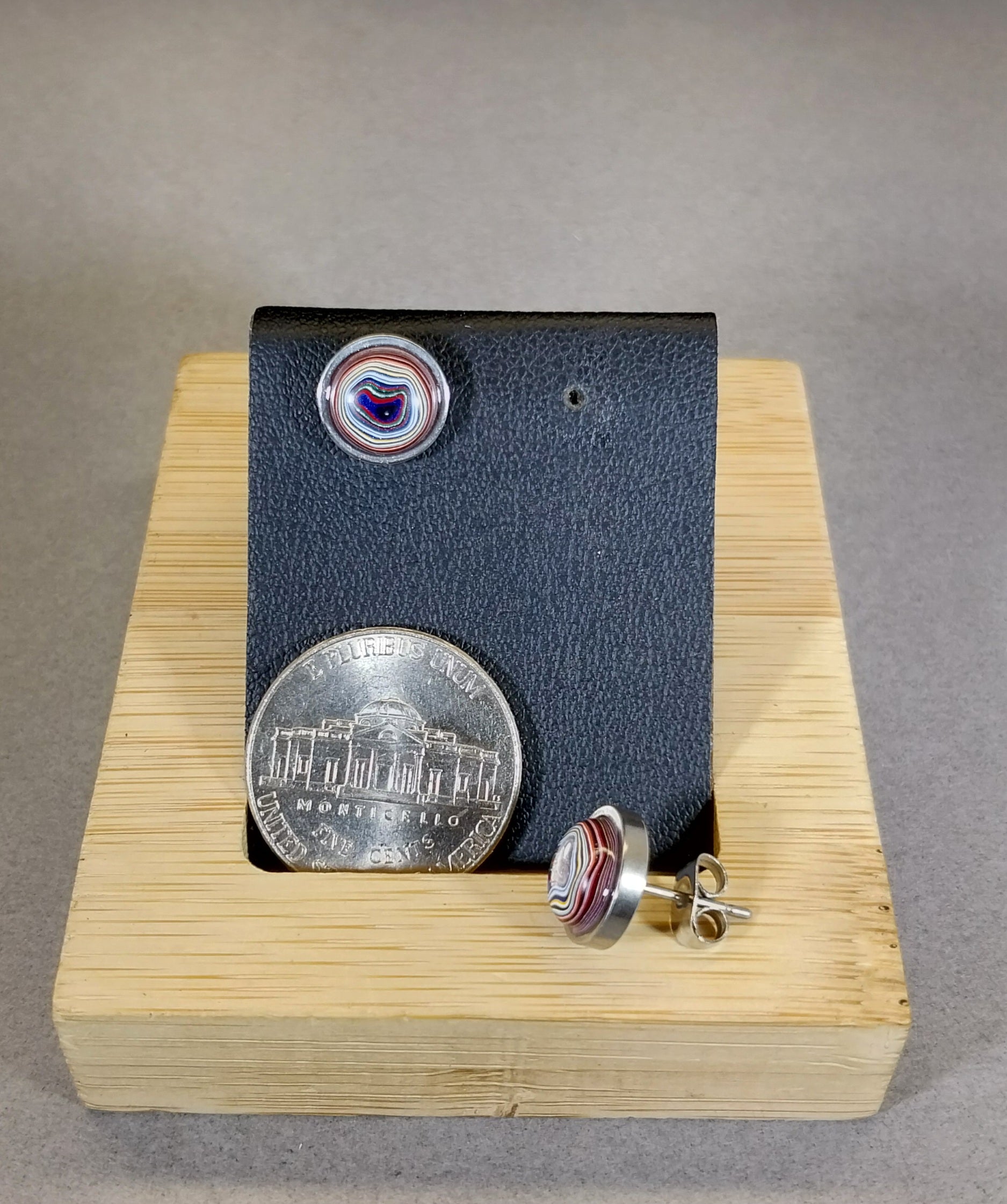 This is a matched set of nicely sized fordite stud earrings in all stainless steel. The settings are about 9.6 mm wide and feature a pair of premium domed fordite stones. The posts are about 10 mm long. This fordite is from the painting of parts for freight liners in Ohio.