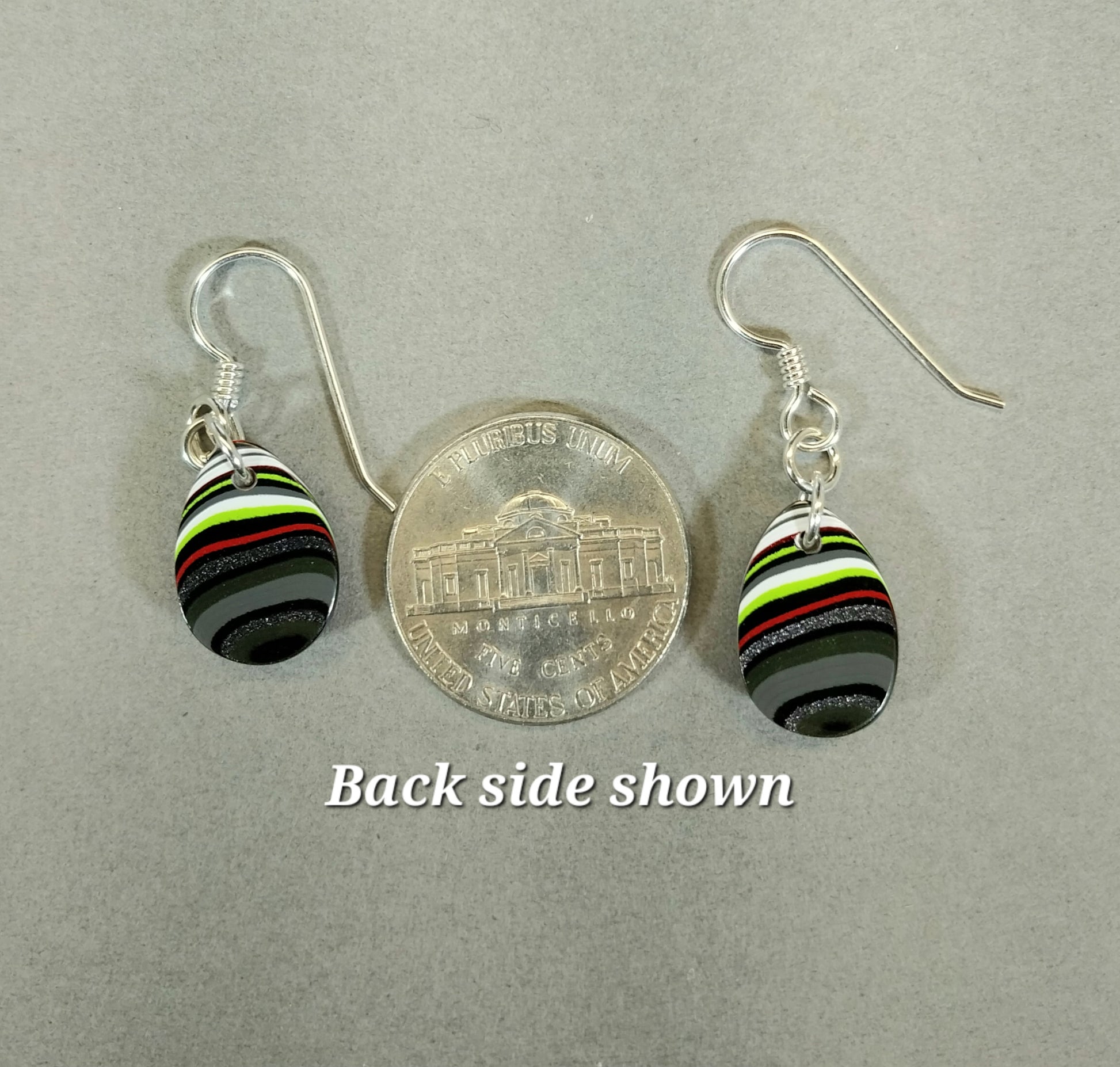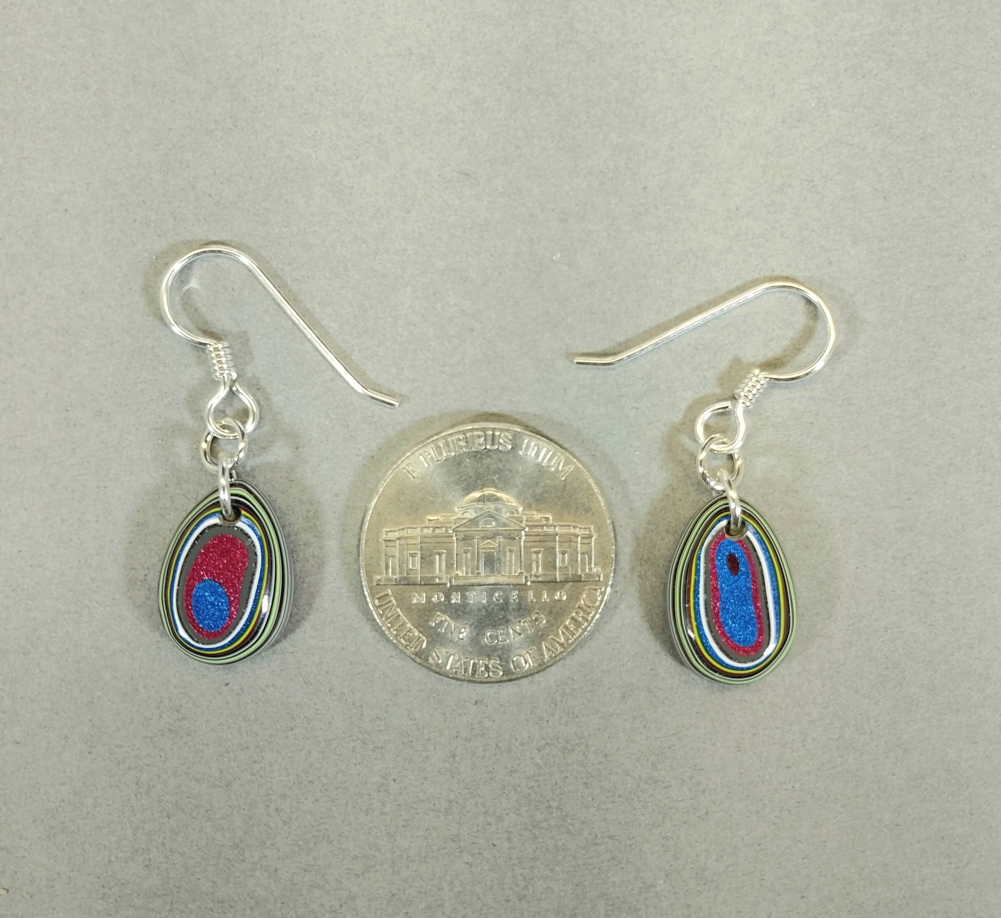 This is a beautiful set of fordite earrings in little domed teardrops featuring tuscadero pink and gecko green among other colors. This is modern fordite from the plant located at Parkway in Toledo Ohio. The ear wires are solid argentium sterling silver. Argentium is a tarnish resistant silver that is easy to clean. It's a premium option in sterling silver which you'll really come to prefer for ear wires over standard sterling due to it's tarnish resistance and ease of cleaning as compared to standard sterling. The stones for this set measure about 15 x 11 in mm. Fordite is very light weight so these earrings are not heavy.