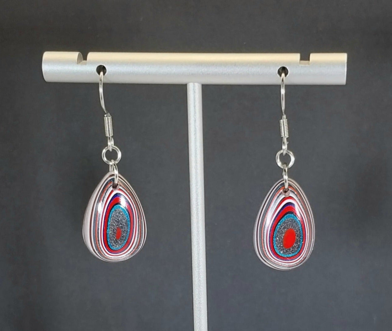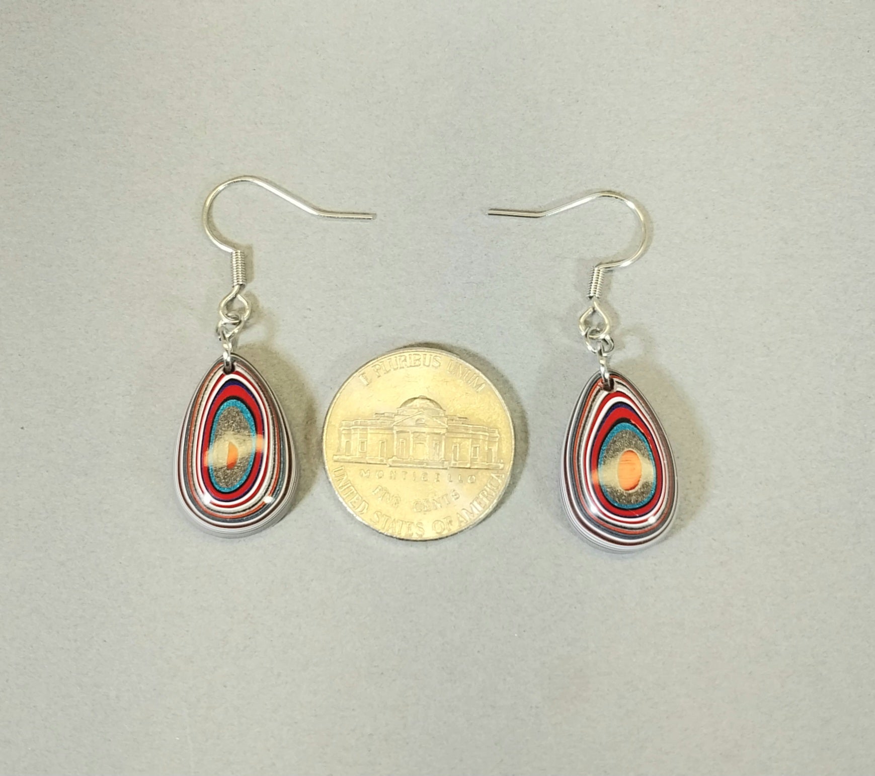 This listing is for a pair of colorful fordite earrings handmade by me in our home in Wisconsin. The ear wires and jump rings for this set are surgical steel so they will not turn or tarnish. My wife is sensitive to certain metals and she can wear these ear wires. The stones measure about 20x 14 in mm. This set is domed on the front with flat backs. This fordite occurred as a result of painting vehicles at the plant at Parkway in Toledo Ohio.