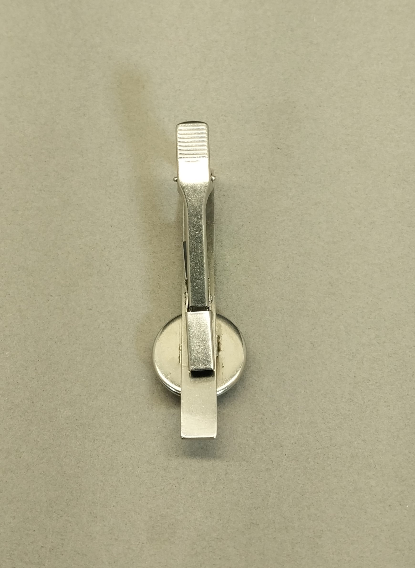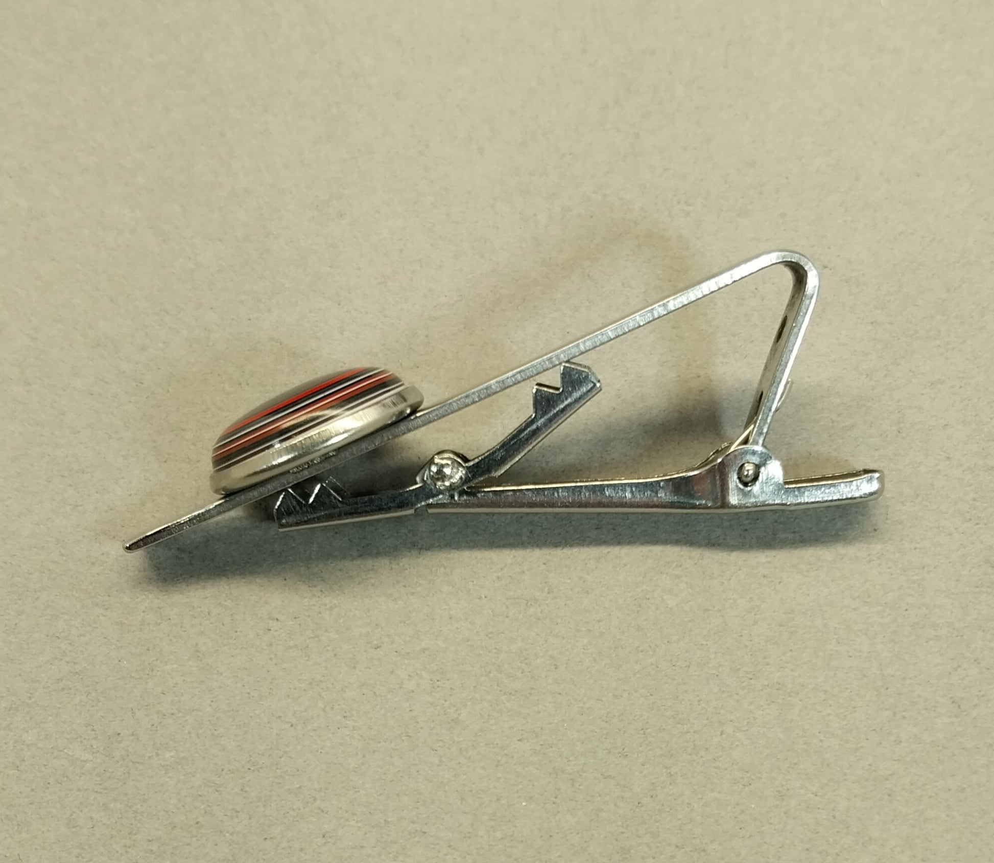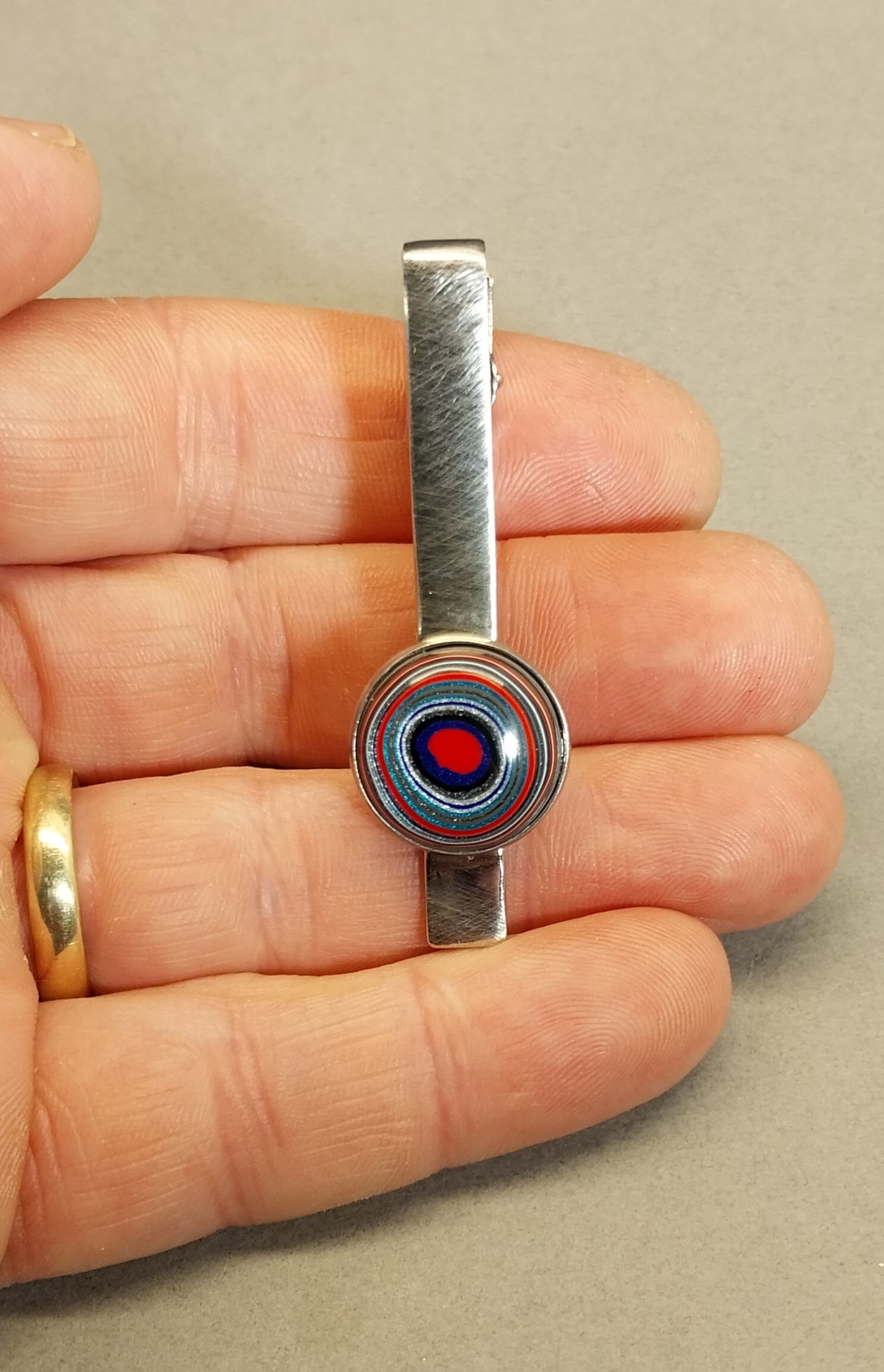 This fordite tie clip pin is made with motor agate from Ohio that occurred as a result of painting parts at the plant at Parkway in Toledo Ohio. The stone is domed and is about 16 mm across or .72 of an inch. The clip that holds it is stainless steel. I polished the steel then gave it a cross hatch brushed pattern. The clip is about 2.15 inches long.