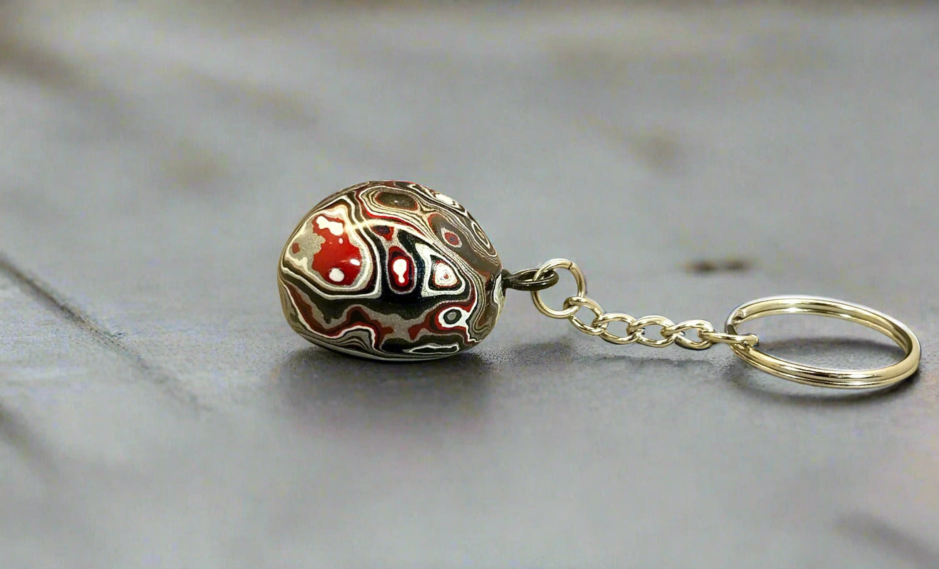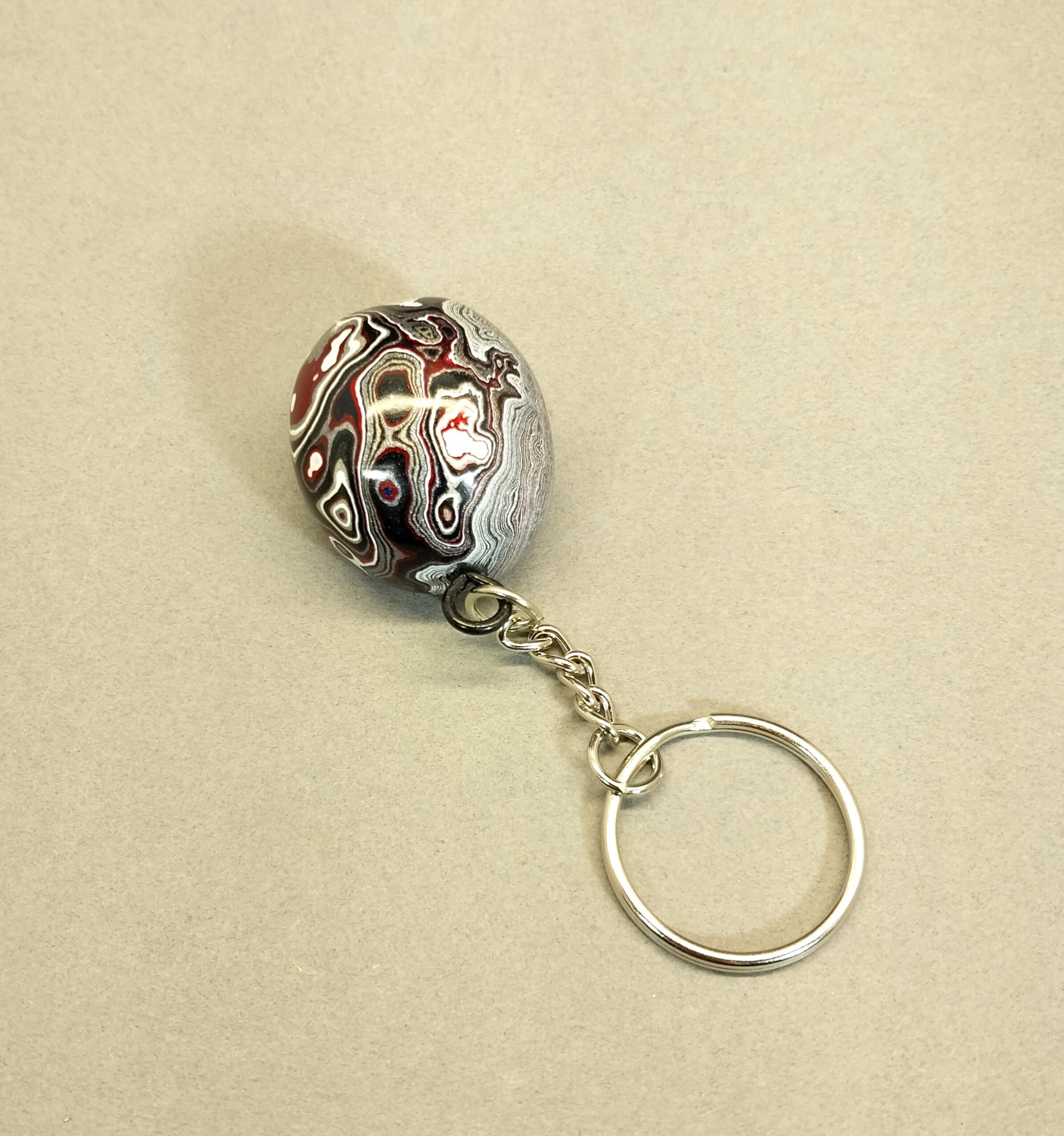 This is a really nice fordite specimen piece that I polished for a key chain. The fordite is from Michigan and occurred as a result of painting parts for one and a half ton trucks and SUV's. All sides are polished. The paint in this fordite is big on metal flake so the piece has a nice shimmer in sunlight. The key chain material is stainless steel. The fordite measures 30 x 21 in mm. Including the chain and ring it's about 3.4 inches long overall. Picture props are not included.