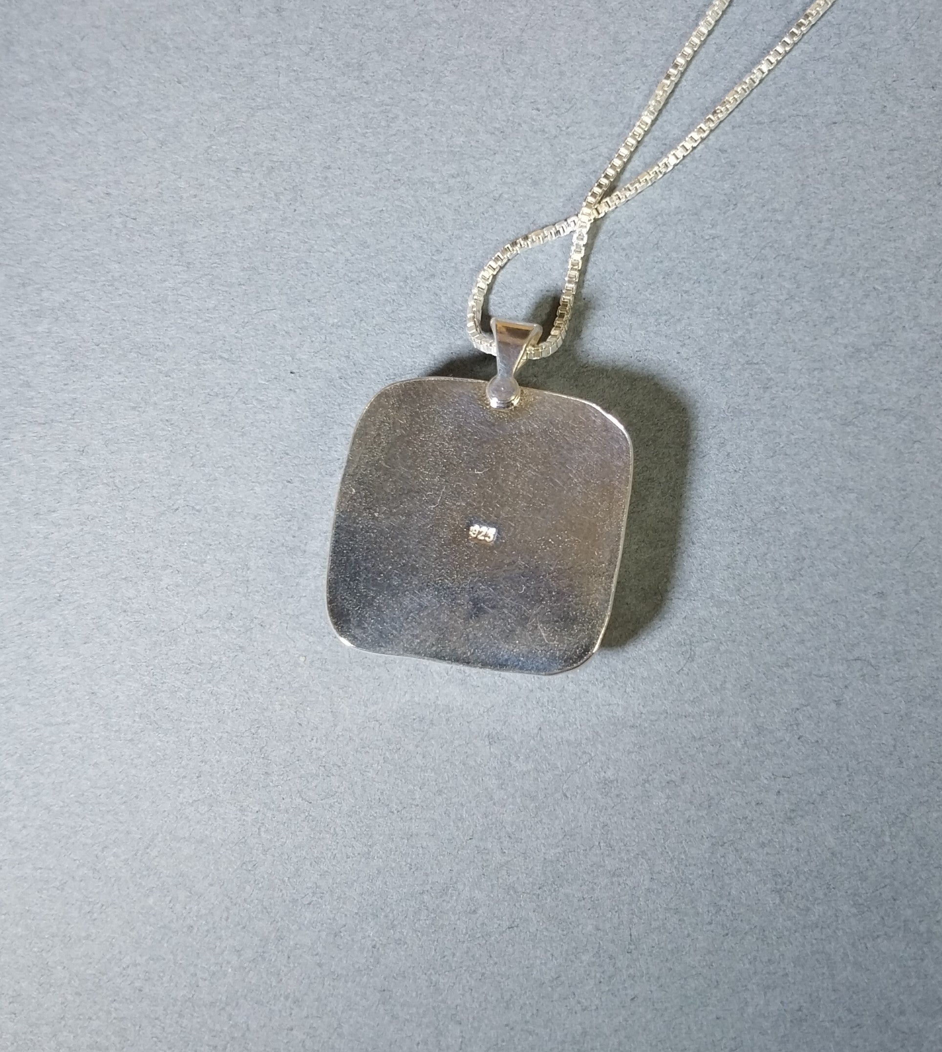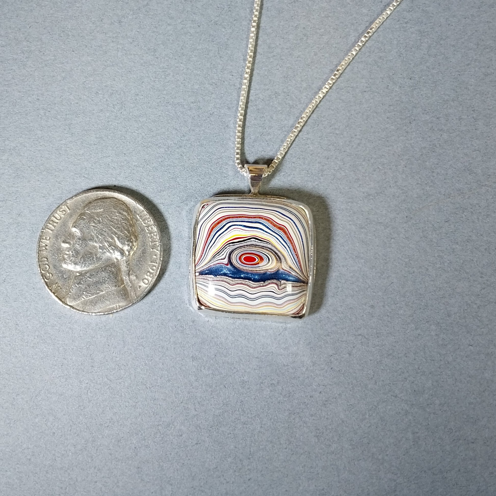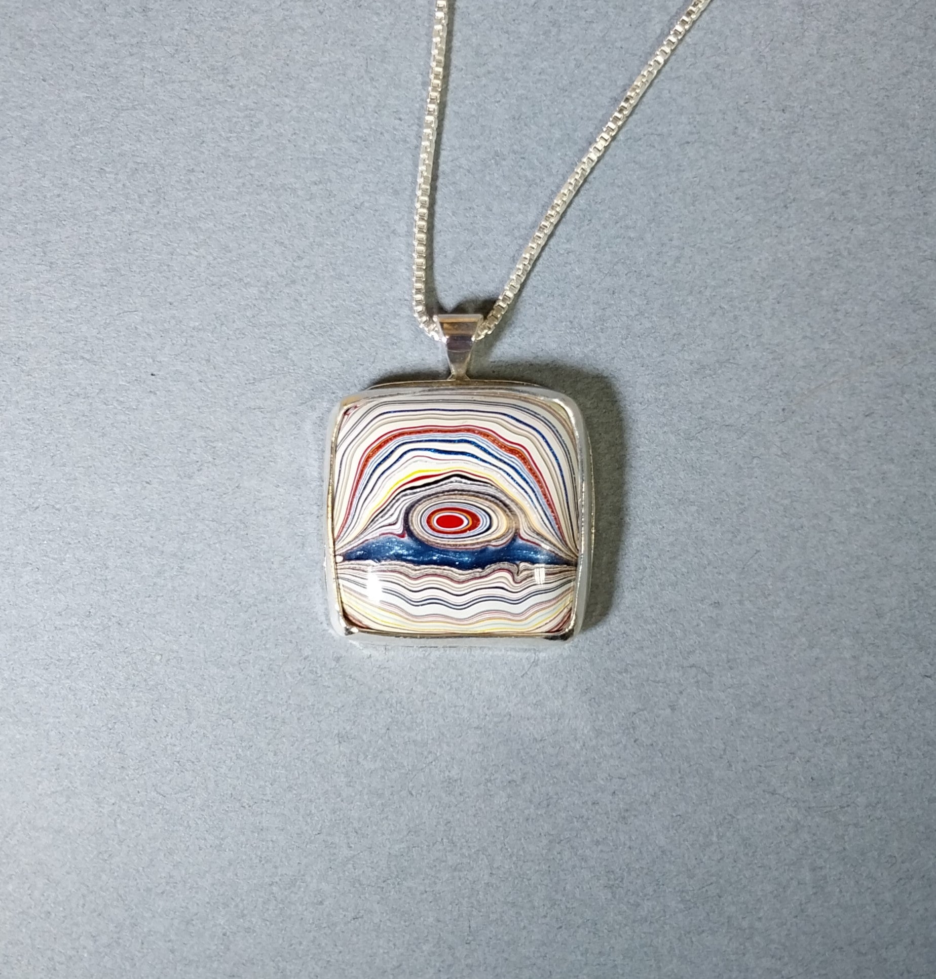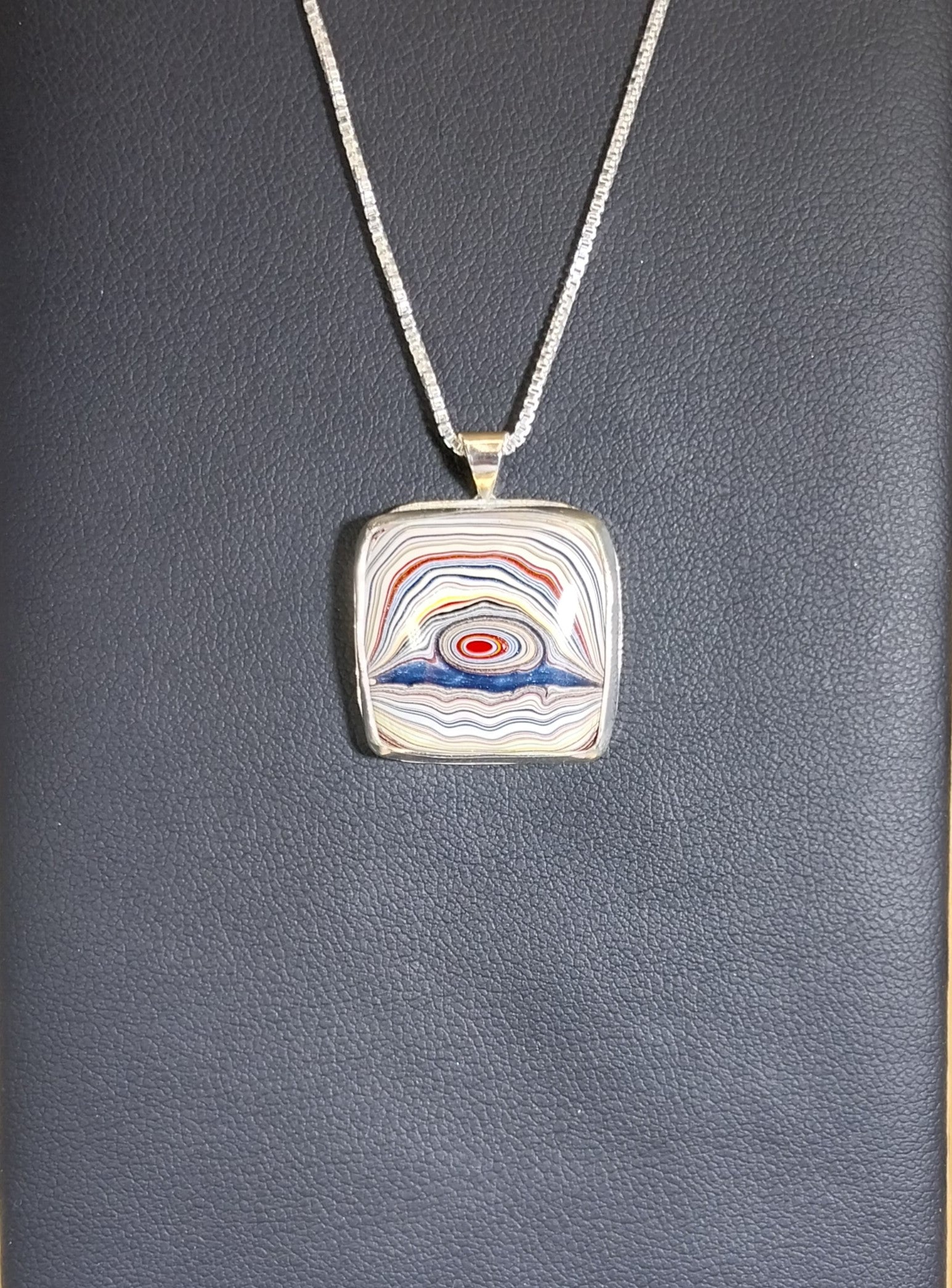 This fordite necklace is a unique piece where I used blue resin to add an element of color just below the eye feature where there was a natural void. The stone is a free form which is primarily square shaped. I flared the edges slightly in the middle of each side and ground them flush at the corners for a more unique look. The eye in this piece is really cool and to me looks like it's floating over the water. You can really see the colorful layering in this piece of fordite. It's modern fordite from Ohio that occurred while painting parts for semi trucks. The setting is solid silver 925 sterling and 999 fine silver. The pendant measures about 26 x 21 mm. The included solid silver chain is 20 mm in length.