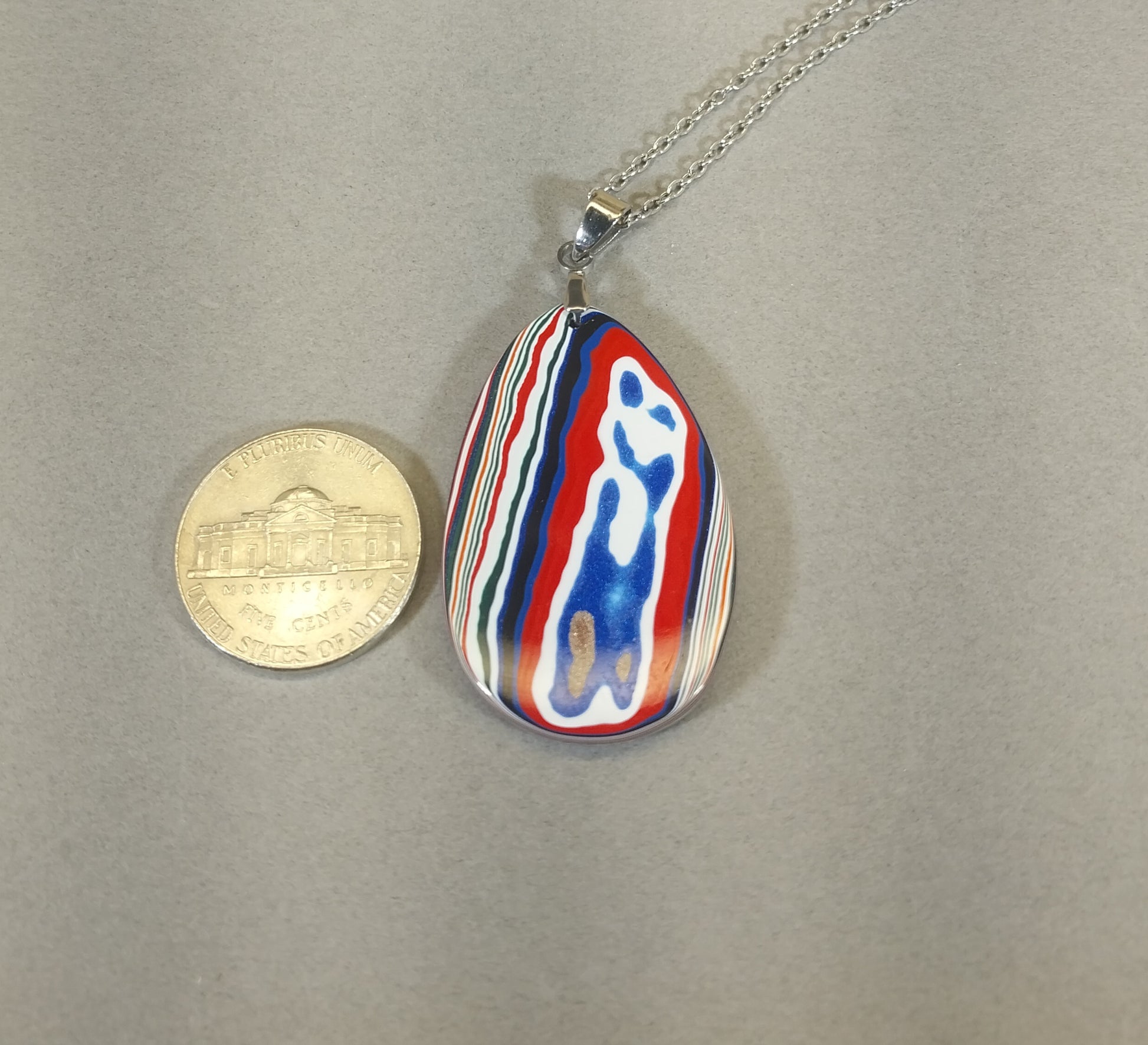 Own a piece of automotive history! This fordite necklace has great color with with lots of red and blue on one side and rare copper yellow and green on the other side. The two sides are so different it's really like two in one. This is a good sized teardrop shape that's flat both sides. The second picture shows the reverse side. The bail and included 20 inch chain are stainless steel. This fordite is from a plant in Chillecothe Ohio that paints parts for freight liner semi trucks. The fordite stone measures about 1.5 in tall or 38 in mm.