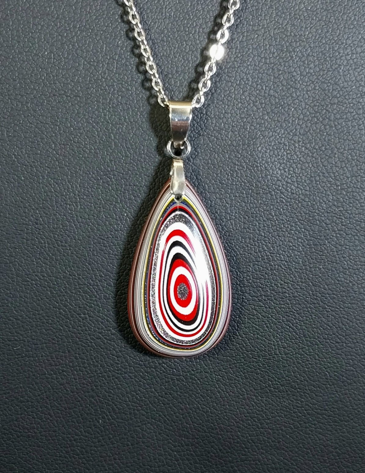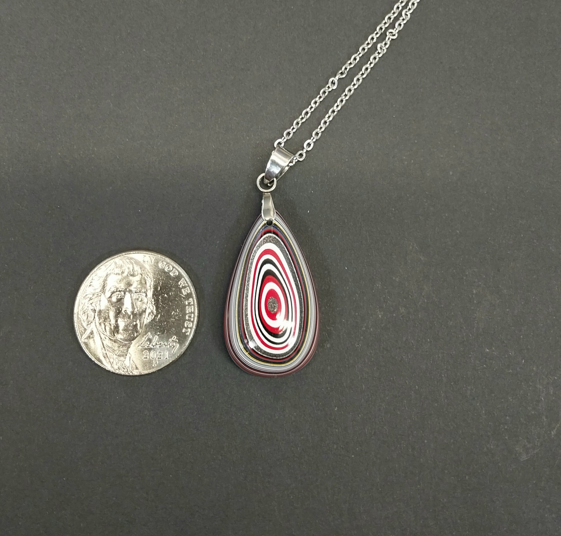 This teardrop shaped fordite necklace features red and black with some other colors. The fordite is from the Parkway Toledo Ohio plant. The included chain is 20 inches in length and is worry free stainless steel. The fordite measures about 1.15 x .63 inches.