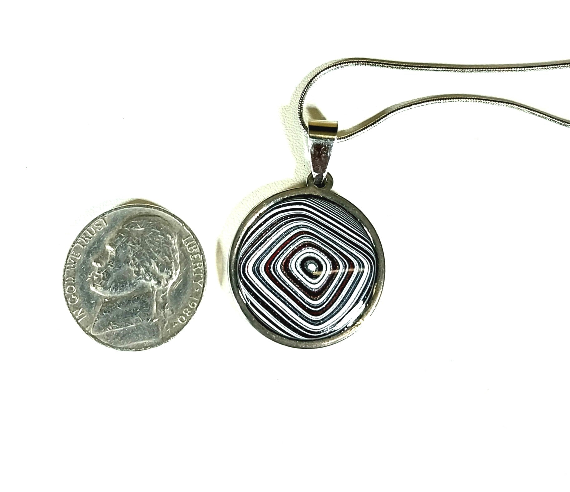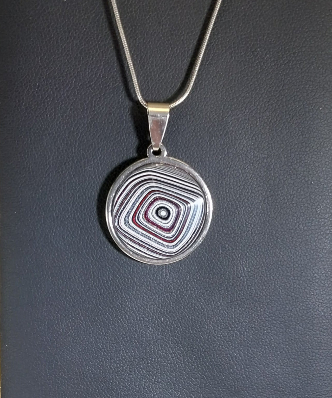 This fordite necklace is made with paint from lower Michigan. This is a nice cut with cool layering and a good amount of reflective paint. The setting as well as the included 1 mm snake chain are stainless steel. This is worry free jewelry. I did a hand faceted cut on this stone.