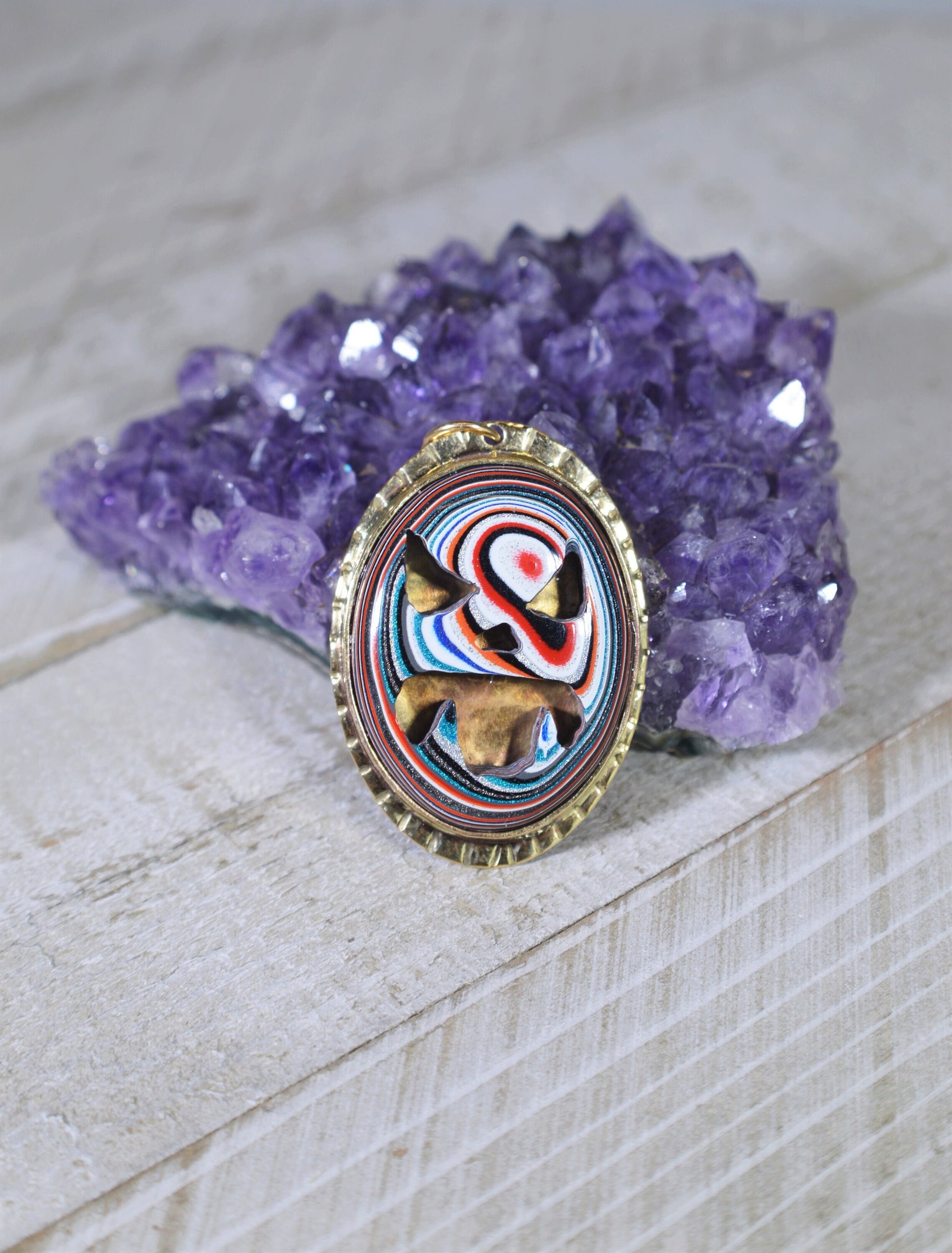 Fordite is recycled automotive paint sourced from automotive factories as well as manufacturers who paint parts for new vehicles. It forms in thin layers as car parts are painted on the racks that hold them in place. After hundreds of trips through the booth where the paint is sprayed and then baked the excess buildup is scraped off the racks. We buy this waste paint in rough chunks and recycle it into beautiful jewelry. It can take hundreds of layers of paint to make a one inch thick piece of fordite. The original fordite came from Detroit and since then it’s also synonymously known as Detroit Agate. There is very little fordite that is truly vintage. Most that’s available is modern i.e. current or within the past 15 years. We prefer modern fordite as it’s water rather than lead based paint. There are many different fordite types and some are more valuable than others. You’ll find in our fordite listings we refer to the plant location that the fordite originated from rather than listing specific auto manufacturers or vehicles.You can easily google the plant location and get a list of vehicles painted there. We love to talk fordite so if you are looking for a specific type or color odds are we have it so please send us a message. All of our fordite is authentic.