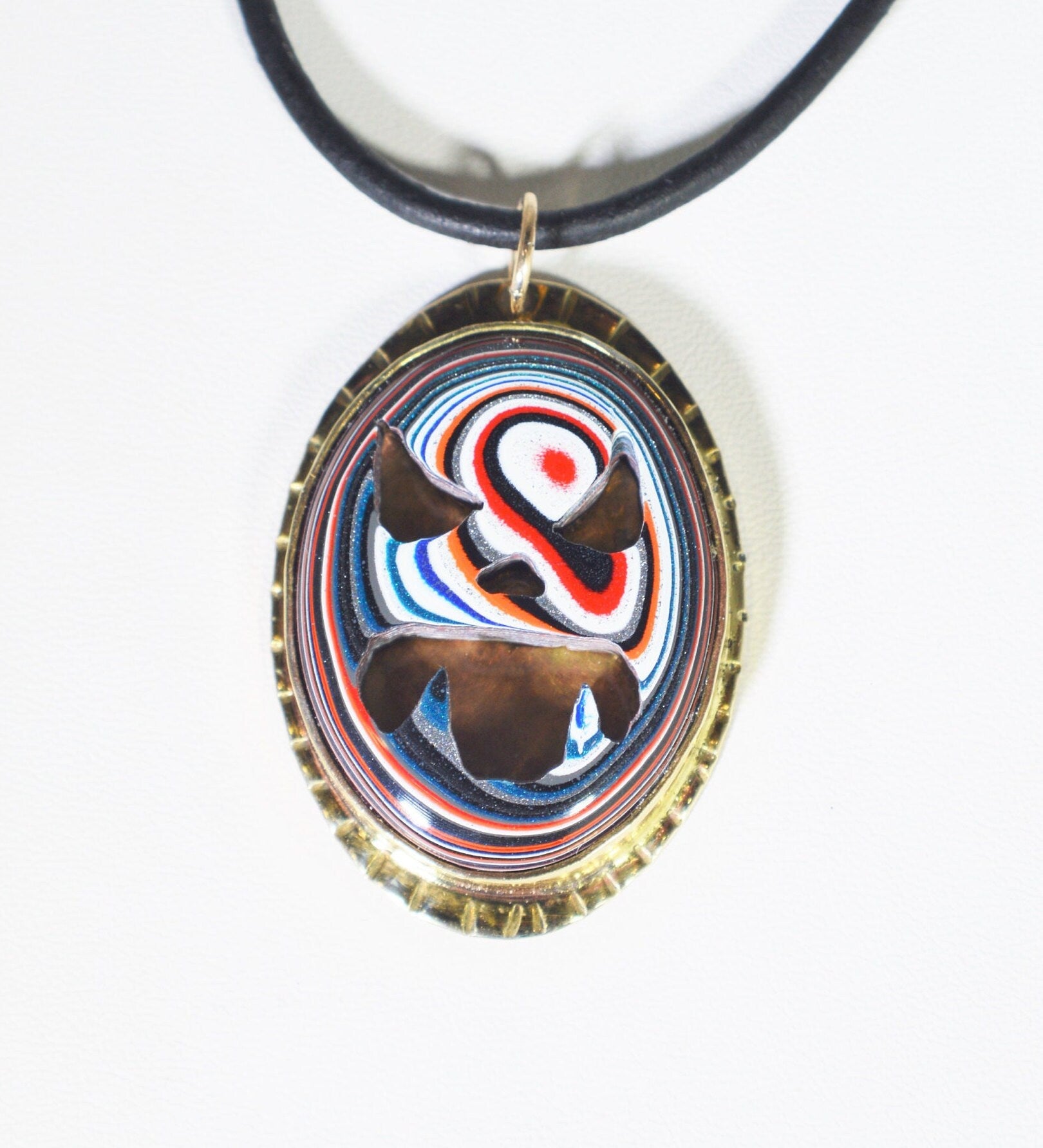 This fordite monster necklace is the perfect piece when you want to wear something both edgy and cool. We hand cut the design and crafted the fordite oval then set it in a hand stamped edge brass setting we made at the bench. This piece comes with a leather cord (2mm diameter) that's 20 inches long. The cord has stainless steel components.