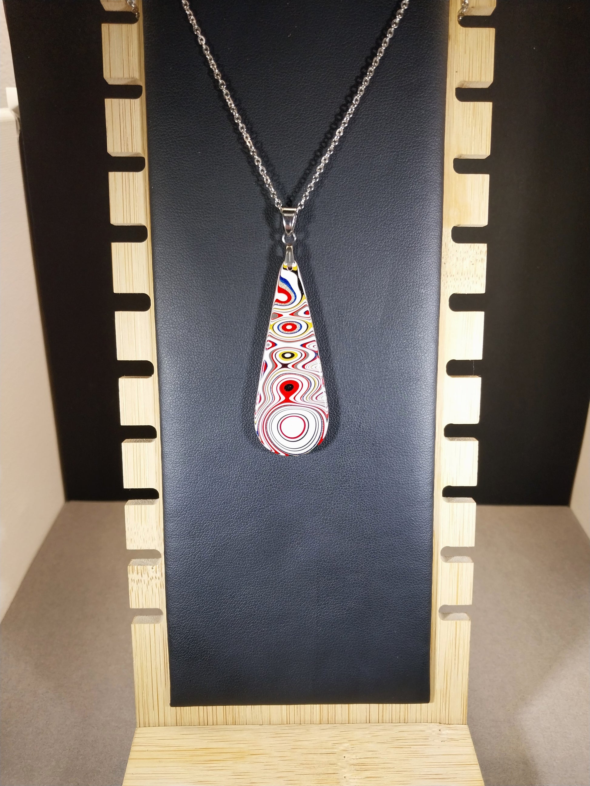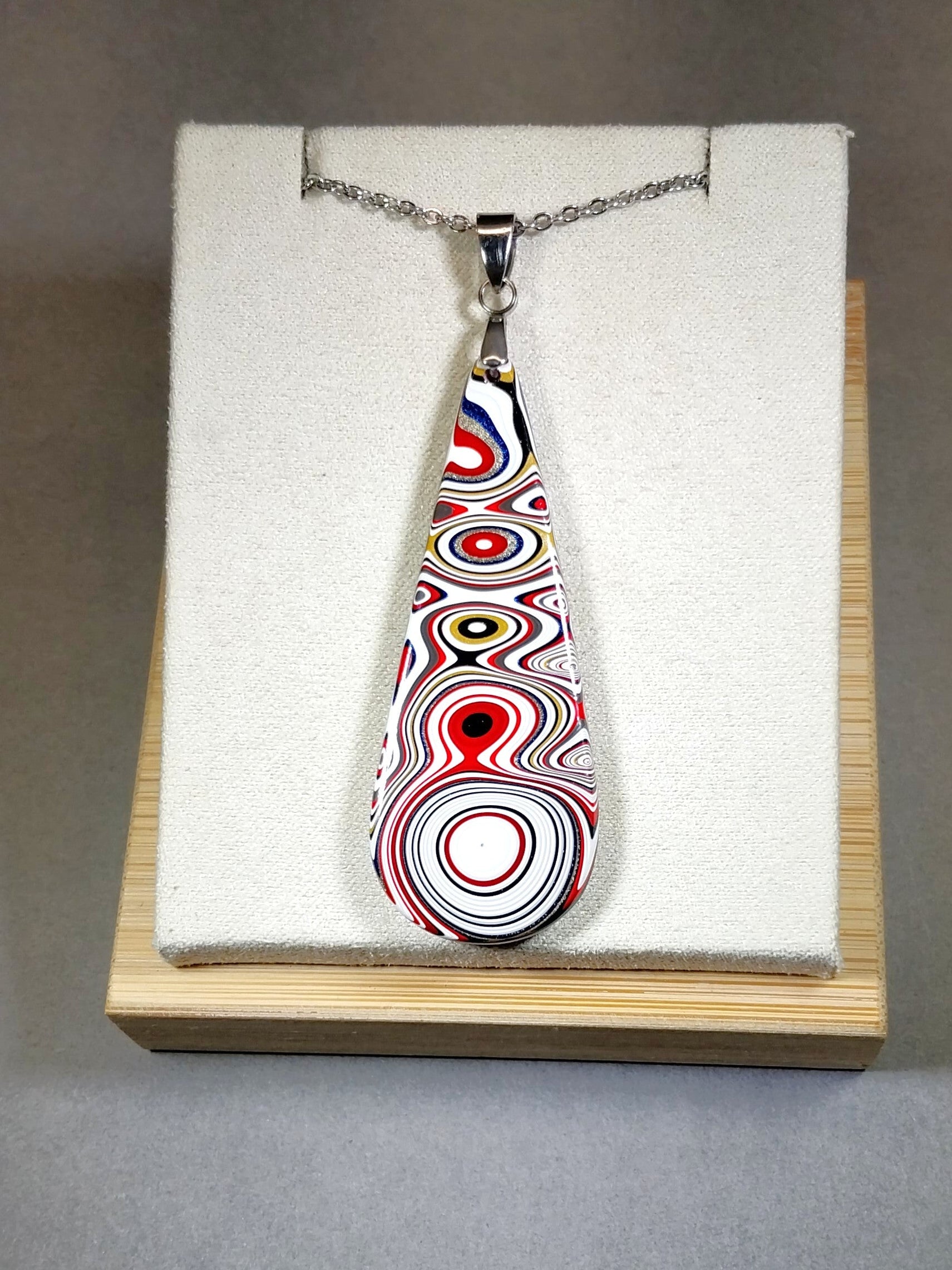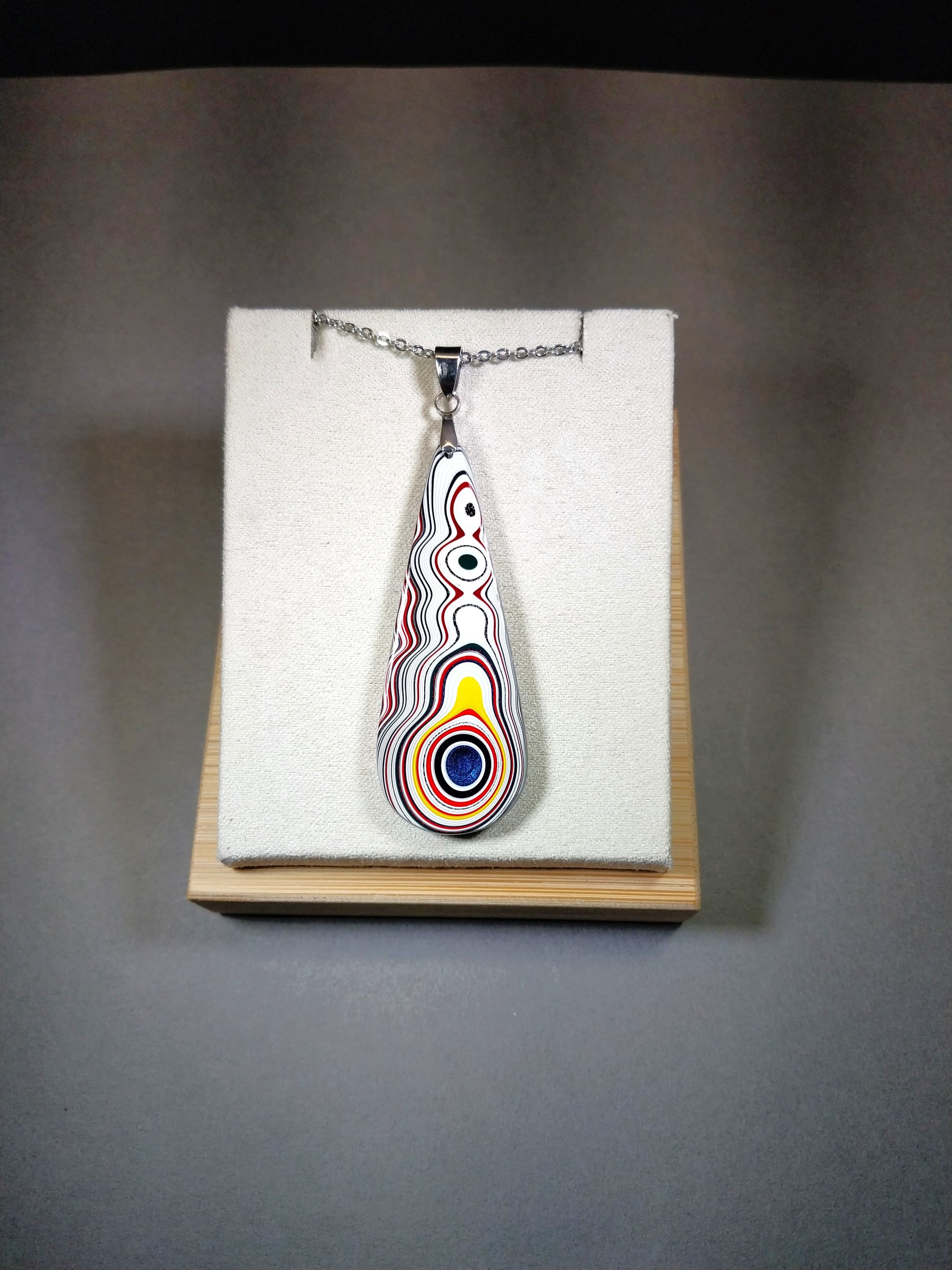 This fordite necklace is in a teardrop that's flat front and back and is cut from semi truck fordite that originated in Ohio. It has great colors and incredible patterns making it a premium piece. This is reversible with different colors on each side (see pictures). The bail that secures the fordite and included 20 inch chain are stainless steel. This fordite measures about 2.06 x .8 in inches or is about 52 mm tall. Picture props/necklace holders are not included.