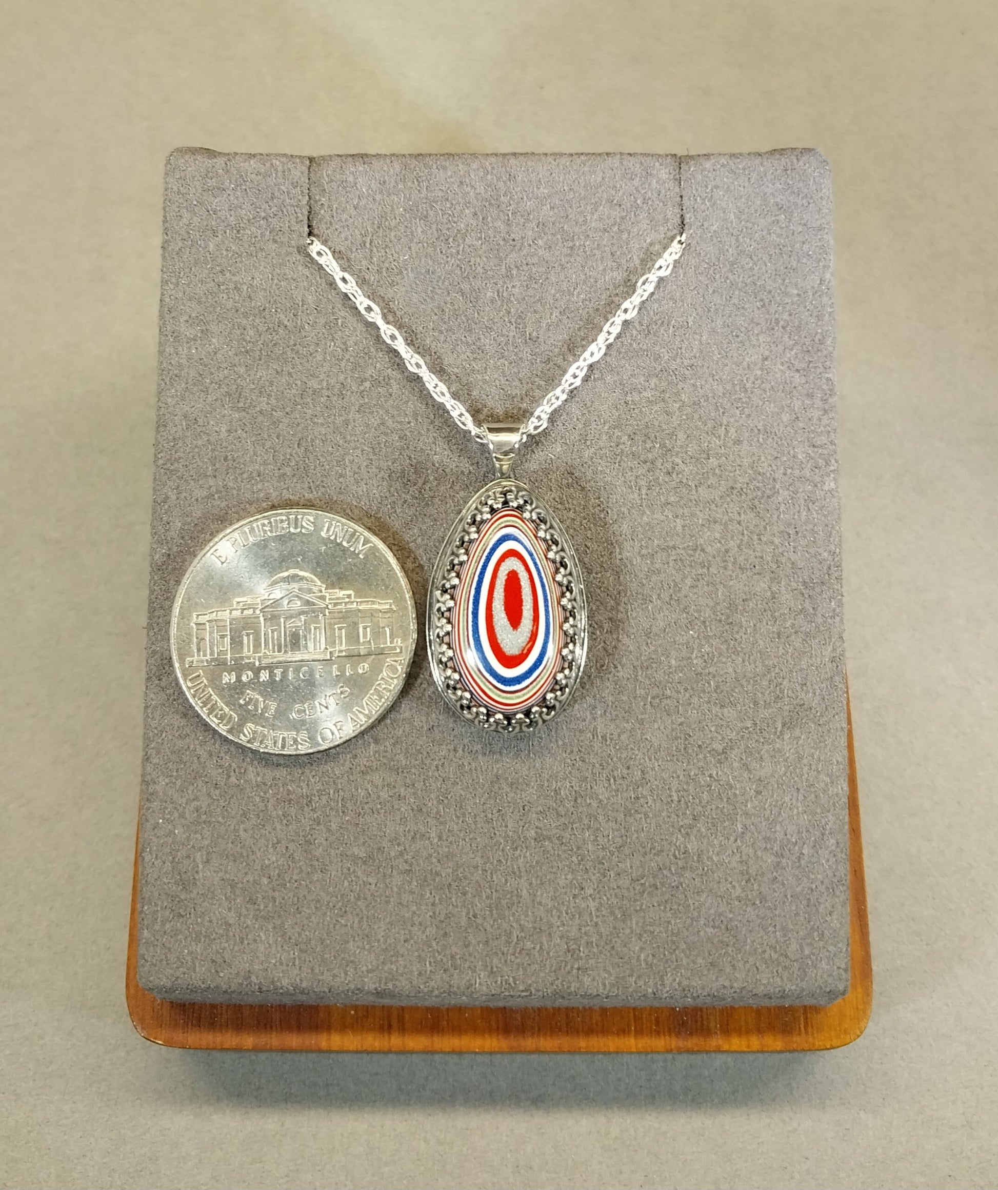 I made this beautiful fordite necklace using Ohio sourced fordite that occurred while painting parts for freight liner semis. This is a premium cut of this fordite type with bright colors and an agate like pattern. I cut the stone in a domed teardrop and set it in a solid sterling silver setting that I crafted for it. It has a decorative crown style bezel holding the fordite stone. I made the back with my hand forged and formed recycled sterling silver which I then textured with an abstract design. The pendant measures about 26 x 14 in mm. I antiqued the silver (intentionally darkened) to bring out the depth in the patterns of the silver. The chain for this piece is also solid 925 silver.