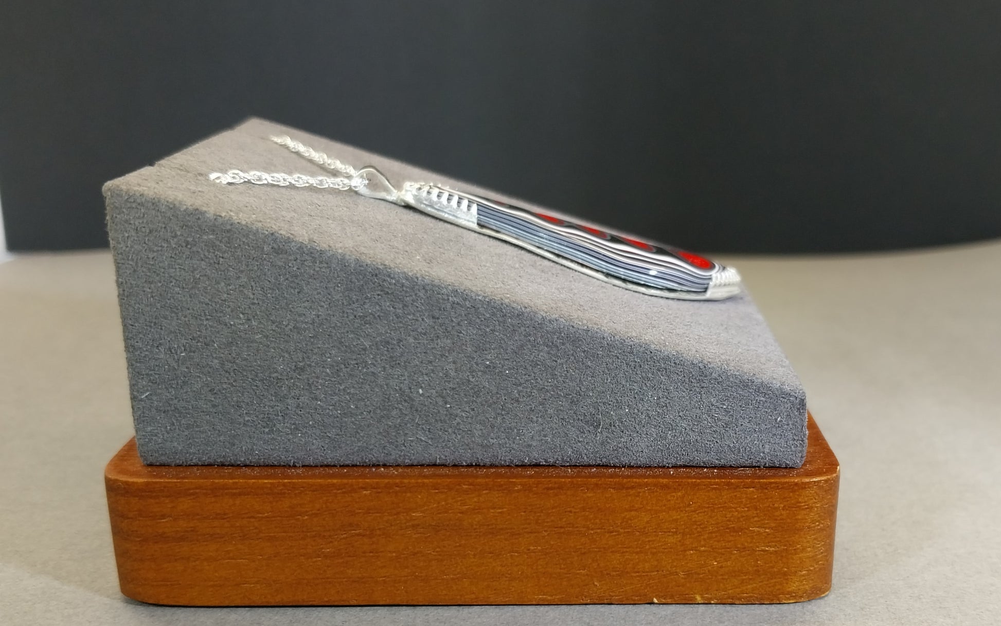 This is a large fordite solid sterling silver necklace featuring one of my favorite shapes to cut in fordite. I think of it as representative of a bird or flight but different people see different things in it which is part of what makes it so cool. This fordite is from the plant at Parkway in Toledo Ohio. It has beautiful colors with bright red and pink-tuscadero layers around the oval features. I cut this stone from a bubbly piece of fordite. The areas that are red are slightly recessed and represent the top most layer of paint. I made the back of the solid sterling silver setting with recycled silver that I hand forged and formed. I used partial bezels at the top and bottom of the setting to hold the stone. Along the edges I hand hammered some lines for texture that really accentuate the piece. The fordite has a good amount of metal flake paint that shimmers in bright light. The edge texturing also catches the light. I gave the back of the setting a stain polish. This piece really came out nice! The pendant is a larger size measuring about 2 inches or 51 mm tall. The chain is 20 inches in length and is solid sterling silver. This will ship in a jewelry box suitable for gifting. This would make an amazing gift...or you could treat yourself to it.