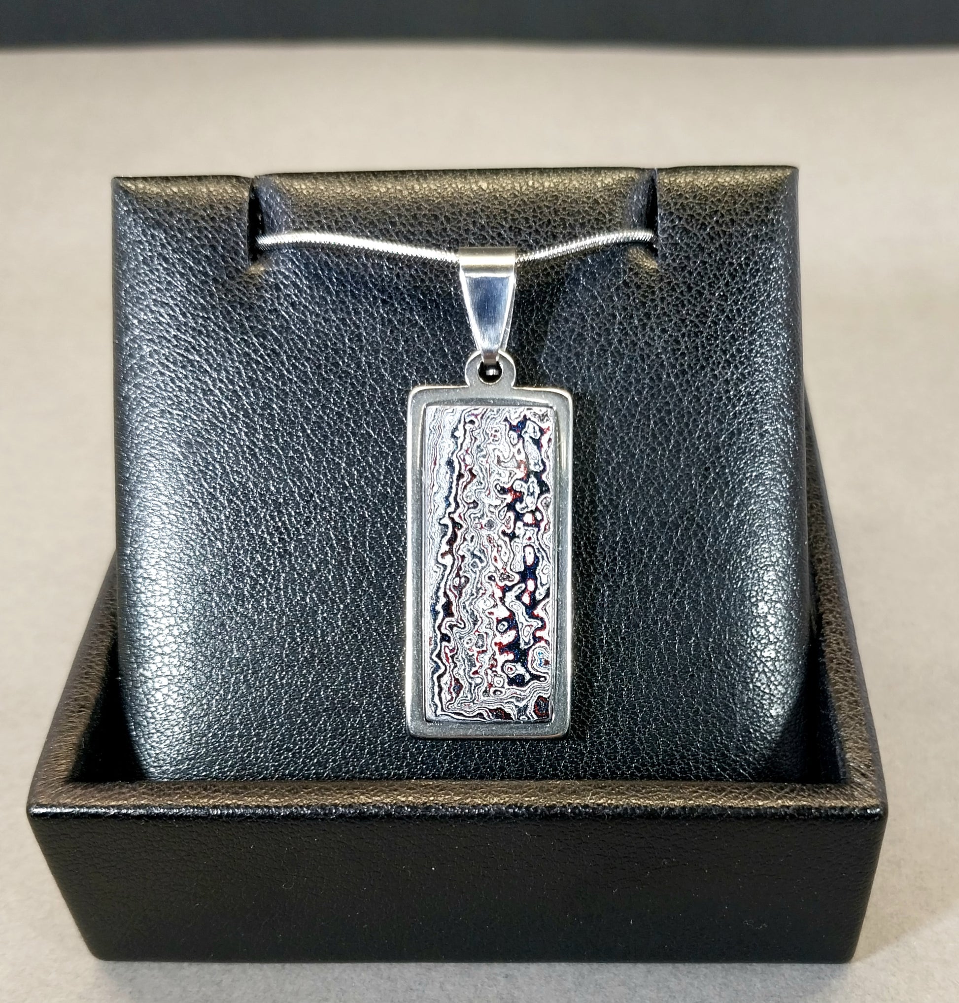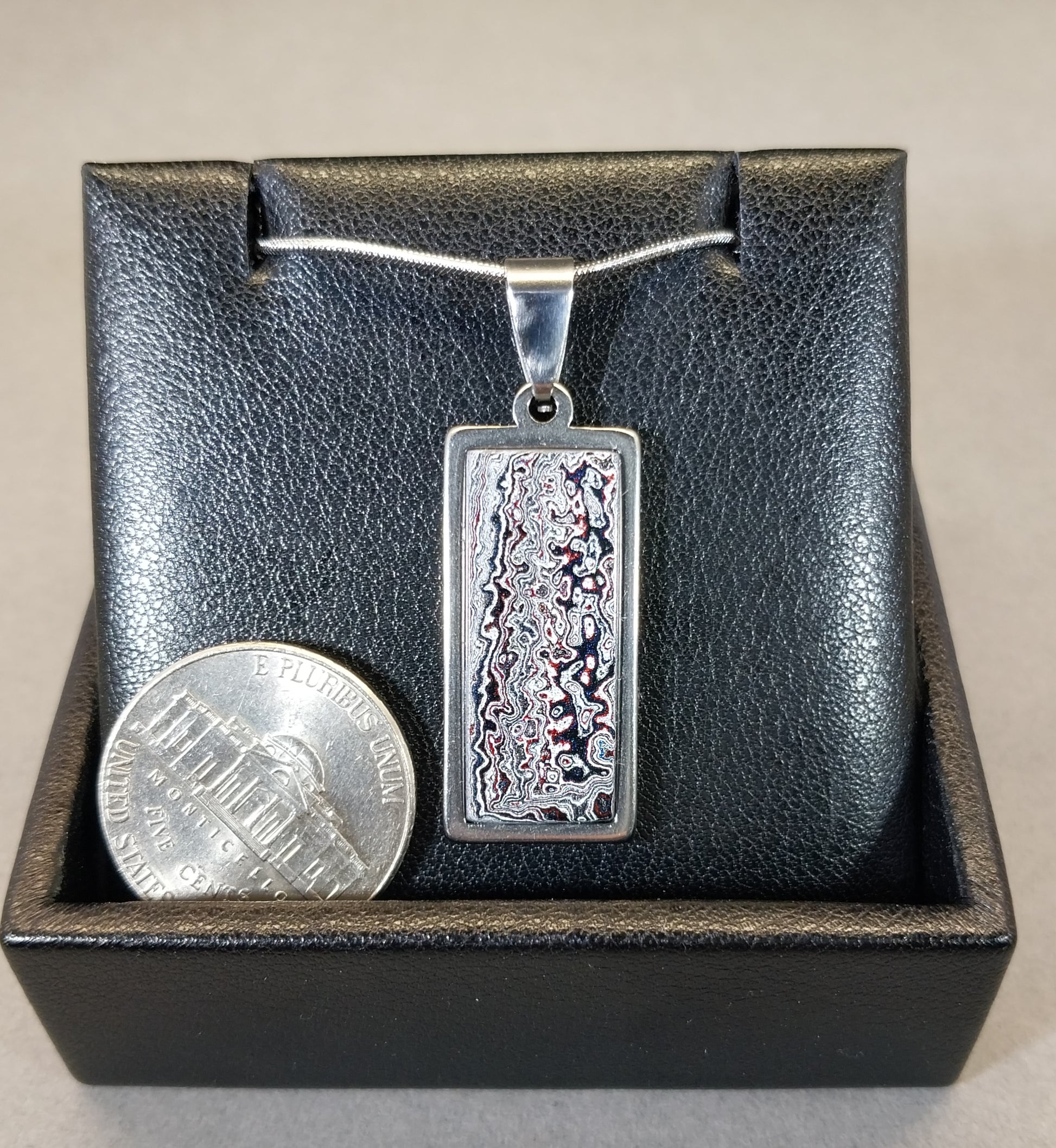 This stylish fordite piece can be worn by anyone. It's in a rectangle with a fordite stone that's about 24 mm tall. The setting and 20 inch chain are worry free stainless steel. See pictures for scale next to a nickel. This piece has lots of fine detail in the paint. The fordite is from lower Michigan and came from a factory that paints parts for new trucks and SUV's. This necklace will ship in a jewelry box suitable for gifting. Necklace only, picture props are not included.