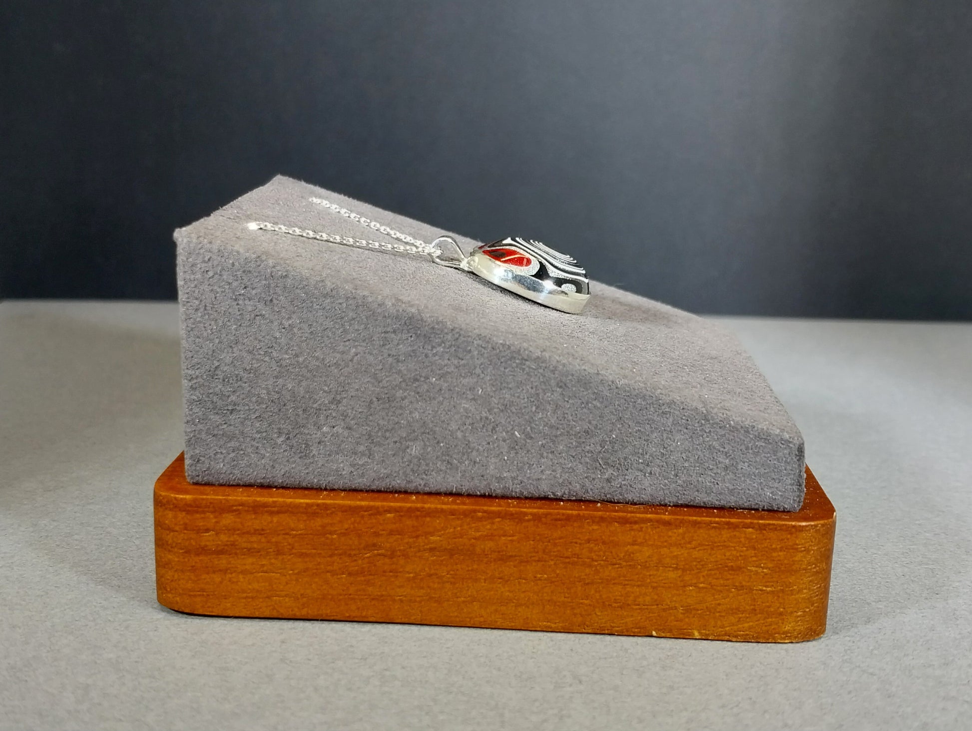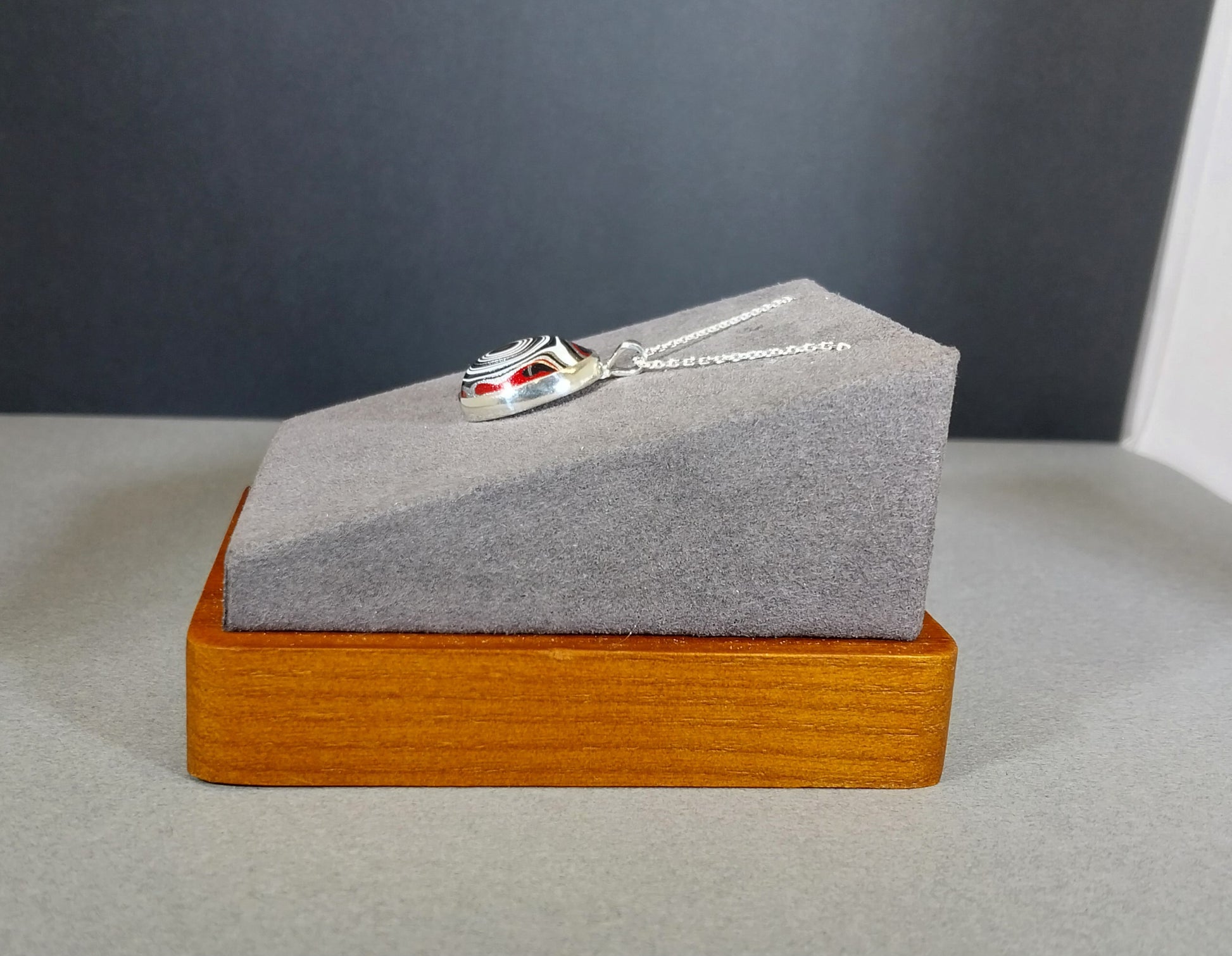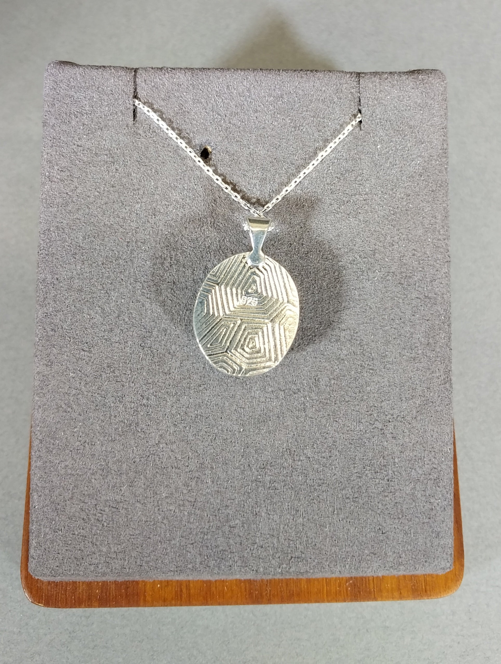 This is a great piece of lower Michigan sourced fordite that I cut. This piece is unique in that it has a bullseye as well as some wider bands in the paint around the bottom edge of the stone. This cut of fordite is big on metal flake and has colors you often see in pick up trucks. The pendant measures about 22 x 14 mm with the stone being about 17 mm tall. The chain is 20 inches in length and is also solid sterling silver. I cut and polished this piece of fordite and made the solid silver setting that holds it. I textured the back of the pendant which I made from recycled silver. It takes a unique section of fordite to make a piece like this. ;).