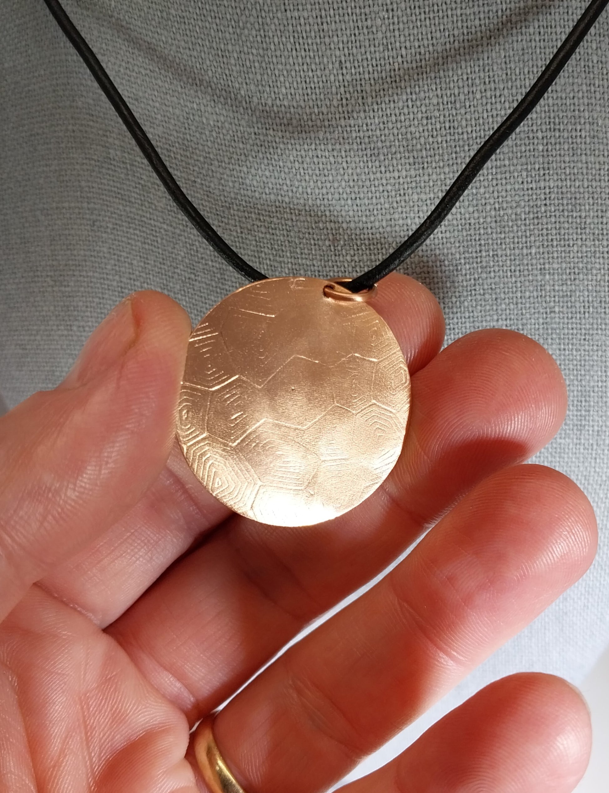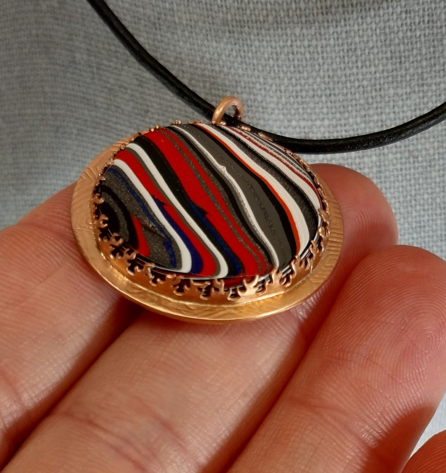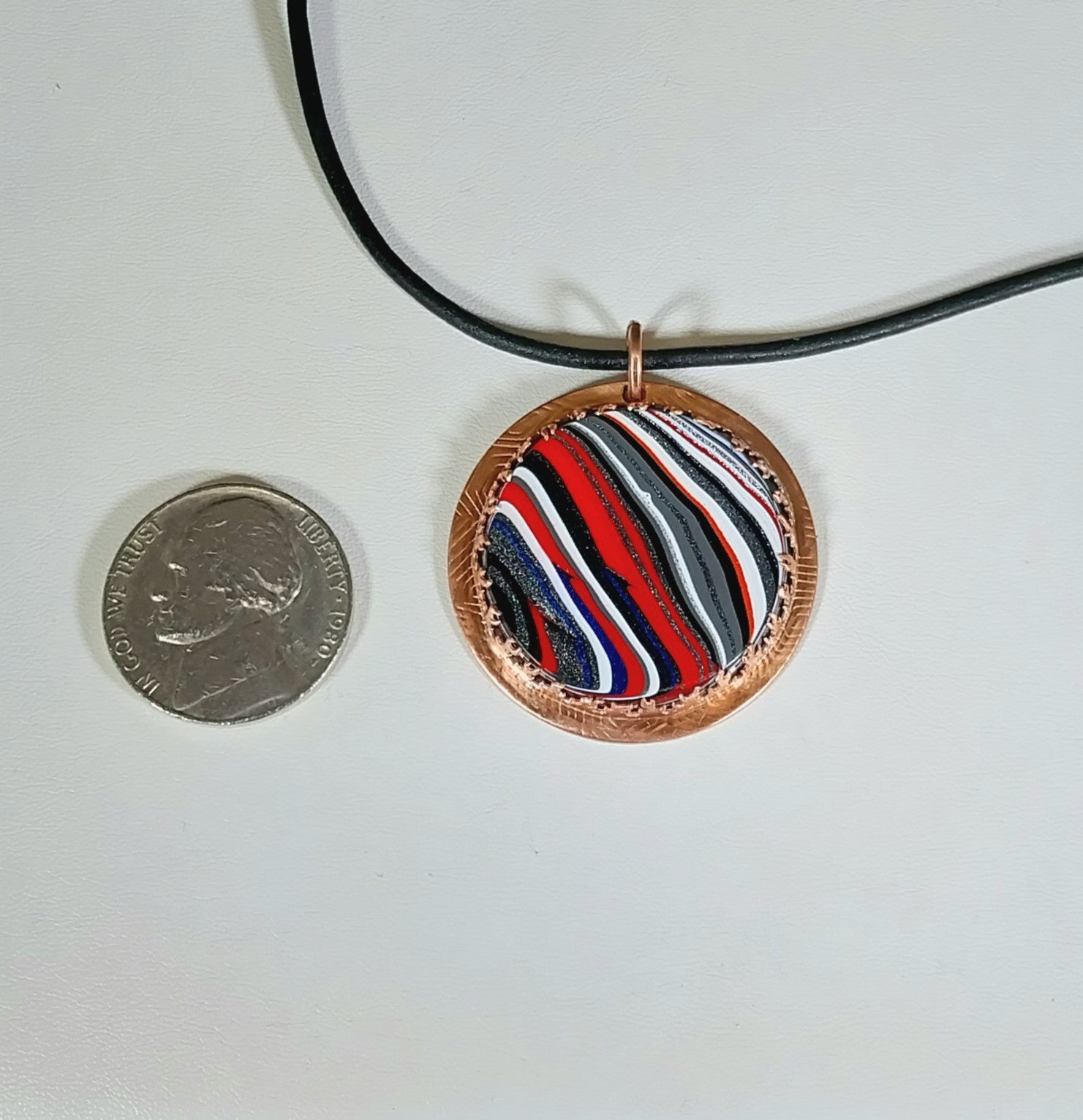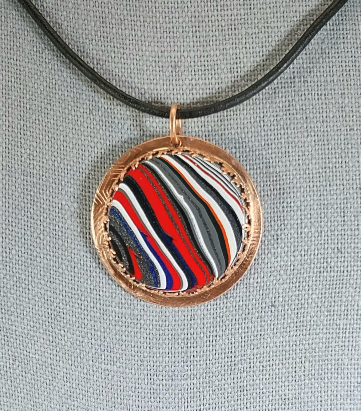 This is a pretty large fordite pendant that I set in copper. The stone is framed with a fire design bezel. The included cord is natural leather with copper components. This pendant is about 1.3 inches or 33 mm across. The copper is textured at the outside edge of the setting. The back of the piece is also lightly textured as well. I coated the copper to help prevent tarnishing.