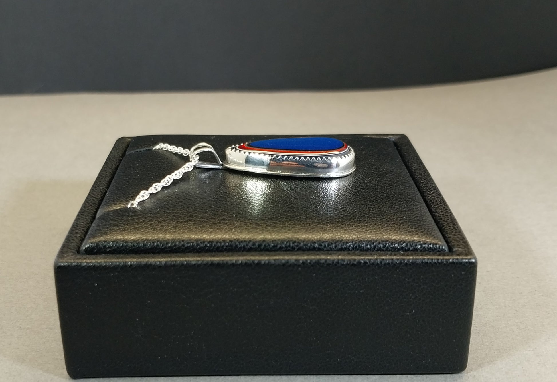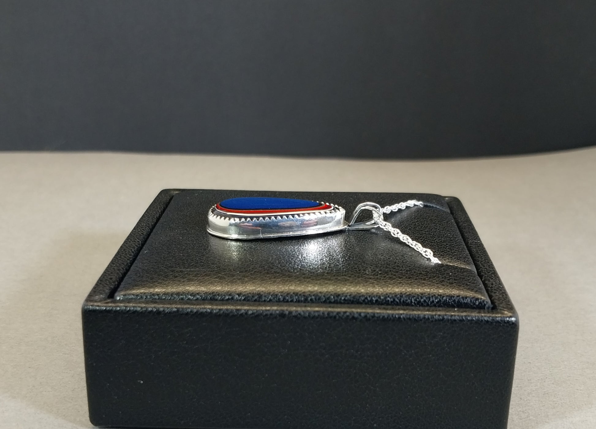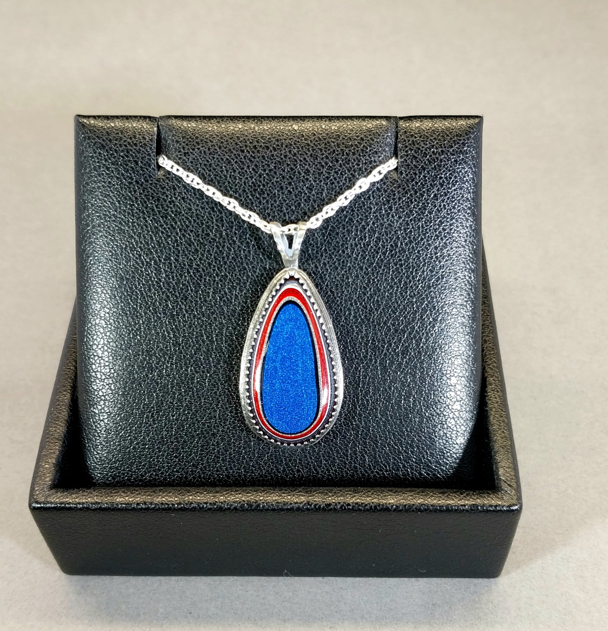 Fordite Necklace Bright Blue with Red and White Sterling Silver
