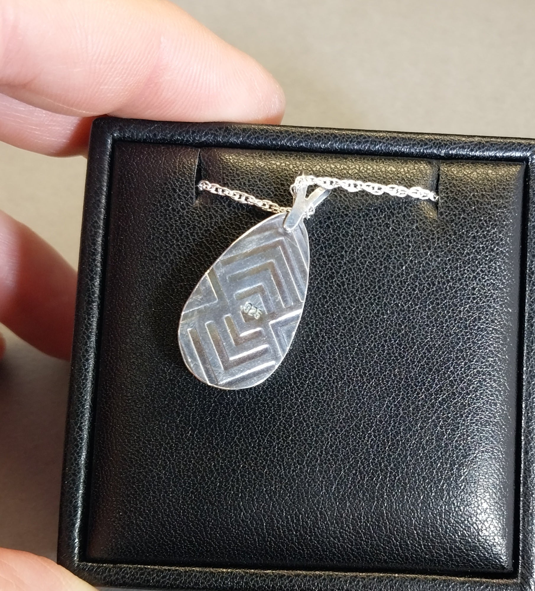 This nicely sized fordite silver necklace has cool blue metal flake rimmed with bright red. I handcrafted both the stone and silver setting for this piece. It would make a great gift! The pictured 20 inch chain is also solid sterling silver. The pendant measures about 31 x 14 in mm. This fordite is from the plant on Highway 69 Claycomo Missouri. It's Fordite in the traditional sense of the word. I textured the back of this piece and lightly antiqued the silver (intentionally darkened). I use recycled silver in my designs making my own hand forged and formed sheet silver so with fordite being upcycled this necklace has two recycled components.