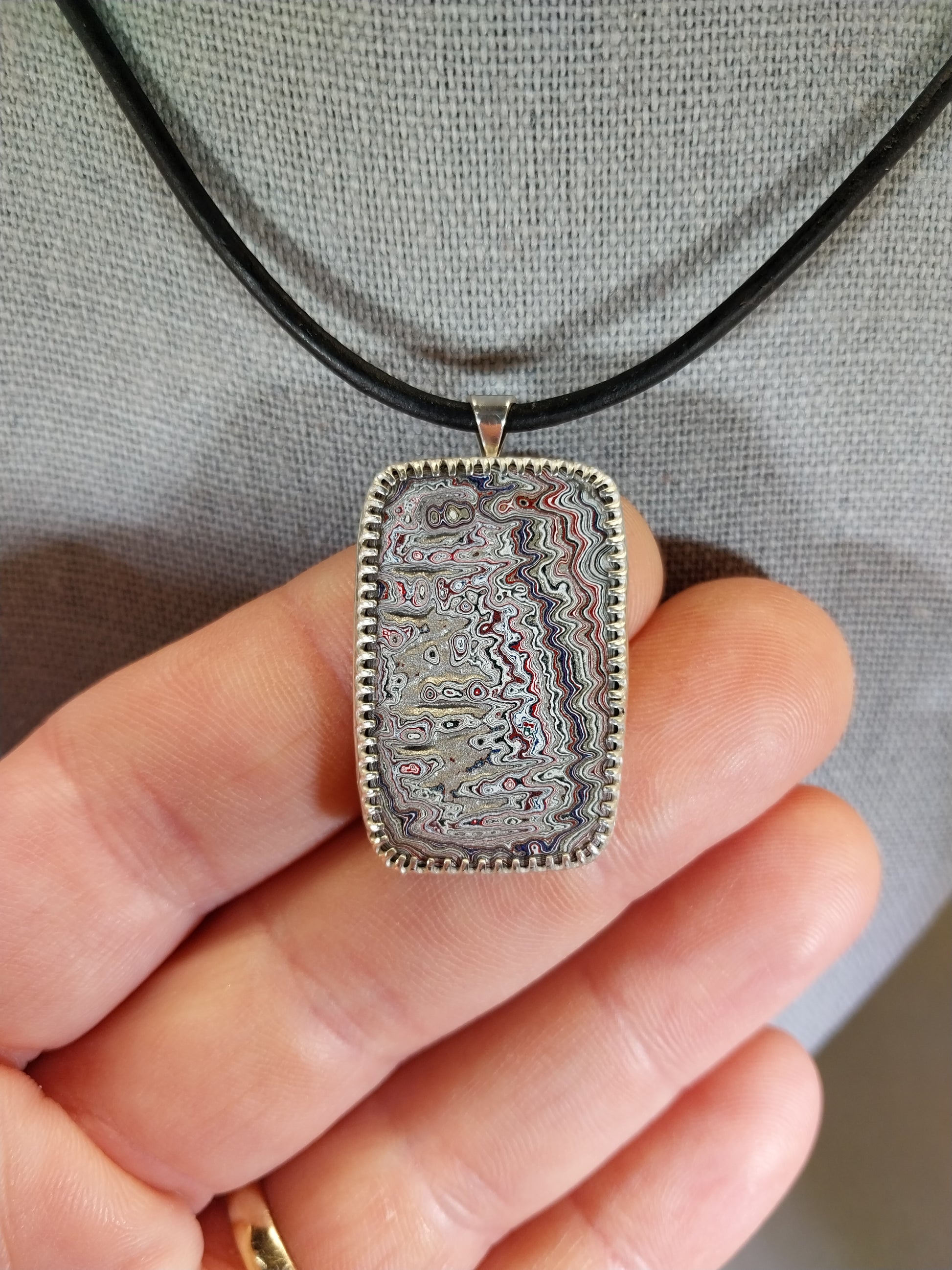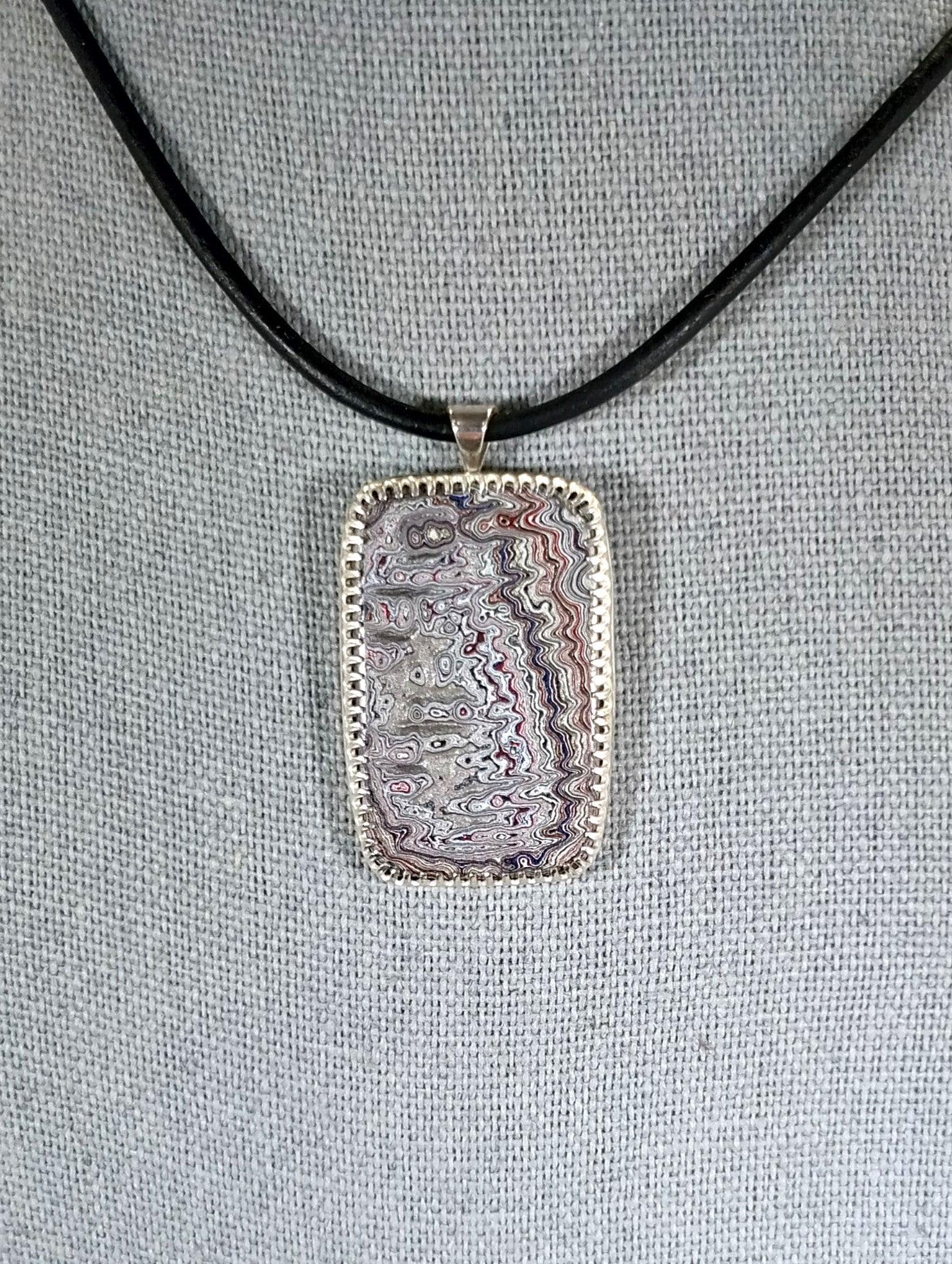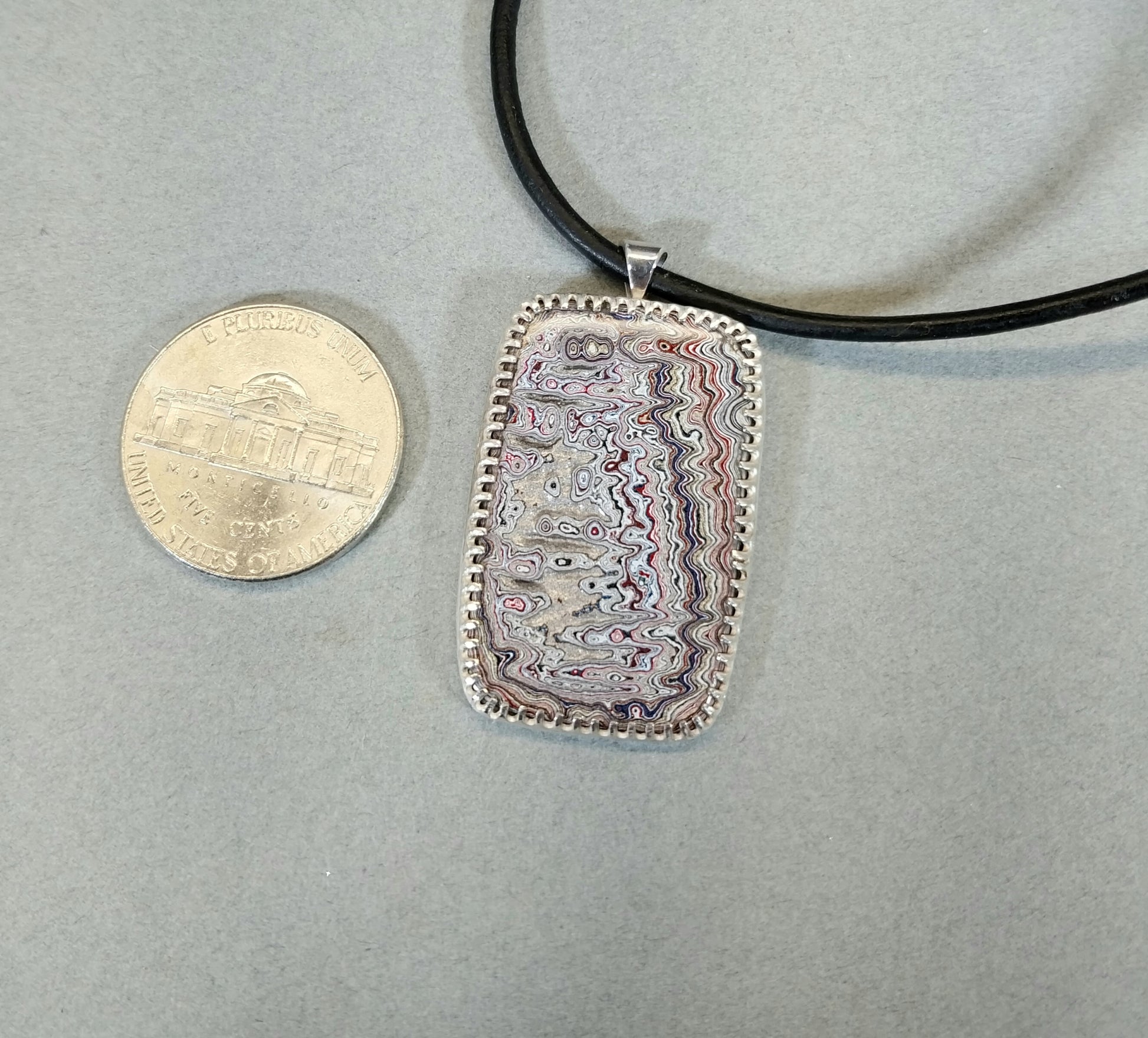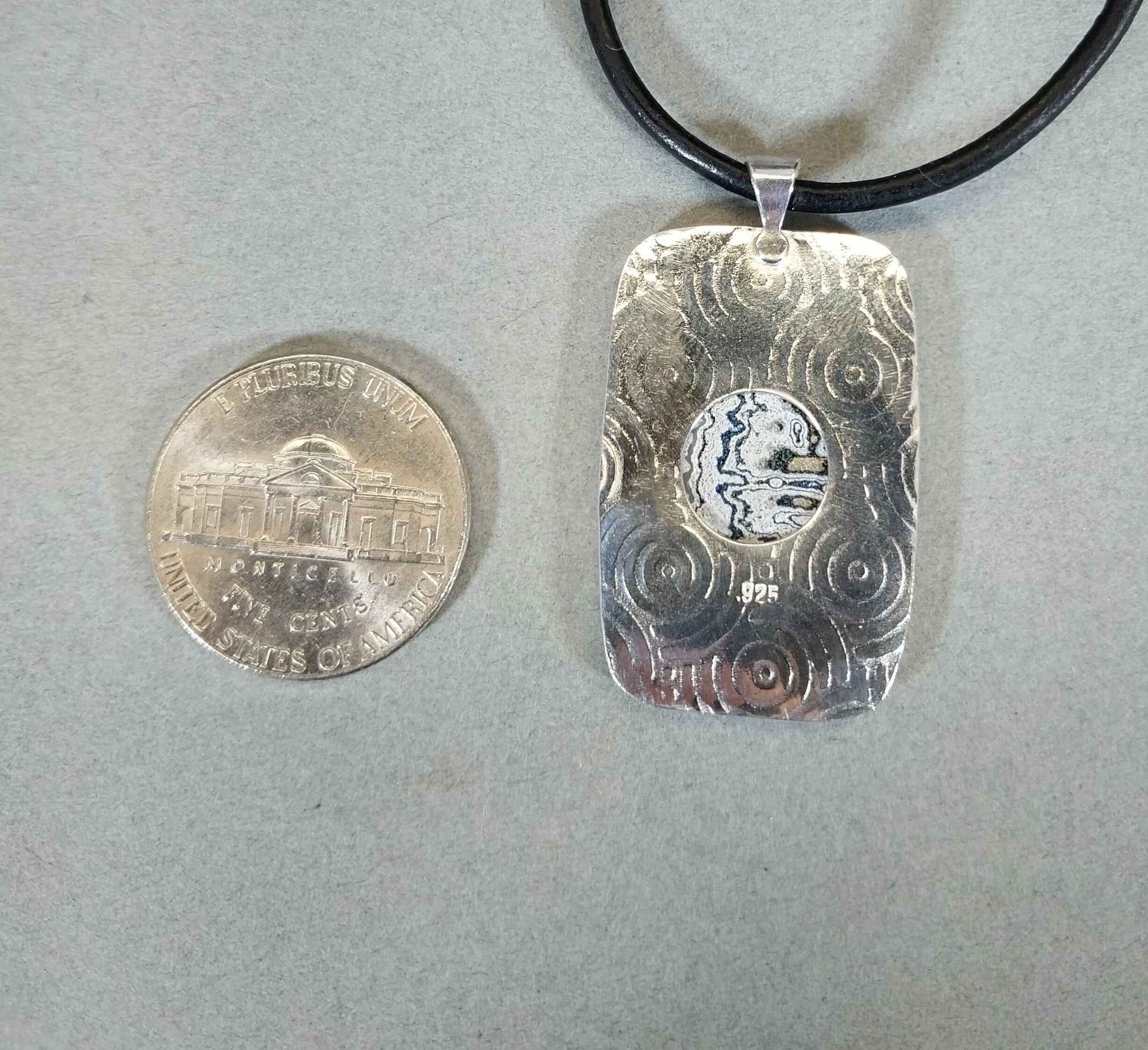This Michigan fordite necklace features a beautiful cut of truck fordite from the plant in Dearborn where the F250/350s are painted. I cut the fordite for this piece in a flat rectangle with rounded corners. There are several colors within this piece with very fine detailed patterns. I crafted the solid silver setting using hand forged and formed silver for the back which I added a light texture and round viewing window to. The pendant is on a natural black leather cord that's about 21 inches in length and has silver components. I designed this for customers looking for a men's piece but I feel this will look good on anyone. When you buy from us you're buying from the person who cut the stone and created the silver setting. Your purchase supports an American artist and small business. This pendant measures about1.4 inches tall or 36 x 21 in mm.