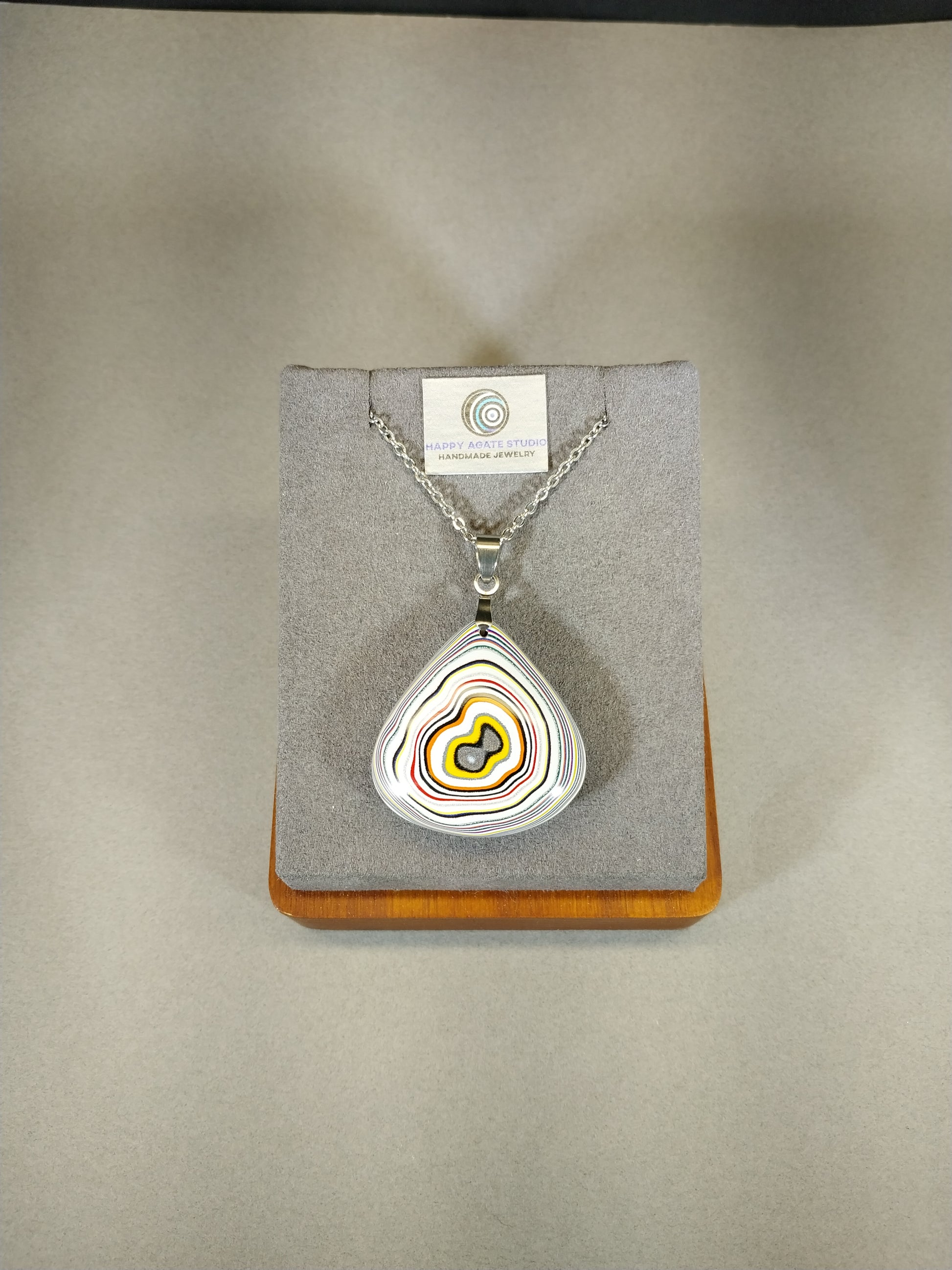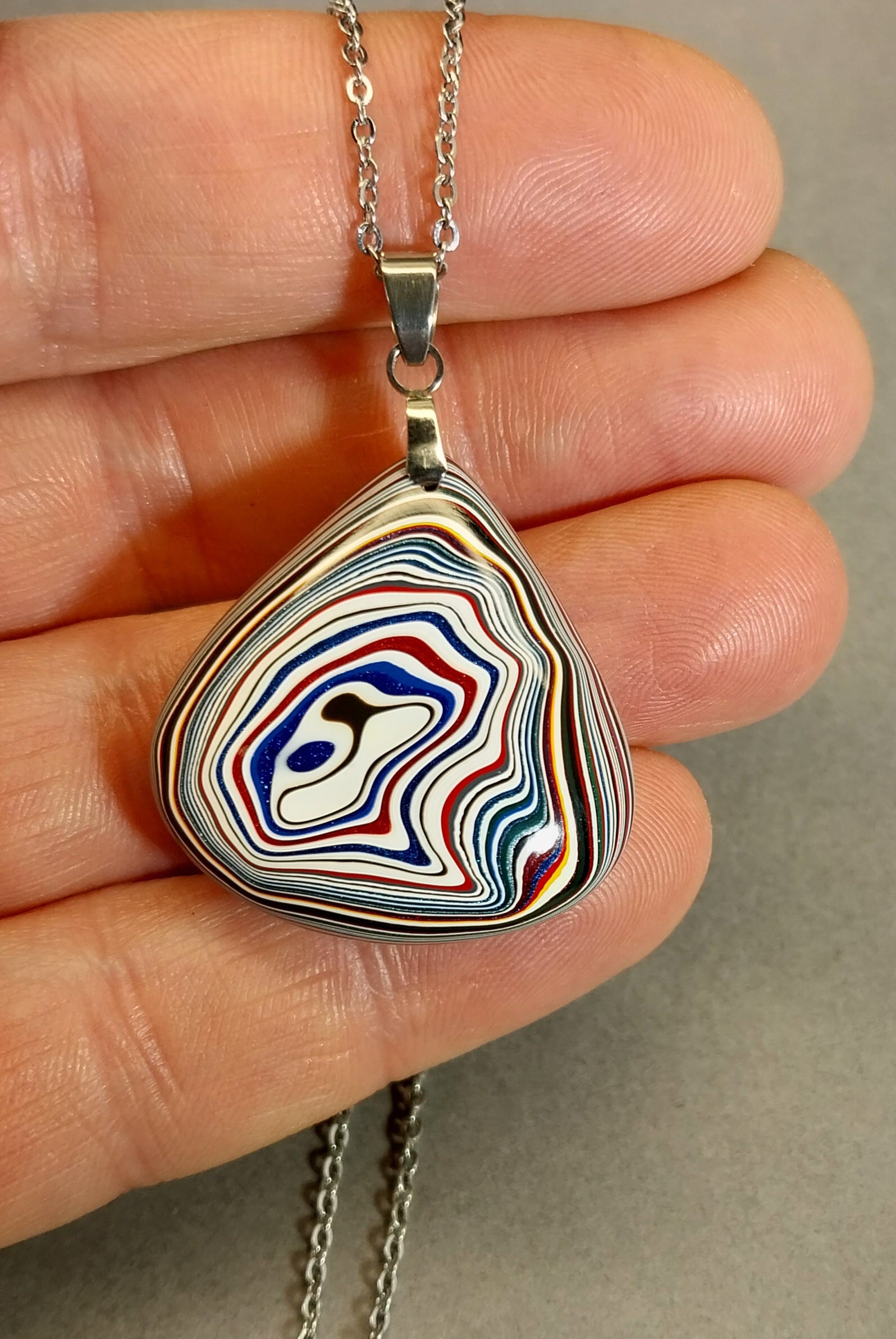 This is a beautiful fan shaped reversible fordite necklace with unique colors and patterns. The second picture shows the other side. The bail that secures the fordite and included 20 inch chain are worry free stainless steel. This fordite is from a plant in Chillecothe Ohio that paints parts for freight liner semi trucks. The fordite measures about 30 x 29 mm.