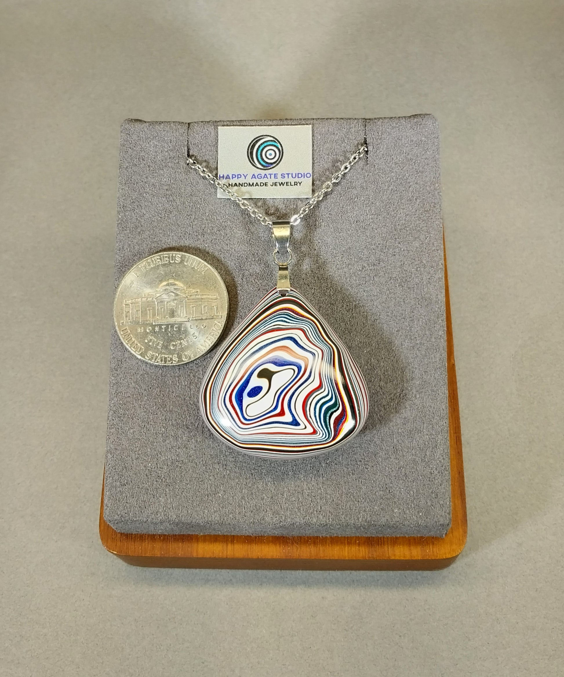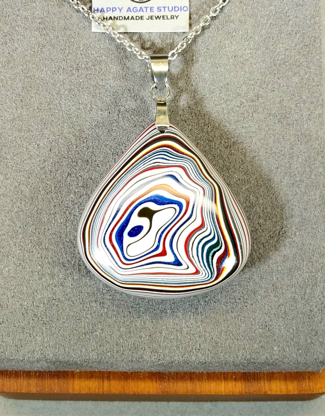 Fordite is recycled automotive paint sourced from automotive factories as well as manufacturers who paint parts for new vehicles. It forms in thin layers as car parts are painted on the racks that hold them in place. After hundreds of trips through the booth where the paint is sprayed and then baked the excess buildup is scraped off the racks. We buy this waste paint in rough chunks and recycle it into beautiful jewelry. It can take hundreds of layers of paint to make a one inch thick piece of fordite. The original fordite came from Detroit and since then it’s also synonymously known as Detroit Agate. There is very little fordite that is truly vintage. Most that’s available is modern i.e. current or within the past 15 years. We prefer modern fordite as it’s water rather than lead based paint. There are many different fordite types and some are more valuable than others. You’ll find in our fordite listings we refer to the plant location that the fordite originated from rather than listing specific auto manufacturers or vehicles. You can easily google the plant location and get a list of vehicles painted there. We love to talk fordite so if you are looking for a specific type or color odds are we have it so please send us a message. All of our fordite is authentic.
