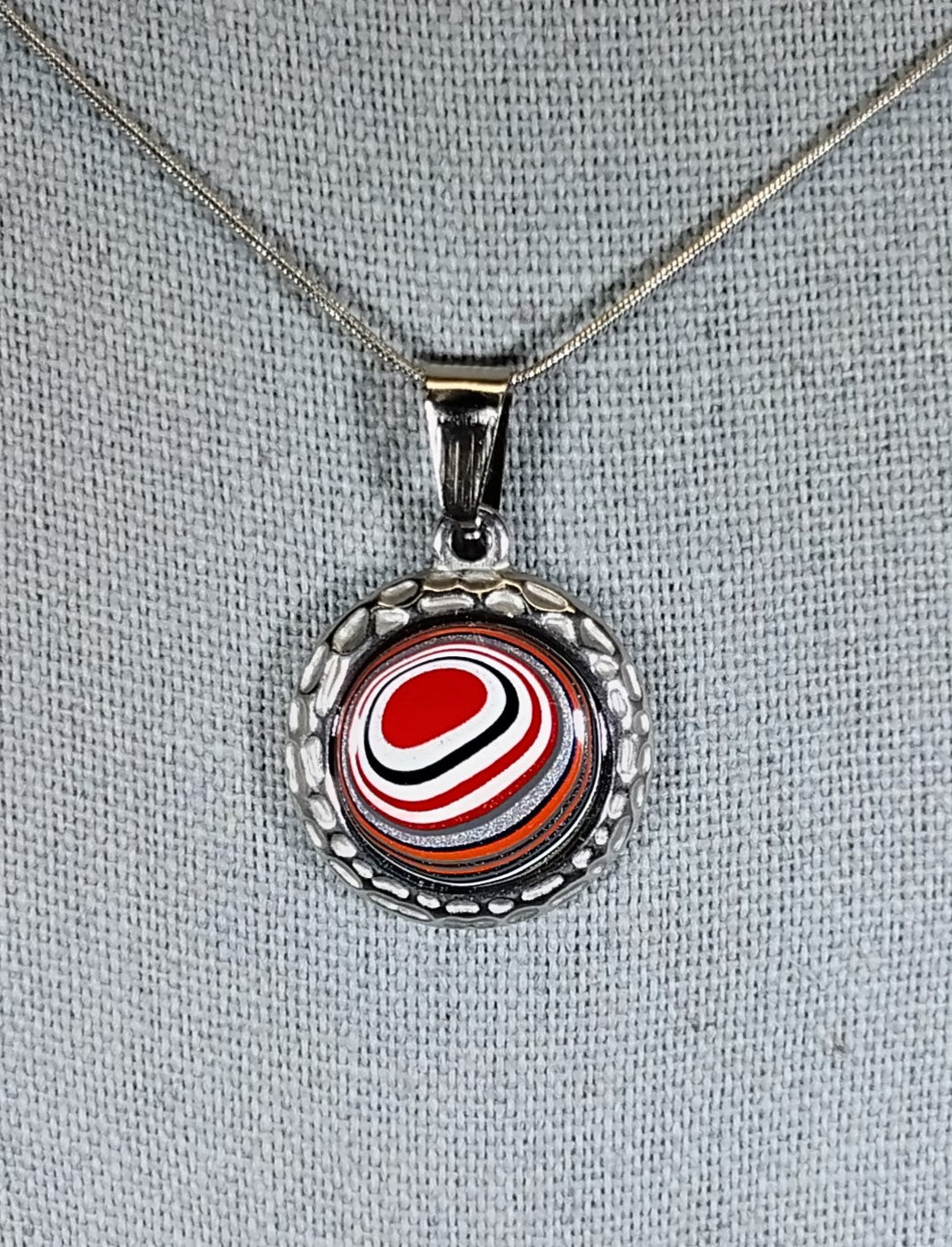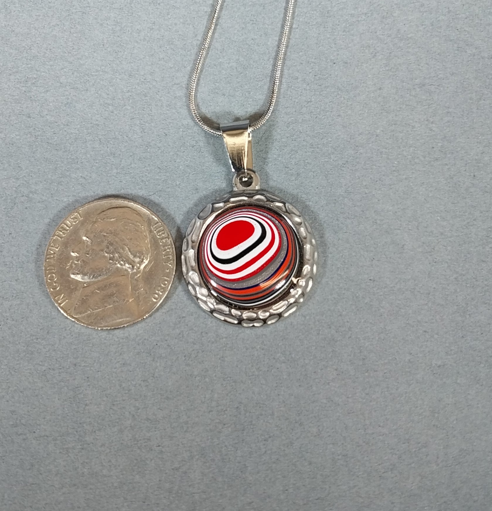 This fordite necklace is beautifully colorful. The fordite is in a circle that is domed. The setting and included chain are worry free stainless steel. This is Ohio motor agate that occurred as a result of painting vehicles at the Parkway plant in Toledo. The pendant is about an inch tall with a stone that's about 16 mm across. The necklace is 20 inches in length.