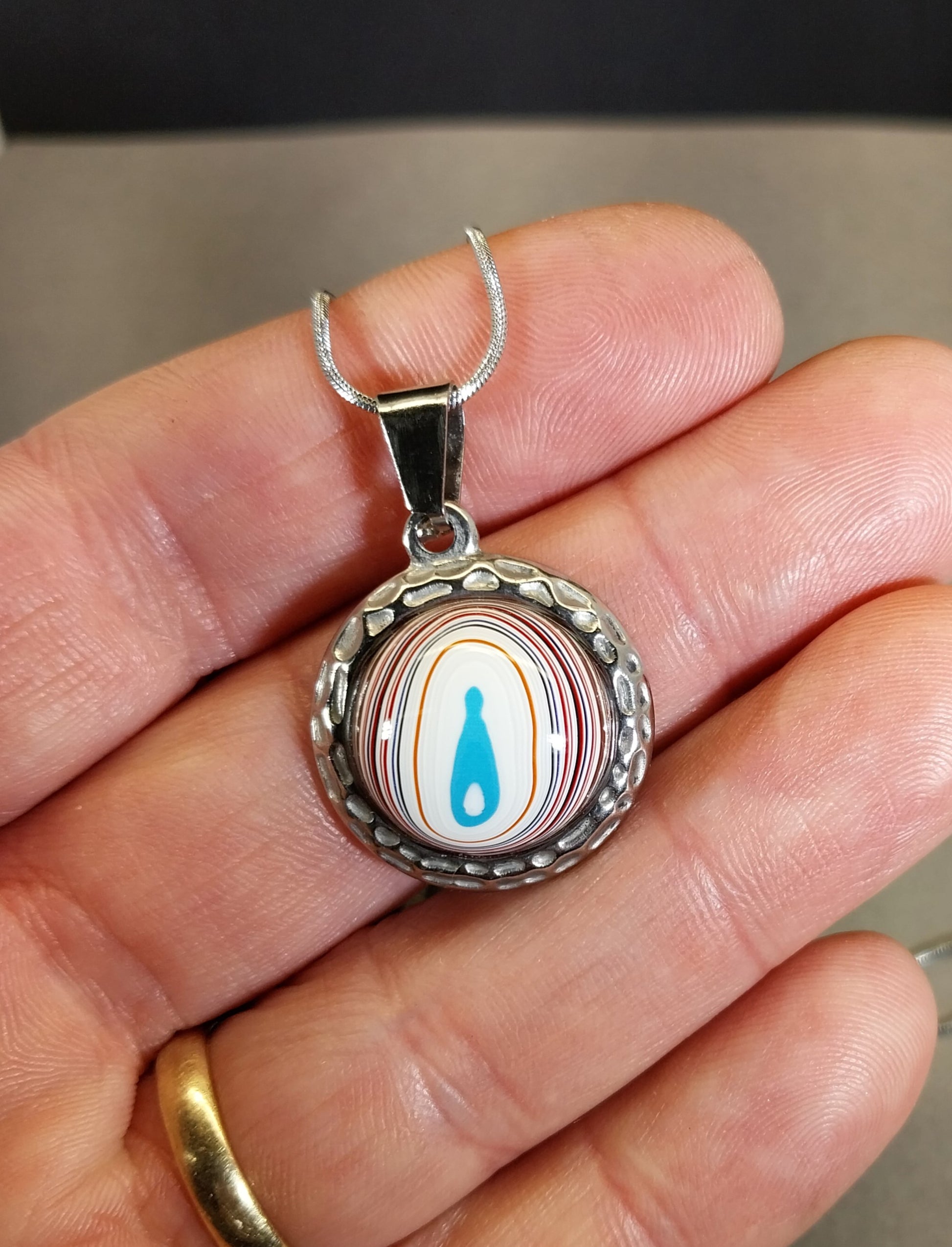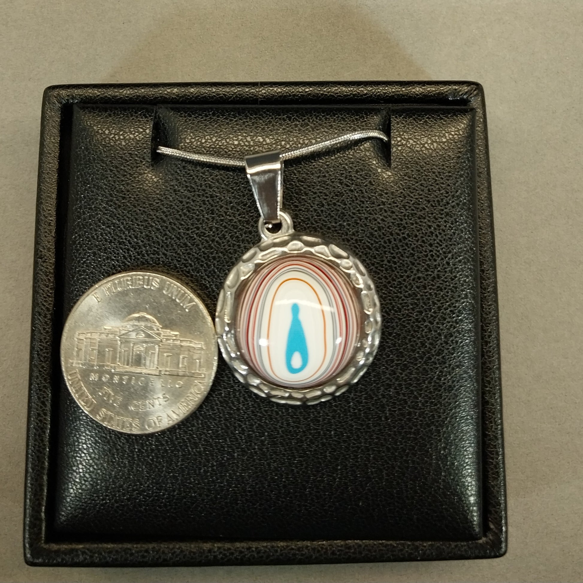 This fordite necklace is beautifully colorful. I really like how the light blue stands out against the white. I cut the fordite stone in a domed round. The setting and included chain are worry free stainless steel. This is Ohio motor agate that occurred as a result of painting vehicles at the Parkway plant in Toledo. The pendant is about an inch tall with the stone being about 16 mm across. The stainless steel snake chain is 20 inches in length. Pictured necklace holder is not included.