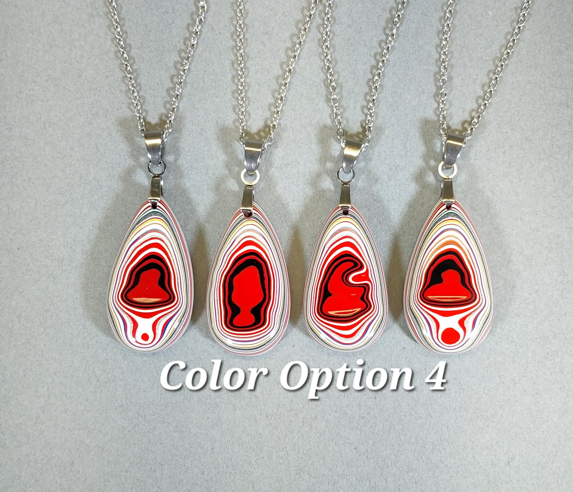 This Happy Agate Studio listing allows you to choose a color scheme in the fordite necklaces available. See the pictures for the pendants in the colors available in this listing. View the color options (1-7) by looking at the pictures and purchase the option of your choice. We will send one of the pendants pictured from the color option you pick. The pieces in each option are similar having been cut from the same batch of rough fordite. You'll get one from the option you select but this is not a select the specific pendant listing. If you prefer to choose an exact piece see our shop for hundreds more handmade fordite pieces. These pendants are all roughly the same size and shape with small variations between them. The chains and bails that hold the stones are worry free stainless steel that won't turn or tarnish. The pendants are about 1.2 in height by .63 width in inches with a bit of variation in size between each. Overall thickness can vary from one to another. This is modern fordite which is water based paint. Option 1 is Michigan sourced fordite from a plant that paints bumpers grills and wheel flairs. Option's 2 and 3 are from Chillecothe Ohio and formed as a result of painting parts for big rig freight liners. The remaining color options are from the Parkway Toledo Ohio plant. When this listing gets low in stock I update it with new color options. We're here to answer any questions you may have. By purchasing you agree you have read this description and understand how this listing works.
