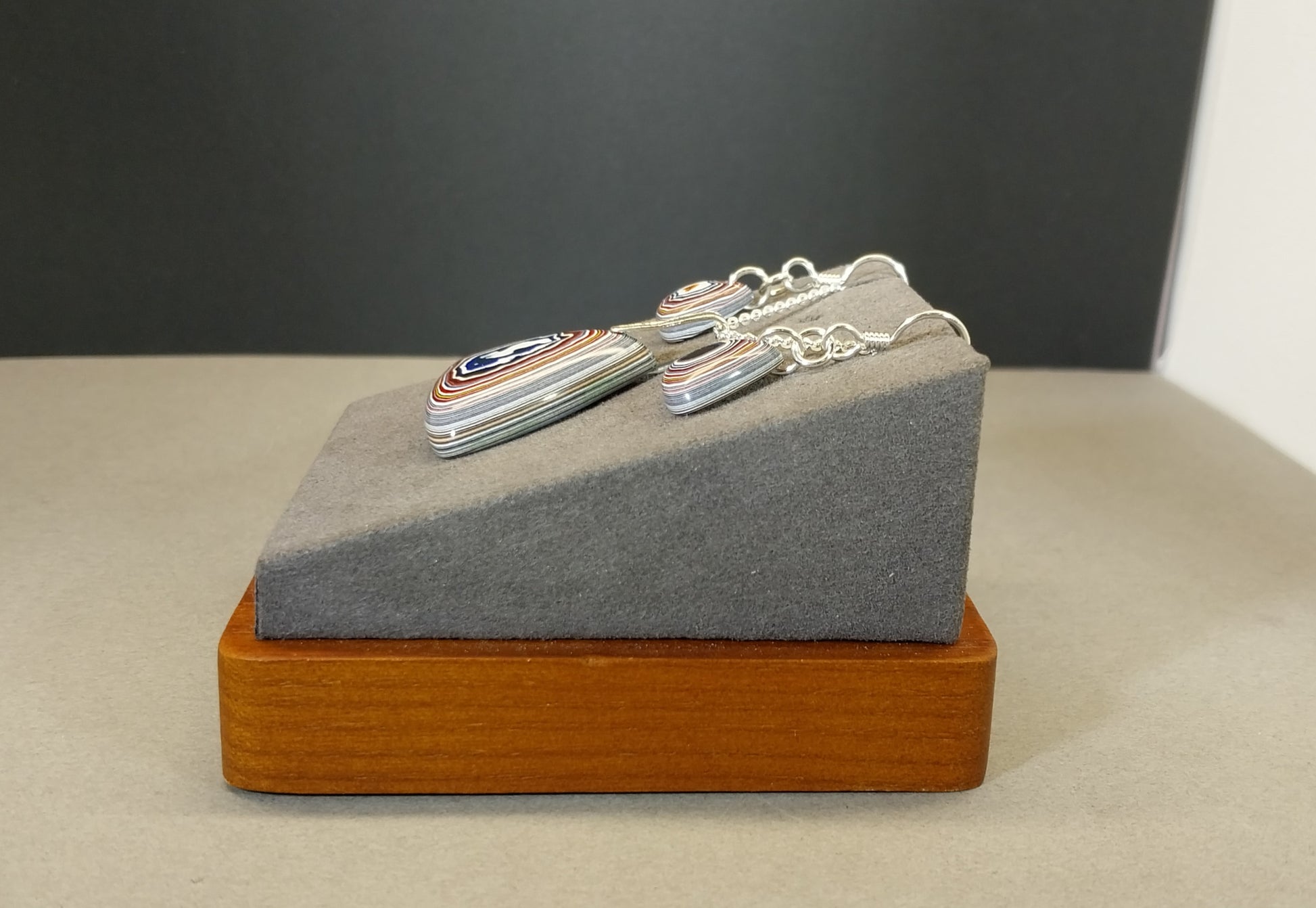 This fordite set has beautiful colors and great patterns. The pendant stone is a nice sized triangle that's top domed with a flat back. It measures about 27 mm tall. The bail and chain for this set are solid 925 sterling silver. The earring stones are about 13 mm tall. All of the components for the earrings are are solid argentium sterling silver. This set would make a great gift. The fordite is from Ohio and occurred as a result of painting parts for big rig semi's.