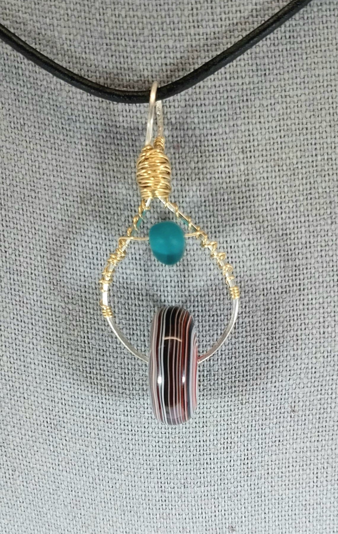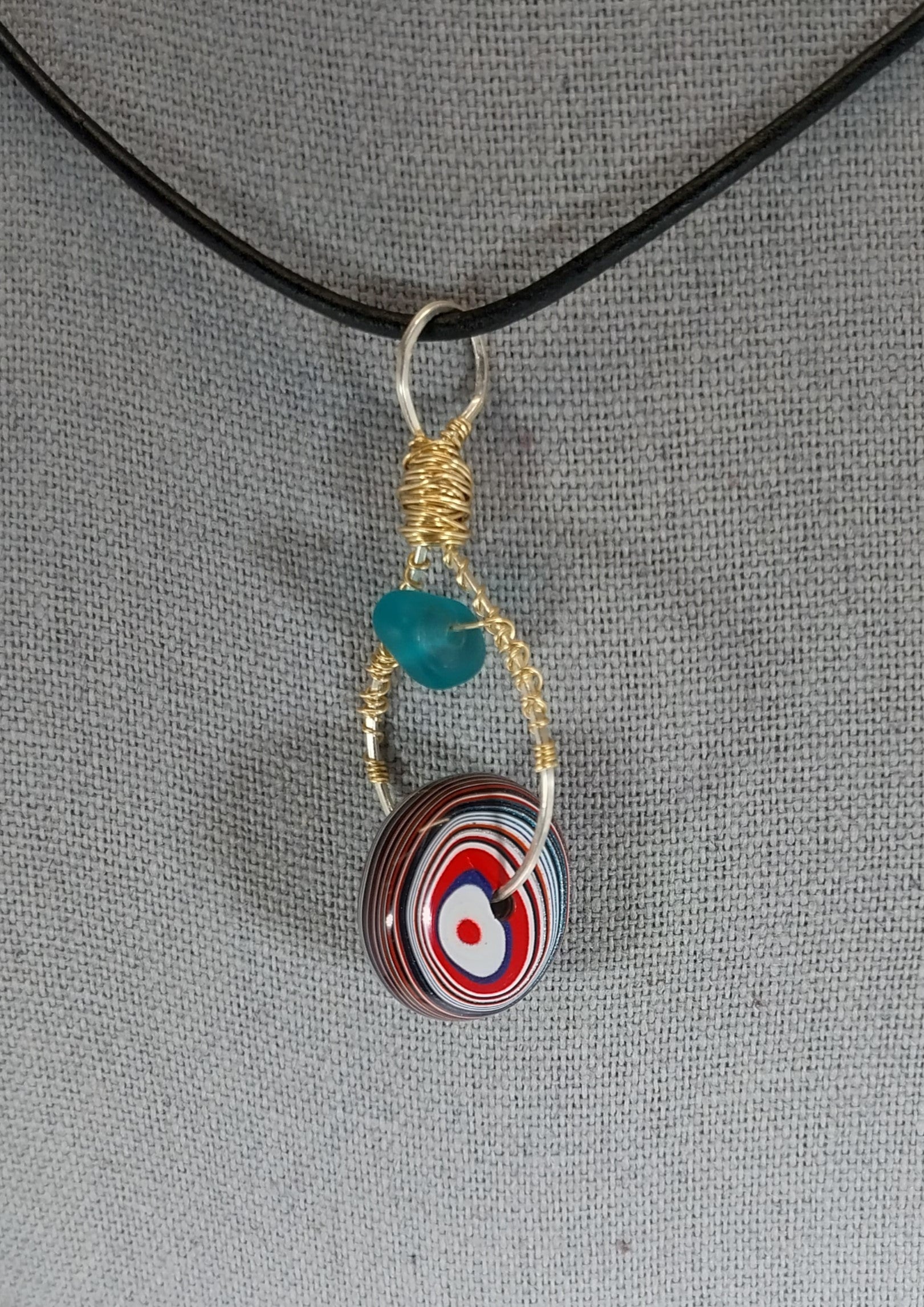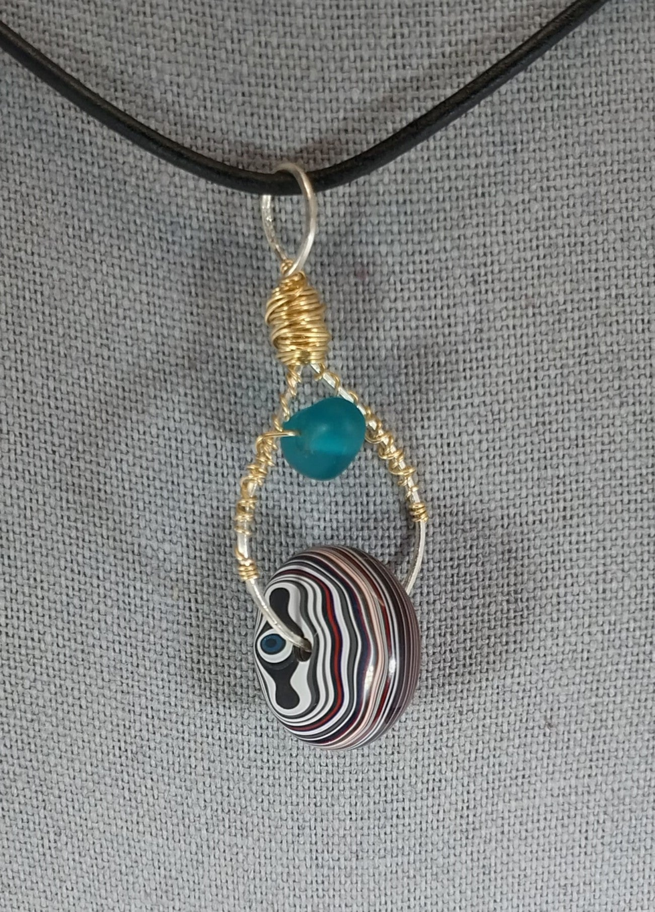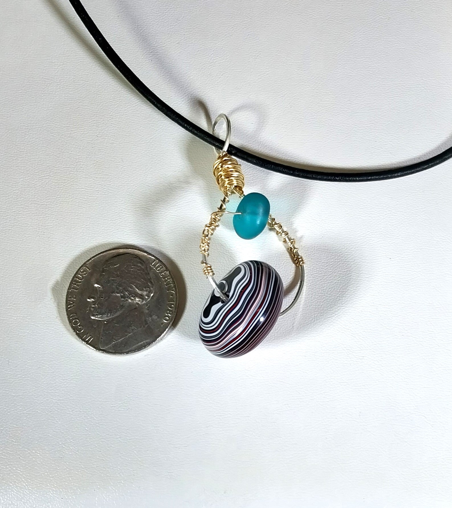 This fordite necklace was a collaboration between Sarah and I. The bottom bead is Toledo Ohio fordite and faces forward like a wheel but switches from side to side as you move. The wire frame allows the bottom bead to spin. The top bead is blue beach glass. They are wire wrapped in sterling silver and gold filled wire. The fordite bead is about 18mm wide. It hangs on a leather cord with sterling silver components. This is a very unique necklace made for someone who appreciates unique designs.