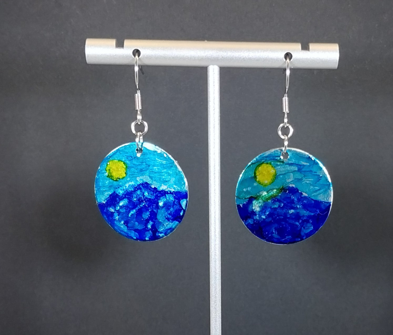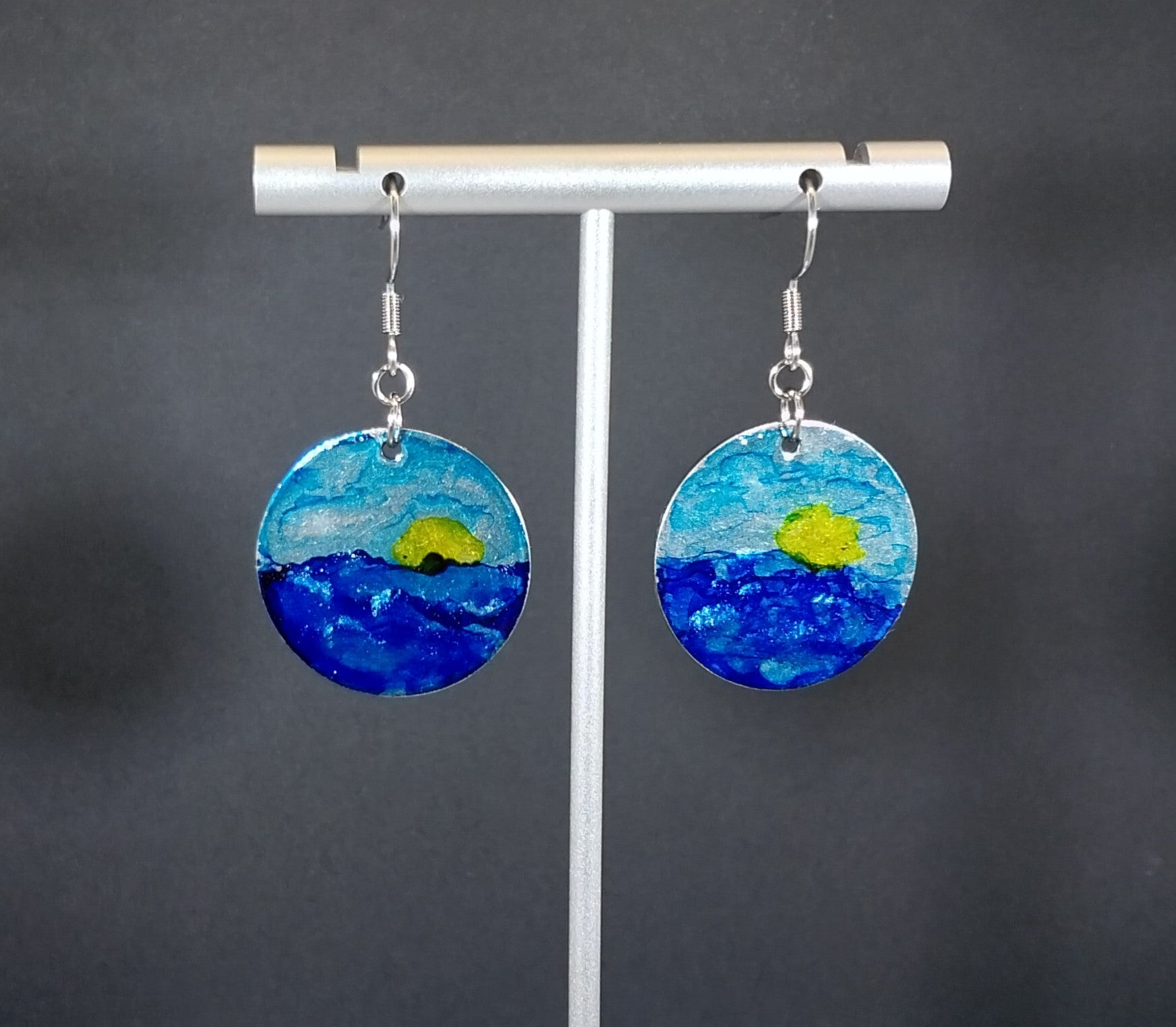 This pretty pair of hand painted earrings feature the sun over the water. I've been experimenting with abstract art and while I really like those pieces this less abstract design has been the most popular thus far. I made these sets with stainless steel rounds that measure about 25 mm across so this is a good sized pair of earrings. The ear wires are surgical steel. Sarah has metal sensitivities to most steel but she can wear these ear wires. The front is sealed to protect the design. These are not stock photos, we don't do those. You get the pair you choose.
