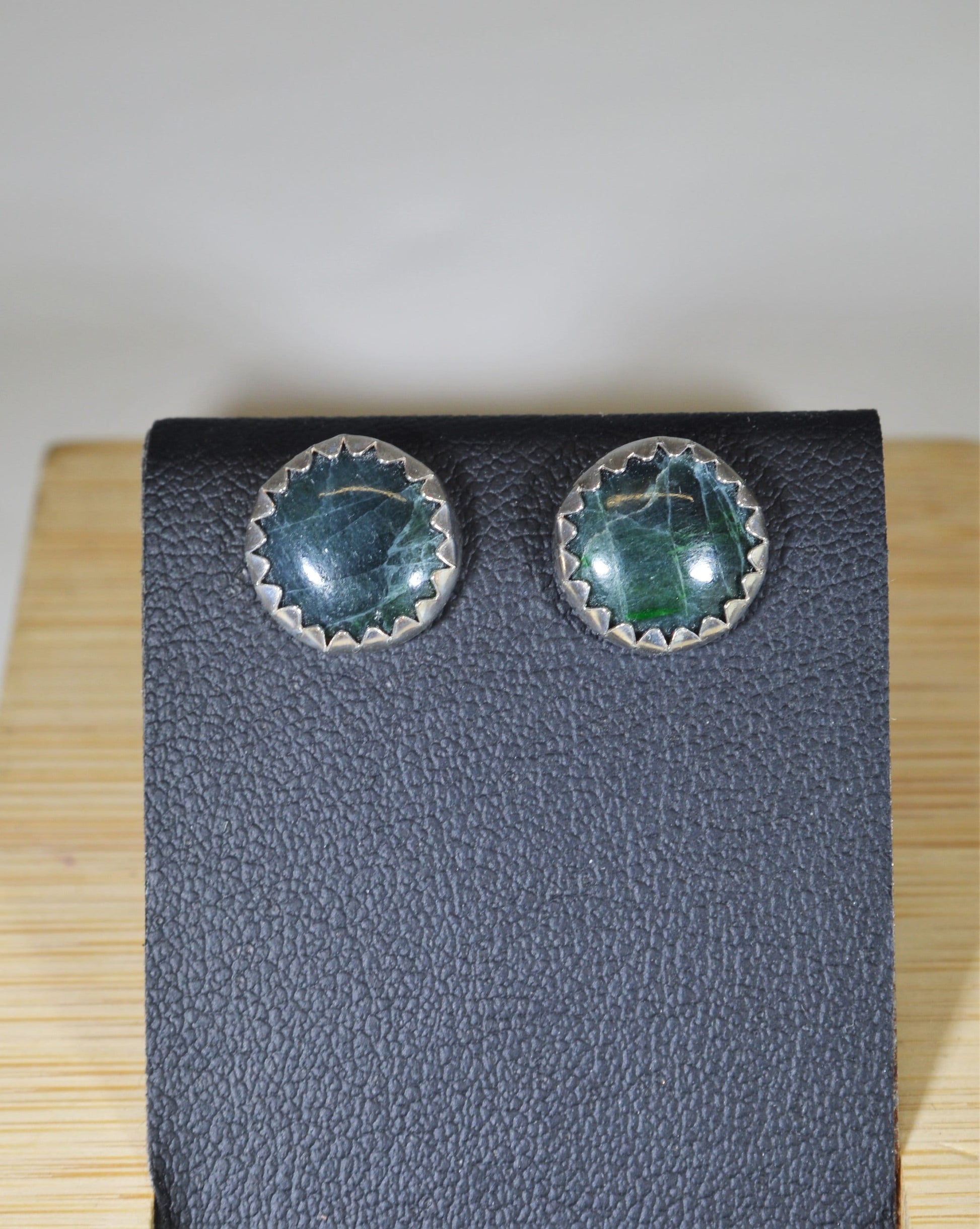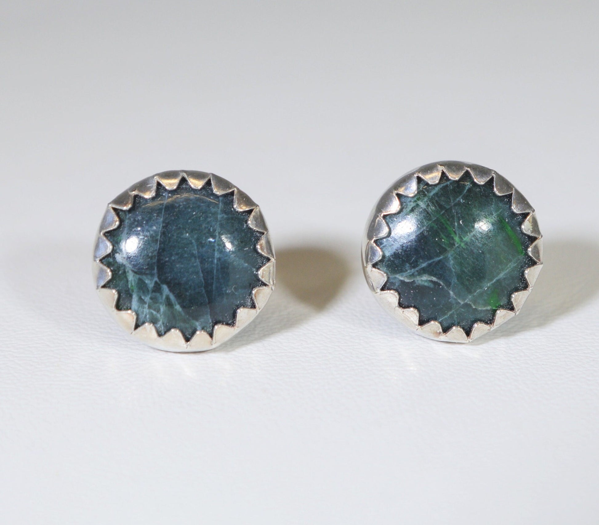 These beautiful silver earrings are set with maw sit sit jade that we cut and shaped. This is a rare stone. The color of these earrings is a deep green with black, some areas of lighter green and white. The settings are solid 925 sterling silver. The stones are held with serrated bezels. These earrings are about 10.5 mm across. The posts are just under 10 mm long.