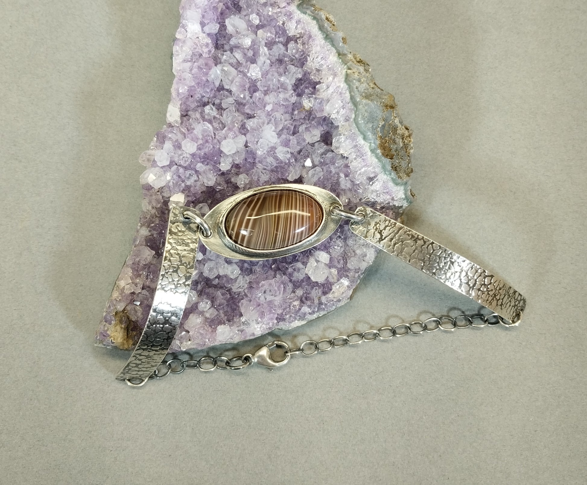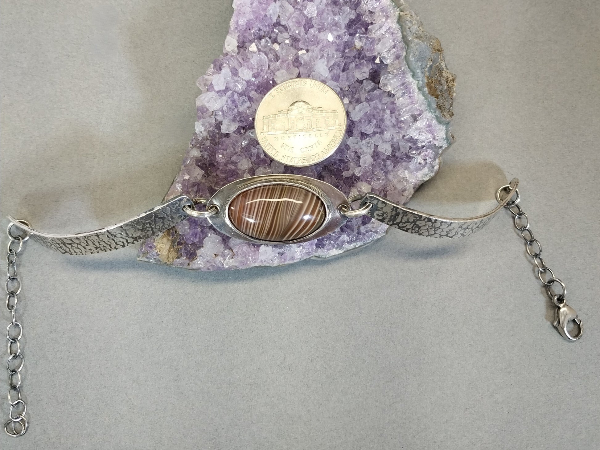This Lake Superior Agate silver bracelet features a beautiful banded laker in brown and white. This agate has really nice contrasting colors so it's distinctly visible from a good distance. I crafted the bracelet setting in solid sterling silver. This bracelet is adjustable with a lobster clasp closure. It's measures about 8.5 inches long overall. I added a pebble like texture to the outside of the band and textured the bezel that holds the stone as well. All but the chain and lobster clasp closure on this bracelet are my hand forged and hand formed recycled silver. It's quite a process to melt and form silver in this way but it leads to a truly handmade piece. The agate is about 23 x 14 mm so this is a good sized agate. It's one we found in Wisconsin that I cut and it was a one stone agate. The band is about 7 mm wide. There's quite a bit of silver in this bracelet!